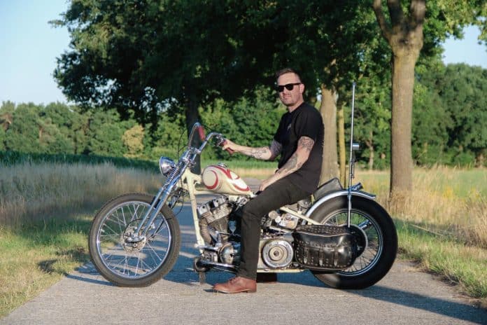 De basis was nu grotendeels klaar en het blok kon weer uit de swingarm gehaald worden. Vervolgens werd er een jaartje gereden met de hardtail in deze vorm om te controleren of er nog aanpassingen moesten worden gedaan. Laat het nu alleen net zo zijn dat Tim op dat moment tegen een felbegeerde Ratchet top 4-bak aanloopt. Een 60’s style chopper met suicide shift en direct schakelen op de bak past veel beter bij deze stijl, dus werd deze aangeschaft en in het frame gezet. Via een swapmeet werd een primaire kast gevonden die perfect past bij de stijl van de motor. Als finishing touch kwam een in hars gegoten paardenbloem als jockey shifterknob. Nu toch al van het oorspronkelijke idee werd afgeweken, keek Tim ook nog eens naar het achterwiel. In principe was alles pas gemaakt om het originele achterwiel met schijfrem te monteren. Tim’s zoektocht ging echter verder en er werd nu een hydraulische remtrommel gevonden die veel beter bij de stijl van de motor paste en ook nog eens zonder al te veel aanpassingen in het frame kon. Na alles pas gemaakt te hebben, werd de naaf naar Ralph gebracht om deze vakkundig te laten spaken. In plaats van 16” dan ook gelijk maar 18”, zodat de look helemaal af was.