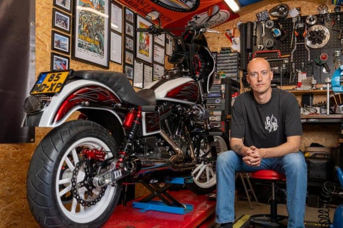 Het afstellen van de motor liet Jim over aan Gert-Jan Laseur in Almere. “Hij staat bekend als een van de besten op dat gebied”, vertelt Jim. “Zowel in de dragracewereld als via vrienden hoorde ik alleen maar goede verhalen, zeker als het gaat om afstellingen bij hoogteverschillen. Mijn Dyna was al eens afgesteld, maar de bougies waren nooit mooi koffiebruin. Tot Gert-Jan ermee aan de slag ging. Met zijn afstelling loopt de motor perfect, zonder een slag verkeerd en de bougies zijn nu precies zoals ze horen: mooi bruin.” Wat Jim het meeste waardeert, is dat alles legaal is. “De uitlaat is goedgekeurd, met de juiste dB-killer en afgesteld door Laseur. Ik dacht: wat heb je aan veel vermogen als je vooral op straat rijdt? Misschien één keer per jaar het circuit op, that’s it. Inmiddels zit er een XL-dB-killer in die iets luider is, maar nog steeds perfect. Rustig als je normaal rijdt, rauw en vol zodra je gas geeft. Vooral onder belasting klinkt hij fantastisch. Stationair hoor je vooral het blok, maar zodra je gas geeft, komt het karakter tot leven. Alles is goedgekeurd en de papieren zijn in orde. Ik wilde het netjes regelen, want in Nederland kun je al snel gedoe krijgen over geluid. Alles is CE- en TUV-gekeurd. Geluid blijft altijd een aandachtspunt, maar deze setup is gewoon legaal.”