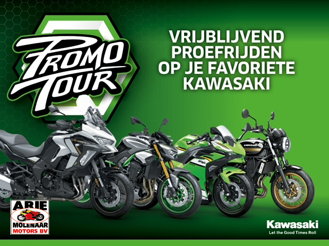 Meer weten over ons aanbod, de Kawasaki Promotour of onze acties? Kijk op www.ariemolenaarmotors.nl of loop gewoon even binnen. Tot snel!