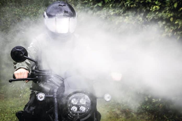 Voor de simulatie van een regenrit die onder alle omstandigheden voor elke combi gelijk moet zijn, neemt onze testredacteur plaats op een Honda Rebel, met een respectvolle afstand tot een hogedrukreiniger. De afstand is groot genoeg om het water met de nodige snelheid, maar zonder hoge druk op en over de regenpakken te spuiten. Alle testkandidaten moeten dezelfde tijd in de met water verzadigde ‘rijwind’ staan. Vervolgens worden ze voorzichtig binnenstebuiten gekeerd om de plekken op te sporen waar water naar binnen is gekomen.