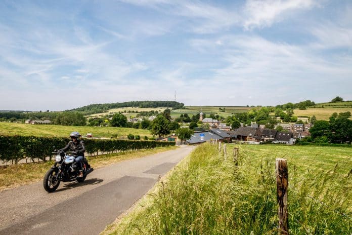 Het terrein boven Mechelen en de Kleine Geul is verrassend leuk. Alle bekende routes volgen de weg beneden, maar ik neem het alternatief binnendoor. Jackpot. De smalle wegen gaan omhoog, dalen af, blijven op hoogte en trakteren me telkens op een nieuw vergezicht. Ondertussen mag de Guzzi zich uitleven in overzichtelijke bochten die bij dit type motorfiets passen: niet te hoekig, niet te rond. Precies goed om een naked doorheen te jagen.