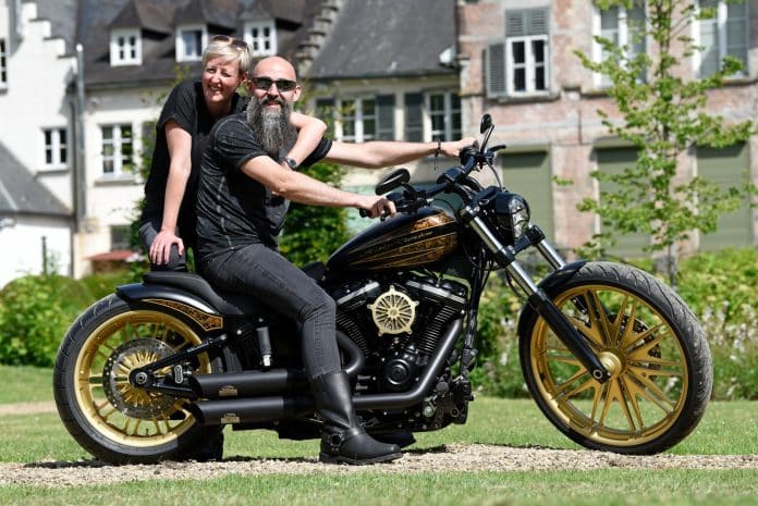 “Onze aandacht ging vooral uit naar een V-Rod, vanwege zijn gigantische achterband, maar helaas bleek deze mastodont niet meer in productie. Nadat zaakvoerder Timo onze wensen had doorgenomen, stelde hij een Breakout voor als mogelijk alternatief. Samen met Timo bekeken we de mogelijkheden voor een licht verbouwde Harley. Het overleg gebeurde na sluitingstijd en de exclusieve aandacht in een verlaten toonzaal zorgde voor een magisch effect. Tussen al die motoren voelden we ons als tieners in een gigantische speelgoedwinkel. Na enkele sessies brainstormen veranderde de bescheiden motor, die we voor ogen hadden, langzamerhand in een royaal verbouwde custom, waarvan zowat enkel nog het frame standaard bleef. De wisselwerking tussen ons en de Harley-dealer was uitstekend, want hij bouwde constant verder op onze wensen en opmerkingen. De zoektocht naar de juiste velgen bleek een moeilijk opstakel, want het aanbod is quasi oneindig. Uiteindelijk kwam onze focus op de artistieke combinatie van zwart- en goudtinten te liggen. Het verzoek om alle beschikbare goudkleurige velgen te showen, bezorgde Timo nogal wat stress en hij was opgelucht dat het Roland Sands assortiment aan onze wensen voldeed. Daar vonden we ook het luchtfilter dat het meest conform was met gewenste design. Alle chroom en glimmende onderdelen werden van een zwarte laklaag voorzien. Het handgemaakte zadel werd achteraan min of meer gestroomlijnd naar de ‘contouren’ van Isabelles zitvlak.”