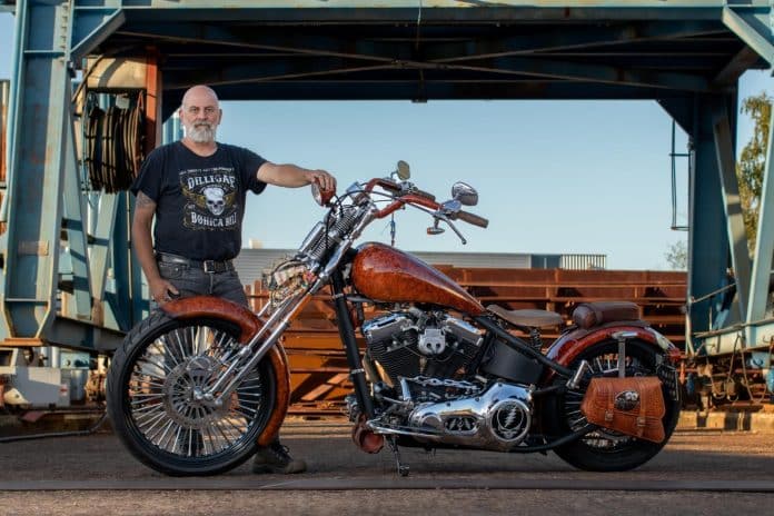 “Ik wilde een unieke paintjob en kwam uit bij mahoniehout. Het frame is gepoedercoat met een wrinkle structuur. De covers op het blok zijn van mijn favoriete rockband Grateful Dead. Aan de springervork zit een Mexicaans kleedje gebonden met een leren hondenriempje. Het kleedje is van mijn nicht Ellen geweest, die onlangs is overleden. Verder hoeft het niet allemaal nieuw te zijn. Zo zijn de bedieningsknoppen van een Shovel. De oliedrukmeter komt rechtstreeks hier uit het magazijn. De Big Spoke wielen laat ik langzaam roesten. Hij moet leven.”
