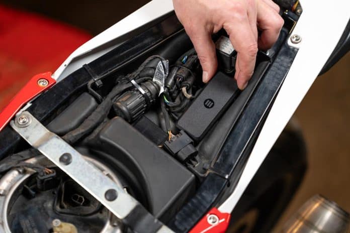Een vergelijkbaar systeem is de Datatool Stealth Tracker, die gebruikmaakt van GPS, Galileo en Glonass voor positiebepaling. En uiteraard heeft ’ie ook een app en een ADR-tag-keyfob. Als die niet in de buurt is, start de motor niet. Het heeft dus ook een eigen startonderbreker.