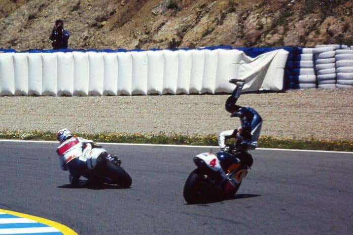 De beelden zijn bij veel motorsportfans bekend. In de laatste ronde van de 500cc-race van 1996 in het Spaanse Jerez was het publiek al massaal over de hekken geklommen en stond het letterlijk naast de baan toen Alex Crivillé en Michael Doohan het ‘stadiongedeelte’ in kwamen racen. De reden: Crivillé stond op het punt om zijn Repsol Honda-kopman Doohan te verslaan en de eerste Spaanse winnaar van de Grand Prix van Spanje in de 500cc te worden. Het Spaanse publiek was uitzinnig en zorgde voor een levensgevaarlijk tafereel in de tweede helft van het circuit. Crivillé had praktisch de hele race aan de leiding gereden en Doohan kon amper in zijn achterwiel blijven. Ook in de laatste ronde had de Spanjaard een klein gaatje. Maar juist in de bochten, waar het publiek op de baan en in de grindbak stond, vond Doohan weer de aansluiting. Wat een historische zege had moeten worden, eindigde in een drama. In de laatste bocht deed Doohan een ultieme aanval op zijn teamgenoot en die slaagde. Crivillé probeerde bij het uitkomen van de bocht te counteren, ging te vroeg op het gas en crashte met een flinke highsider. Doohan won en het publiek kon zonder Spaanse zege weer achter de hekken kruipen.