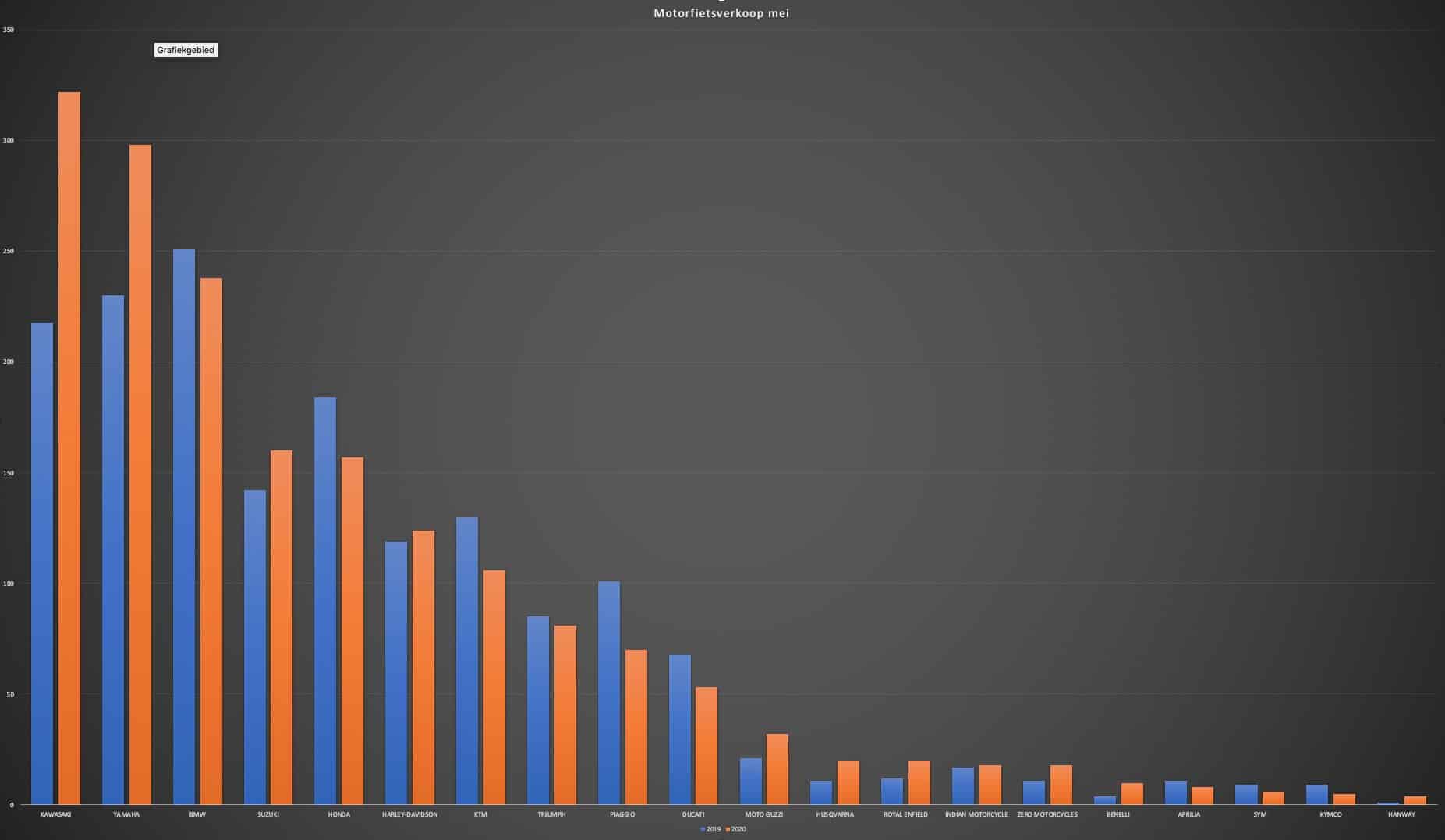 In mei werden 115 motoren meer verkocht dan in mei 2019. Kawasaki is koploper met 322 stuks (2019: 218), gevolgd door Yamaha (298/230) en BMW (238/251). De laatste lijkt zijn koppositie, die het een vol decennium claimde, definitief kwijt te zijn.