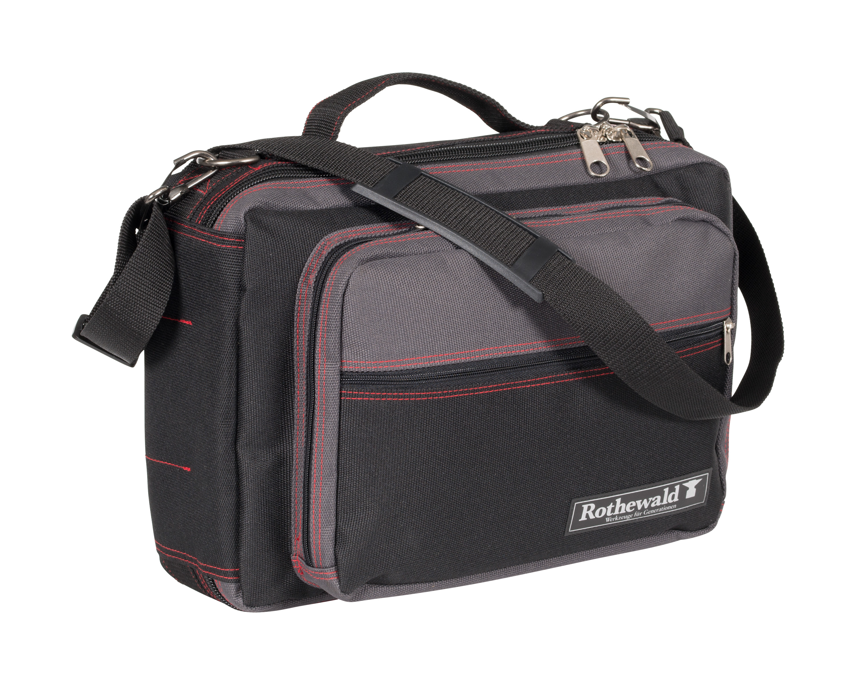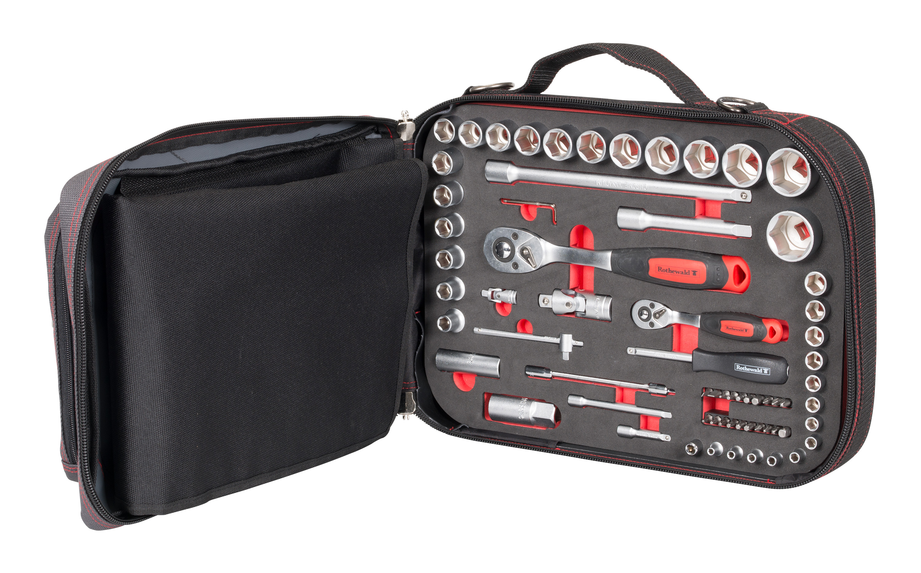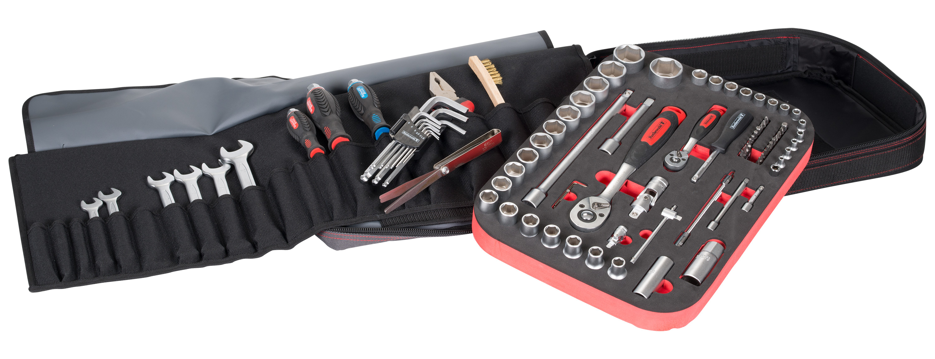 Qua maatvoering komt de Rothewald-gereedschapstas overeen met handzaam. De tas heeft de maten 35 x 45 x 15 cm. Standaard is de tas voorzien van een 68-delige dopsleutelset waarmee je grotere reparaties. Ook kun je er complexer sleutelwerk mee uitvoeren. De grote uitklapbare flap heeft veel insteekvakken. Daarin kun je een uitgebreid assortiment schroevendraaiers, steeksleutels, tangen, enz. opbergen. Voor extra hulpmiddelen zoals een spanningzoeker, tape, draad en kabelbinders is er voldoende plaats in het buitenvak. Daarin kun je ook de middelgrote momentsleutel kwijt. Ook heeft de tas nog een vak voor documenten, voor je onderhoudsmanual of het elektrische schema van je motor.