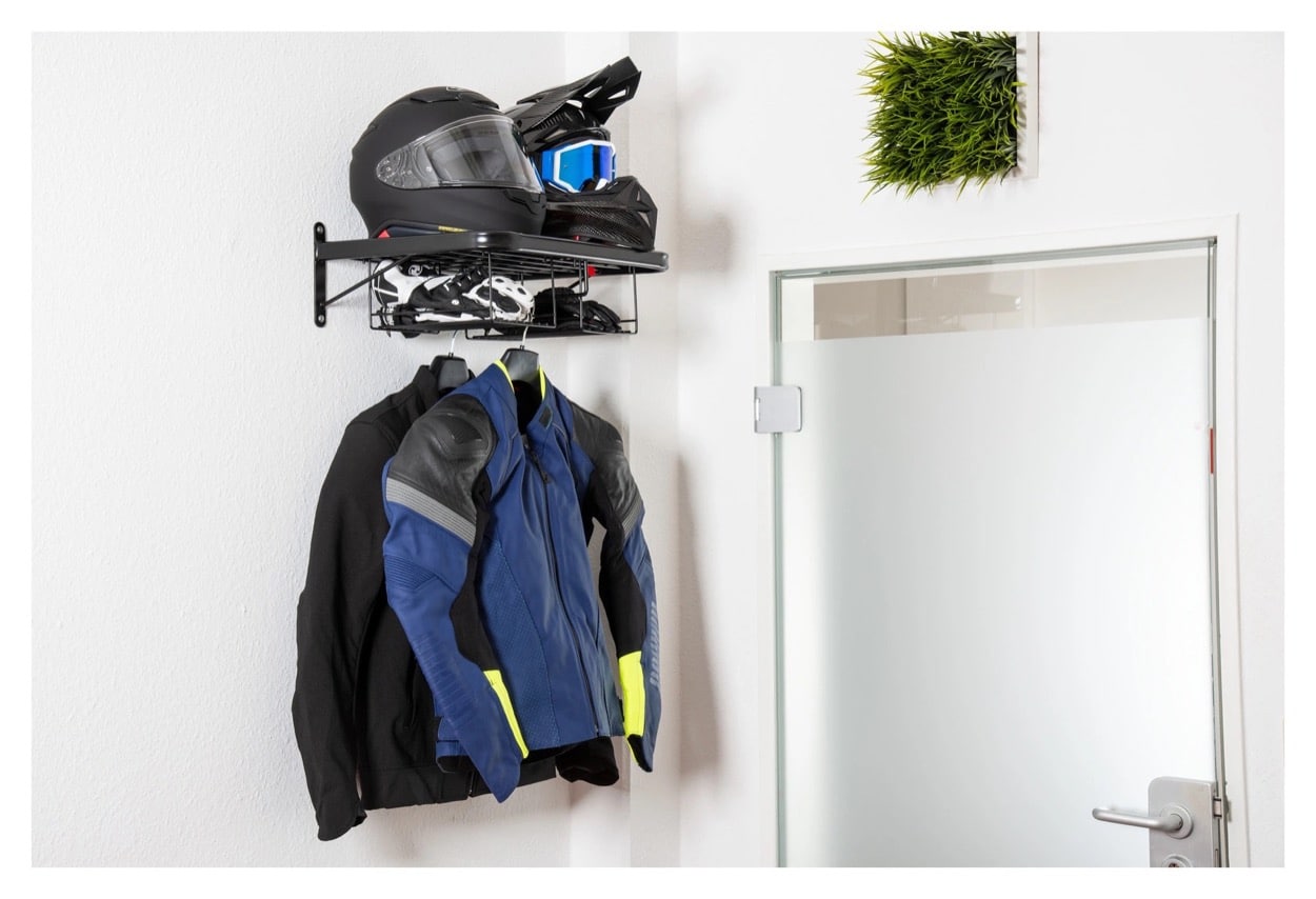 In de winter hangen motorrijders hun uitrusting vaak aan de spreekwoordelijke – en soms letterlijke – haak. Maar waarom het niet netter en overzichtelijker doen? Met deze Bikergarderobe Duo maak je van de uitrusting een toonbeeld van orde. Deze zwartstalen kleerhanger is robuust, biedt ruimte aan twee helmen, twee motorjassen/pakken, en in het handschoenenrek kan je makkelijk twee setjes kwijt.