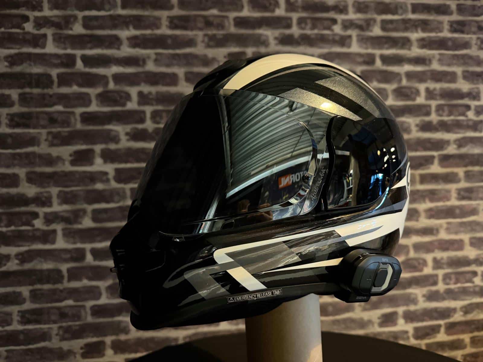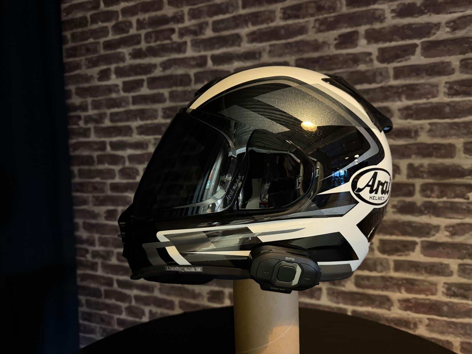 | Arai voegde een slimme extra toe: de Tour X5 Shield Holder. Deze vervangt de peak en maakt de helm visueel cleaner, met keuze uit zeven kleuren voor wie graag zijn eigen stijl laat zien. Tijdens langere ritten bleek bovendien dat het geluidsniveau merkbaar lager ligt dan met de standaard PRS-plaatjes. Een subtiele maar effectieve verbetering. |