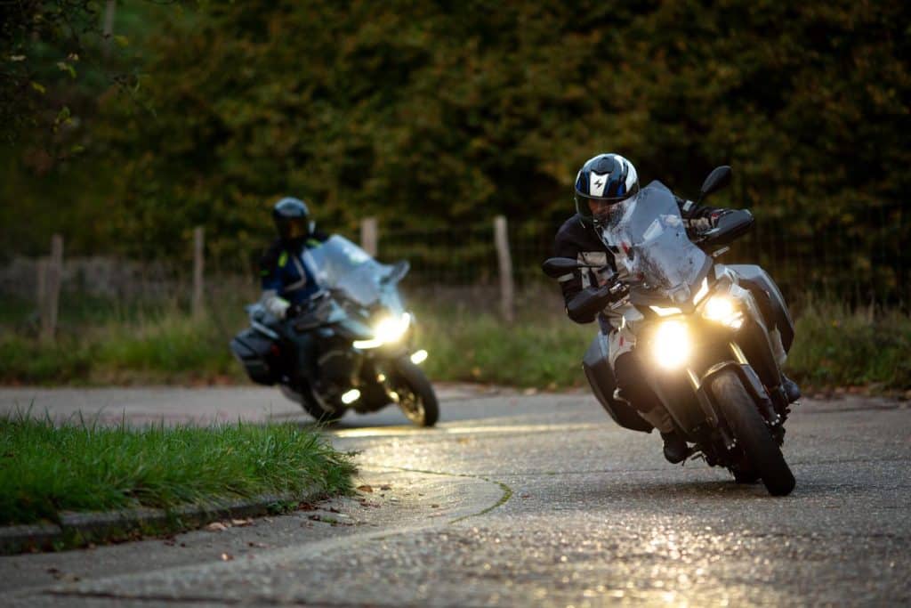Starten doen we op de Yamaha Tracer 9 GT. Een motor die we door en door kennen, zodat we ons optimaal op de verlichting kunnen concentreren. Het grote voordeel van het Yamaha-systeem is dat het automatisch wisselt tussen groot- en dimlicht. We zoeken voor deze test zo bochtig mogelijke wegen op met zo min mogelijk straatverlichting. Daarop blijft het grootlicht zo lang mogelijk aan, waardoor je dus zoveel mogelijk zicht hebt. Straatverlichting en reflectoren worden slim vermeden, maar ook bewegende verlichting – zoals van tegenliggend verkeer – krijgt geen grootlicht te verwerken als ze eenmaal dicht bij je zijn. Gedurende 90% van de tijd reden we op de middelste setting van het grootlicht, en dat werkte prima. Soms wil je dat het wat sneller reageert, een andere keer weer wat trager. Je denkt nog altijd sneller dan het systeem reageert, dus jij ziet een auto van verder aankomen dan de camera. Je wil dus dat het grootlicht sneller uitgaat en vooral sneller weer aan als de auto is gepasseerd. Op dat moment kom je soms in een donkere zone terecht waarin je moet wachten tot het grootlicht weer aanspringt. Dit is voor alle duidelijkheid op donkere, bochtige wegen. Op een normale, provinciale weg met straatverlichting heb je daar minder last van. In ieder geval kun je de automatische functie van het grootlicht steeds manueel overnemen met je linkerwijsvinger. Op het soort wegen waar wij getest hebben, was dat de betere optie.