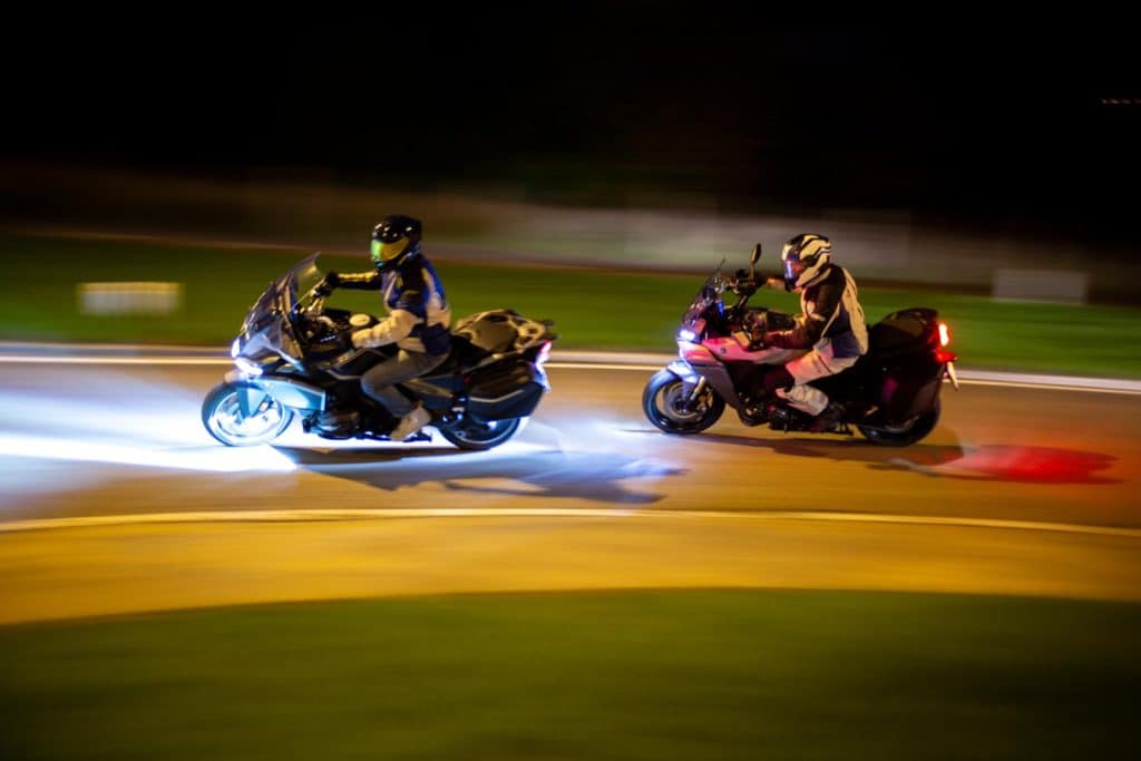 In tegenstelling tot de Yamaha is het op de BMW net wél. Het licht wordt exact daar geprojecteerd waar je het hebben wil, voldoende helder en sterk. Zo kun je diep in bochten kijken en dus met een steviger tempo rijden. Ook het overgooien van links naar rechts gaat vloeiender en sneller dan op de Yamaha, wat te maken heeft met het gebruikte systeem van beide fabrikanten: de mechanische servocorrectie van de BMW tegen de elektronische segmentatie van de Yamaha. We reden de BMW zonder en met mistlampen aan, waarbij je – logisch – nog een stuk meer lichtopbrengst dicht bij je hebt. Dat is vooral handig in korte bochten, omdat je daar ook minder ver kijkt. Op beide machines verloopt de lichtaanpassing bij stevig remmen en accelereren wonderwel. Het licht verandert nauwelijks van hoogte, wat een enorme extra veiligheid betekent.