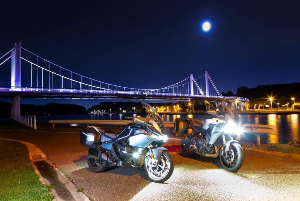 Het lichtsysteem van BMW ziet er niet alleen veel compacter uit, met maar één centraal ‘oog’ in plaats van twee keer drie ledsegmenten op de Yamaha; het werkt ook anders. Zo is er wel een knop om automatisch te switchen tussen DRL en dimlicht, maar geen automatisch grootlicht. Wil je dat gebruiken, dan moet je dat dus altijd manueel aan- en uitzetten. Op de Tracer waren we al onder de indruk van de lichtopbrengst, maar nu we op de BMW rijden, kunnen we eindelijk vergelijken. Laten we starten met het dimlicht. De lichtsterkte is op beide motoren prima voor elkaar, met een helder zicht en een duidelijke verbetering ten opzichte van oudere systemen. Het verschil zit hem in het lichtveld. De Tracer straalt als het ware meer vooruit, terwijl de verlichting van de BMW een breed lichtveld voor je uitwerpt. Met beide systemen kun je even ver kijken, maar de RT voegt daar nog wat extra breedte aan toe.