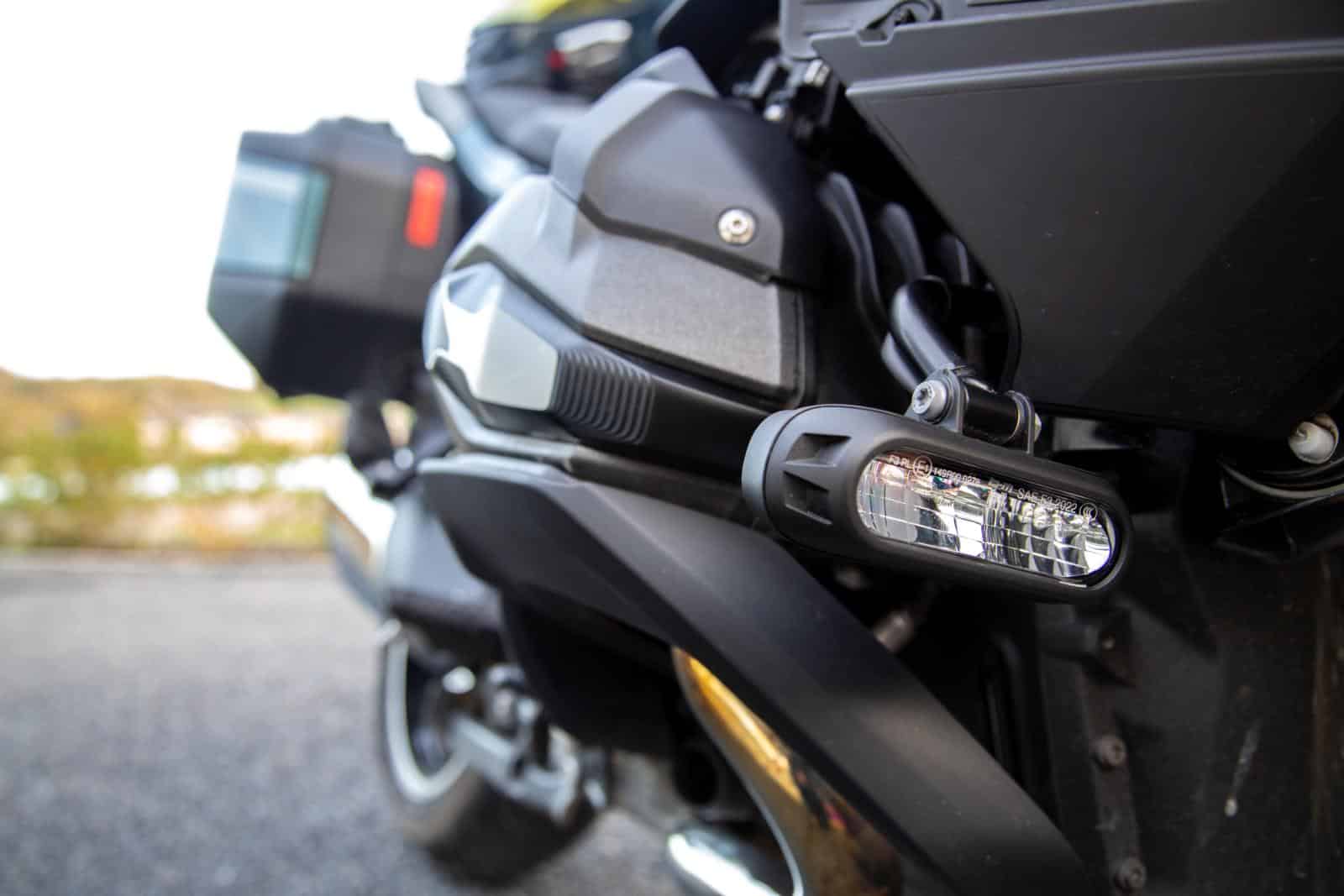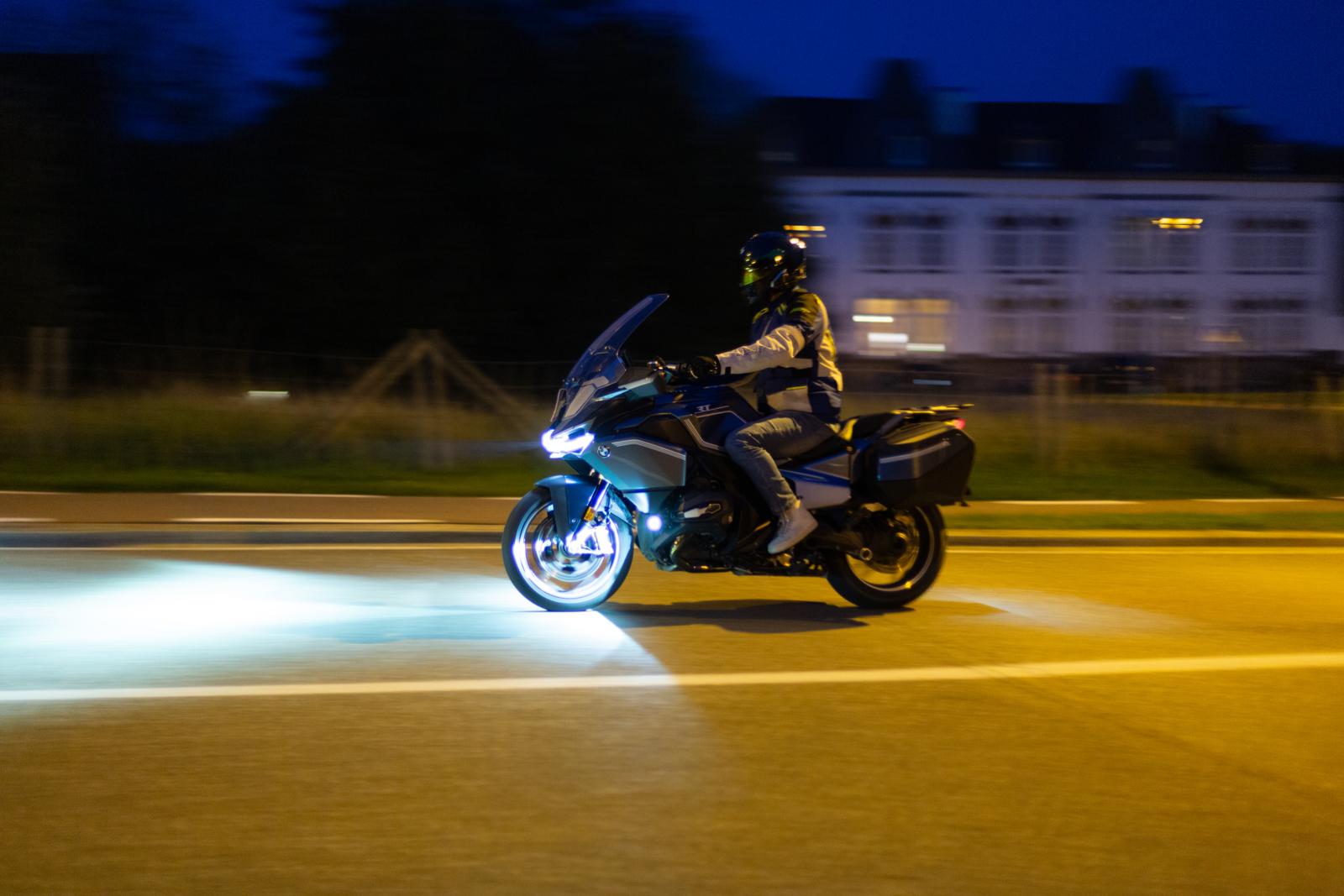 Het lichtsysteem van BMW ziet er niet alleen veel compacter uit, met maar één centraal ‘oog’ in plaats van twee keer drie ledsegmenten op de Yamaha; het werkt ook anders. Zo is er wel een knop om automatisch te switchen tussen DRL en dimlicht, maar geen automatisch grootlicht. Wil je dat gebruiken, dan moet je dat dus altijd manueel aan- en uitzetten. Op de Tracer waren we al onder de indruk van de lichtopbrengst, maar nu we op de BMW rijden, kunnen we eindelijk vergelijken. Laten we starten met het dimlicht. De lichtsterkte is op beide motoren prima voor elkaar, met een helder zicht en een duidelijke verbetering ten opzichte van oudere systemen. Het verschil zit hem in het lichtveld. De Tracer straalt als het ware meer vooruit, terwijl de verlichting van de BMW een breed lichtveld voor je uitwerpt. Met beide systemen kun je even ver kijken, maar de RT voegt daar nog wat extra breedte aan toe.