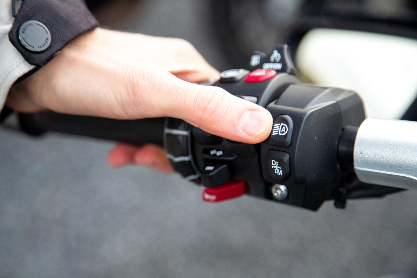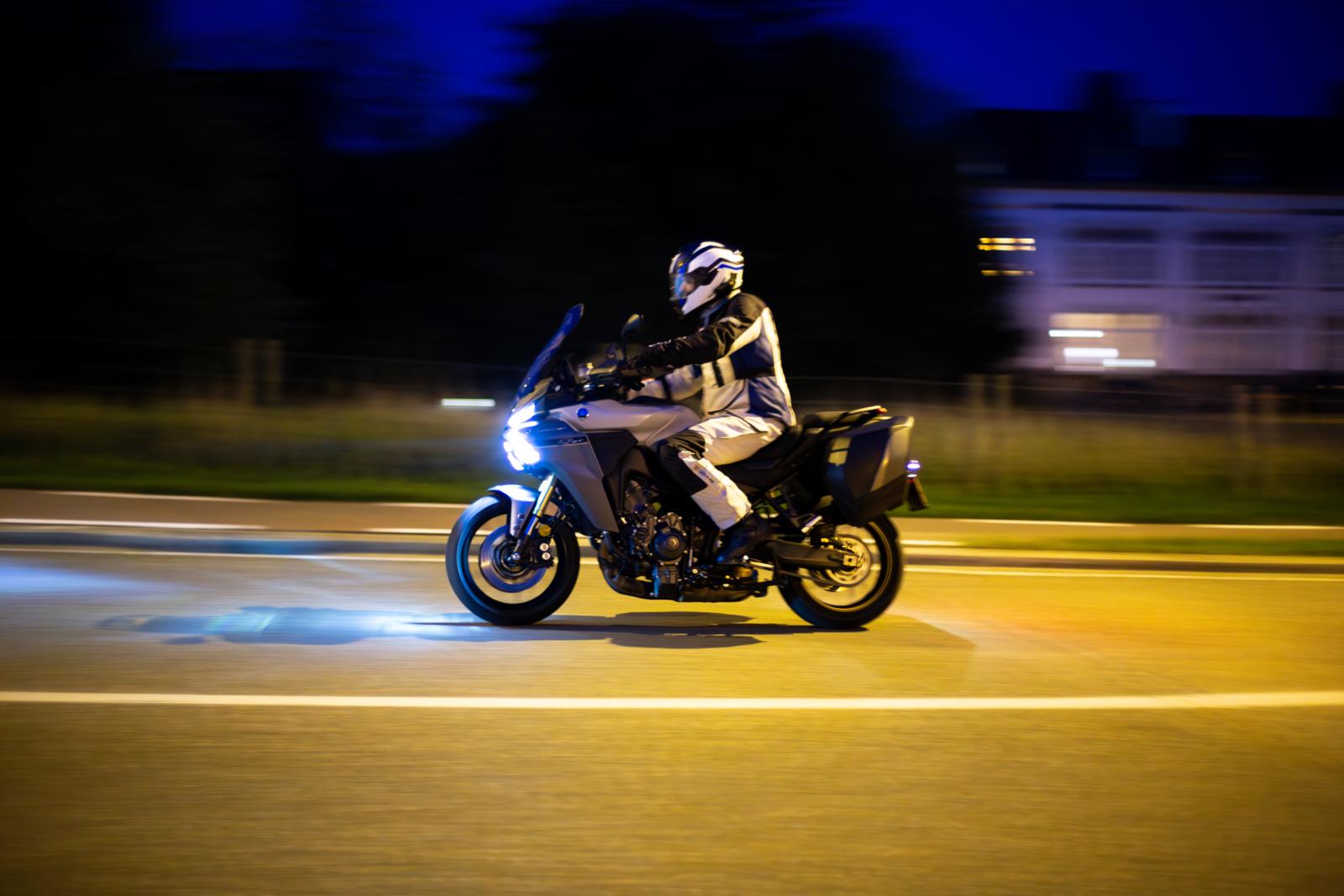 Starten doen we op de Yamaha Tracer 9 GT. Een motor die we door en door kennen, zodat we ons optimaal op de verlichting kunnen concentreren. Het grote voordeel van het Yamaha-systeem is dat het automatisch wisselt tussen groot- en dimlicht. We zoeken voor deze test zo bochtig mogelijke wegen op met zo min mogelijk straatverlichting. Daarop blijft het grootlicht zo lang mogelijk aan, waardoor je dus zoveel mogelijk zicht hebt. Straatverlichting en reflectoren worden slim vermeden, maar ook bewegende verlichting – zoals van tegenliggend verkeer – krijgt geen grootlicht te verwerken als ze eenmaal dicht bij je zijn. Gedurende 90% van de tijd reden we op de middelste setting van het grootlicht, en dat werkte prima. Soms wil je dat het wat sneller reageert, een andere keer weer wat trager. Je denkt nog altijd sneller dan het systeem reageert, dus jij ziet een auto van verder aankomen dan de camera. Je wil dus dat het grootlicht sneller uitgaat en vooral sneller weer aan als de auto is gepasseerd. Op dat moment kom je soms in een donkere zone terecht waarin je moet wachten tot het grootlicht weer aanspringt. Dit is voor alle duidelijkheid op donkere, bochtige wegen. Op een normale, provinciale weg met straatverlichting heb je daar minder last van. In ieder geval kun je de automatische functie van het grootlicht steeds manueel overnemen met je linkerwijsvinger. Op het soort wegen waar wij getest hebben, was dat de betere optie.