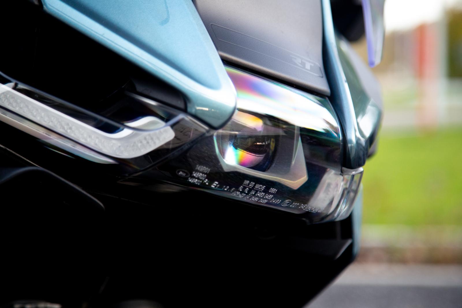 De BMW R 1300 RT wordt standaard al uitgerust met een volledige ledkoplamp, opgebouwd uit een multisegmentmodule voor dim- en grootlicht en aangevuld met dagrijlichten links en rechts van de behuizing. Maar het Duitse merk biedt ook de optie ‘Koplamp Pro’ (€508) aan, dat actief het lichtbeeld aanpast aan de rijomstandigheden. De kern hiervan is een uitbreiding van het aantal ledelementen in de matrix, gecombineerd met een servomotor die de verticale uitlijning dynamisch corrigeert. Deze zogeheten ‘pitchcompensatie’ vangt het duiken bij remmen en het heffen bij accelereren op: tot 1,5° correctie richting omhoog en tot 3,5° omlaag. Het resultaat is een constant optimale afsnijlijn, ongeacht belading, helling of rijstijl. Daarnaast ondersteunt Koplamp Pro een adaptieve bochtverlichtingsfunctie. Wanneer de motor onder hellingshoek wordt gereden, worden extra ledsegmenten geactiveerd om het licht met de rijder mee de bocht in te laten draaien.