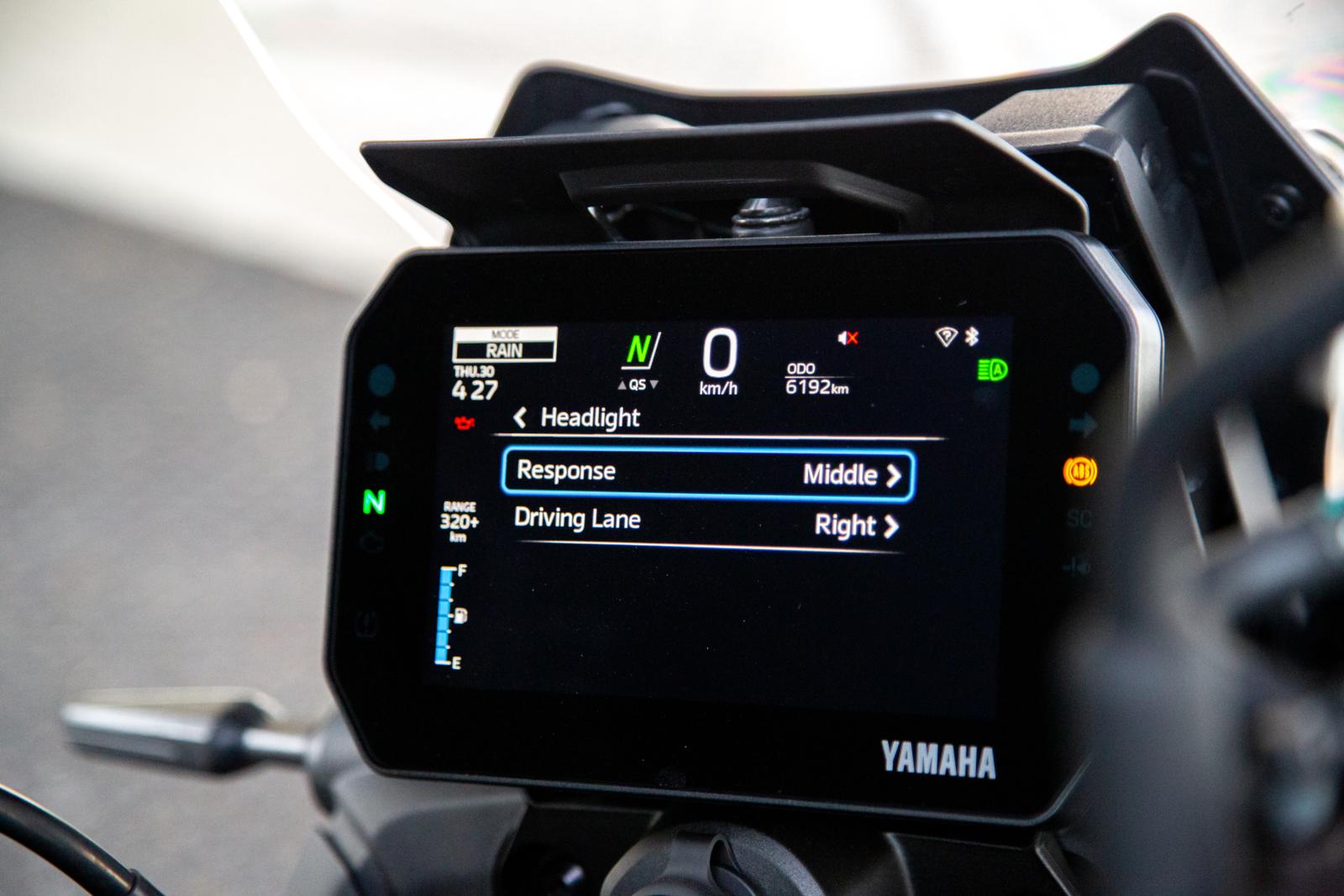 Een tweede cruciaal element is de zesassige IMU die Yamaha ook voor de rijhulpsystemen gebruikt. In dit geval maakt de koplamp gebruik van de IMU-data om hellingshoeken nauwkeurig te detecteren. Zodra de motorfiets meer dan 7° overhelt, verschuift de lichtbundel richting de binnenkant van de bocht. Hierdoor schijnt het licht niet verloren naar voren, maar volgt het de lijn die de rijder instuurt. De ECU vormt hierin de schakelcentrale van het geheel. Op basis van camerabeelden, IMU-data en de rijomstandigheden beslist de ECU welke ledsegmenten worden geactiveerd en hoe intens. Dat maakt het systeem niet alleen adaptief, maar ook verfijnd. Zo kan bij mist de bundel bijvoorbeeld worden verbreed en gedempt, terwijl bij tegenliggers bepaalde segmenten selectief worden uitgeschakeld om verblinding te vermijden. Het is dus perfect mogelijk om continu met het grootlicht aan te rijden, omdat het automatisch dempt bij een tegenligger. Yamaha voorziet drie gevoeligheidsniveaus, die op elk moment kunnen worden aangepast. Zo kan de verlichting worden afgestemd van traag tot snel reageren op bijvoorbeeld koplampen van een tegenliggend voertuig.