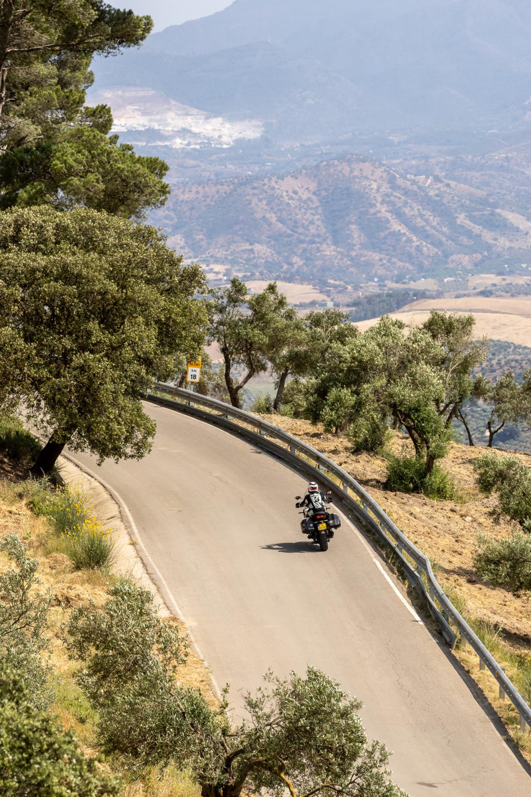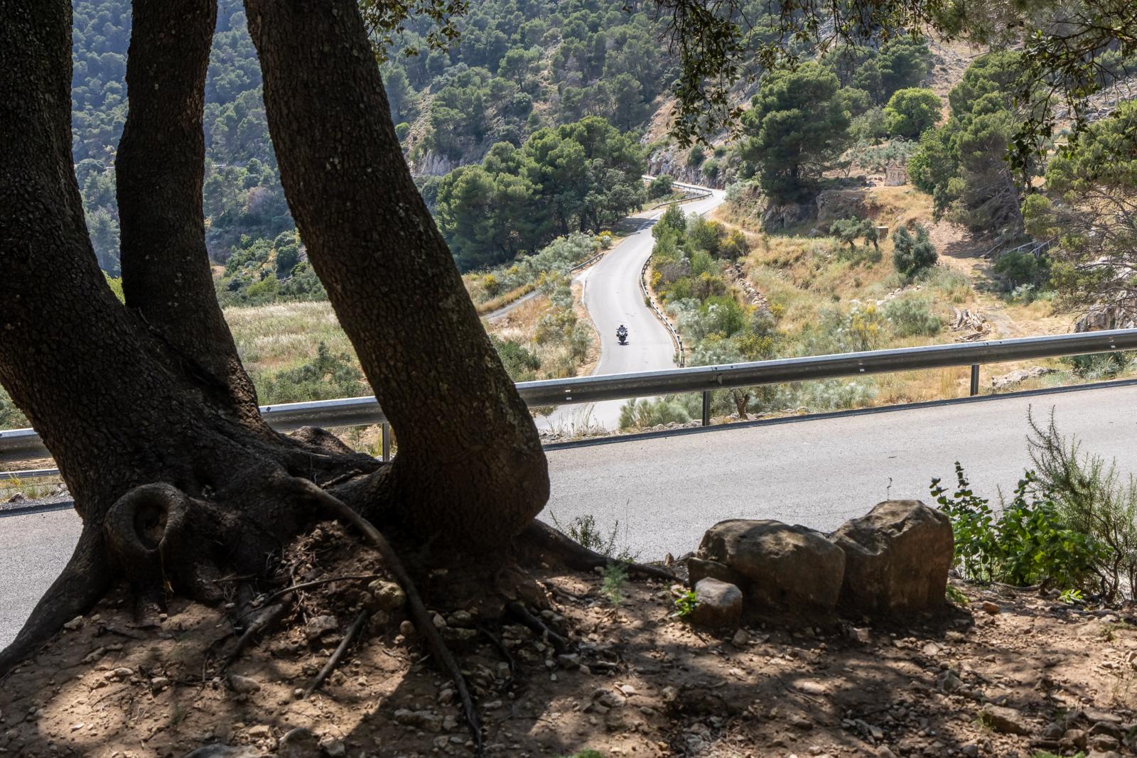 De routes tussen Malaga en Tarifa, via Ronda, liggen wellicht in de grootste speeltuin die je als motorrijder in Europa kan vinden, met de laatste 90 kilometer nauwelijks een recht stuk. We nemen al die bochten vlot en laten de zin om de volgende zo snel mogelijk te bereiken varen. Maar Manu houdt het tempo alsnog niet bij en probeert zijn broodje Vueling achter de kiezen te houden op deze geasfalteerde rollercoaster. Uiteindelijk bewaren we Tarifa voor de volgende ochtend en houden voor de nacht halt in Torreguadiaro, verlekkerd door de lokale bikerbar en een hotel aan de overkant.