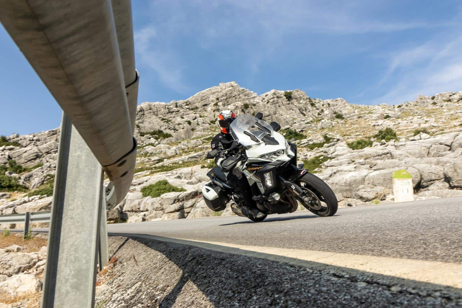 Na een overnachting in Anglet bij Biarritz is de missie voor etappe 2 om voorbij Madrid te raken in een zo weinig mogelijk rechte lijn. De TomTom stippelt zelf een kronkelroute uit en wij zijn vastbesloten er het beste van te maken. De wegen liggen er in de ochtend nog wat vochtig bij, maar de T33’s kwijten zich uitstekend van hun taak. En de Versys 1100 evenzeer. We laten hem in ‘Sport’-modus staan en gebruiken die om zo gedoseerd mogelijk gas te geven op hellingshoek. De Kawasaki volgt daarin gedwee, inclusief quickshifter die ervoor zorgt dat we uitkomend uit de bochten heerlijk vaak kunnen shortshiften. We doen het om de acceleratie en snelheid op te bouwen op hellingshoek, en het midden van de achterband zoveel mogelijk te sparen. Het is een aparte manier van rijden die wat extra concentratie vraagt, maar het werkt. En bij een tussenstop lijken de banden dat zeer te waarderen.