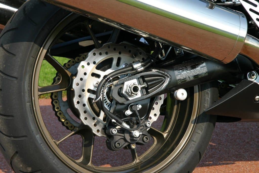 Is de eerste indruk goed, dan kun je de motor technisch gaan inspecteren. Zet de motor op de middenbok of de zijstandaard en laat een vriend(in) de wielen los van de grond trekken. Draai aan de wielen en controleer of ze soepel draaien en of er geen slingering in de velg zit, die aangeeft dat de velg een tik heeft gehad. Controleer de velg ook op scheuren en tik bij spaakwielen op de spaken om te kijken of ze allemaal hetzelfde klinken. Klinkt er een lager, dan zit die los. Dat hoeft geen ramp te zijn, maar het moet wel gesteld worden. Kijk ook meteen of er geen scheuren in de velg zitten; bij oude spaakwielen willen er rond de spaken wel eens scheurtjes ontstaan. Let bij het draaien ook op de remschijf: als die onregelmatig tegen de blokken aanloopt, is de schijf krom en moet je ze vervangen. Dat is duur.