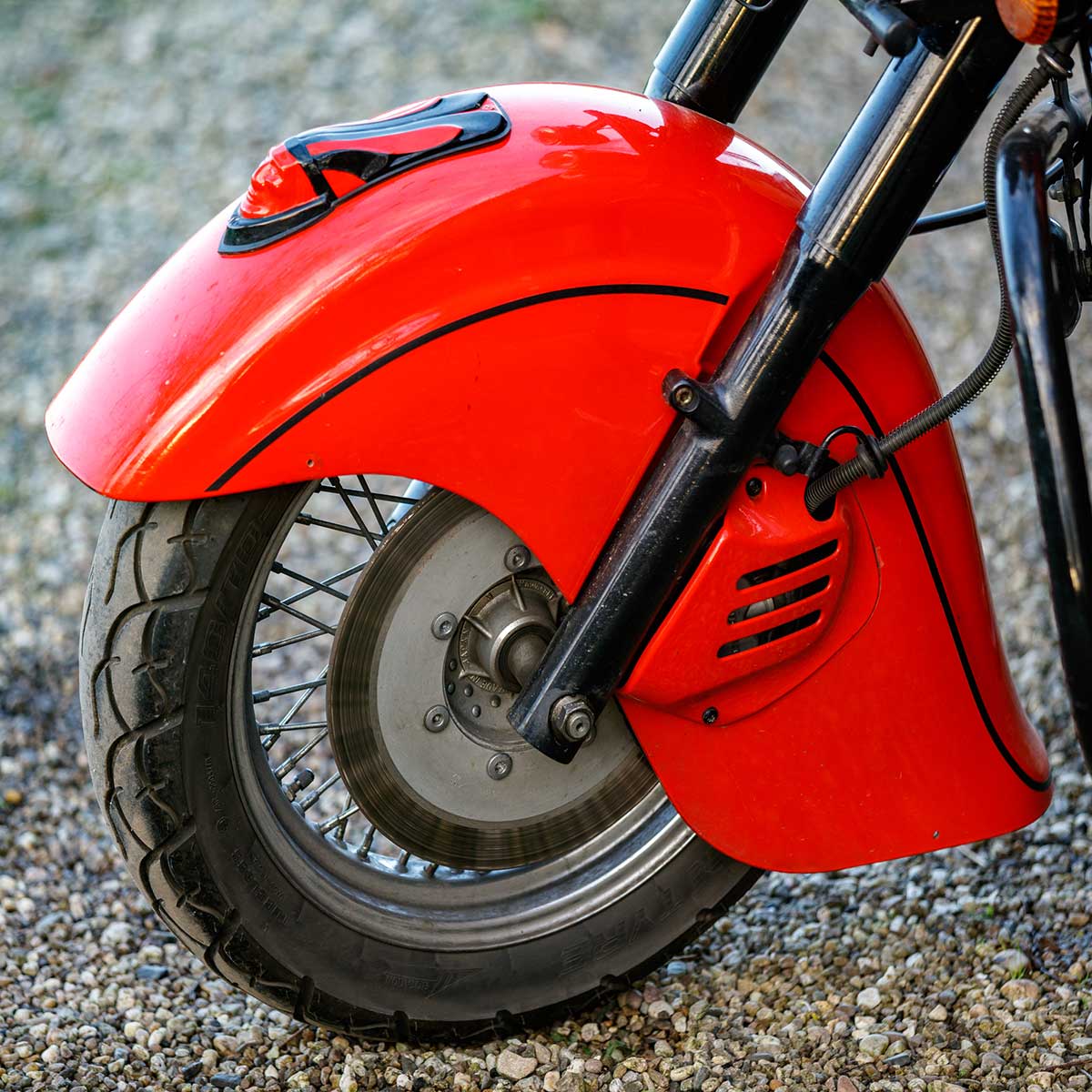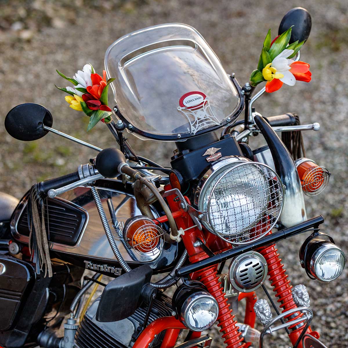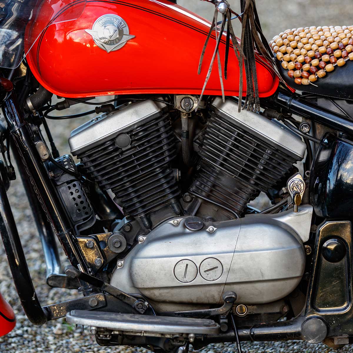 Tegenwoordig gaat het er tam aan toen. Dagelijks ritje met de Jawa-Velorex zijpanscombinatie naar de glasbak, en terug naar huis met boodschappen in het bakkie. En voor het echte toeren is er de Kawasaki Drifter. Zeker weten dat deze Japanse Indian-kloon hoog genoteerd staat in slechtst verkopende motorfietsen in ons land. Maar Henk is er zo tevreden mee, dat hij er twee van heeft. ‘Ontspannen rechtop zitten, een zadel als een fauteuil en treeplanken als een vrachtauto. En met zijn korte slag technisch stukken beter dan een Harley of Indian.’
