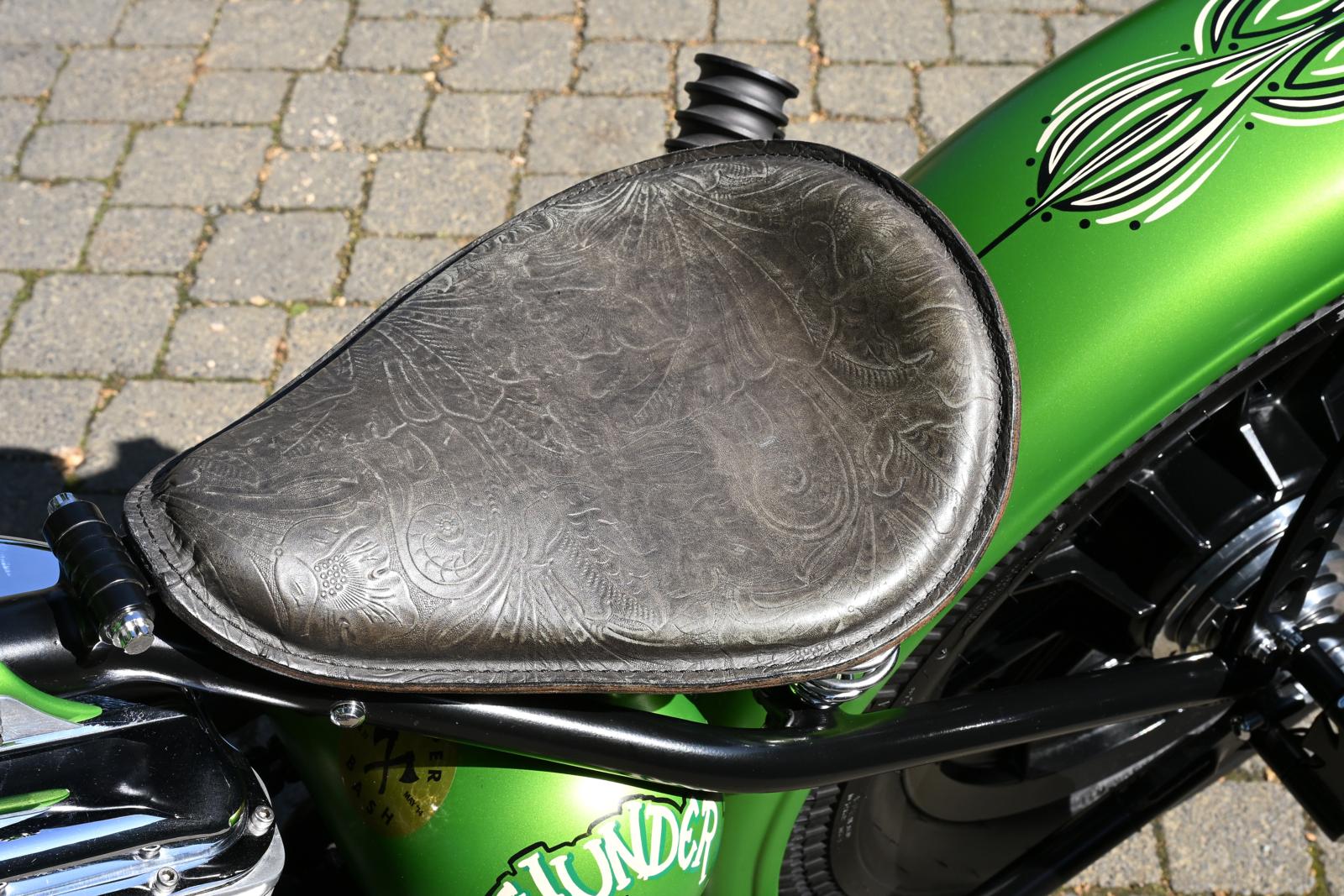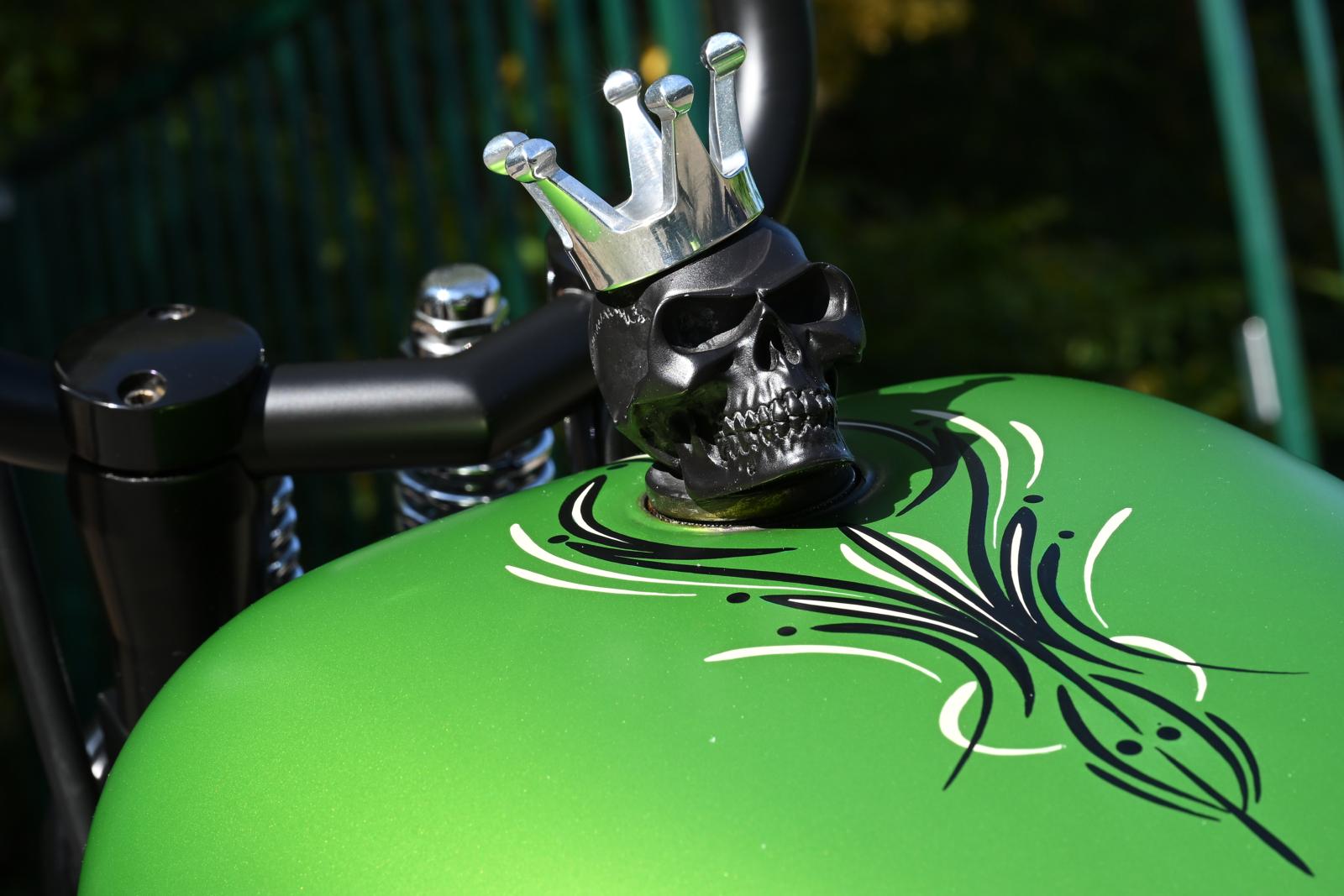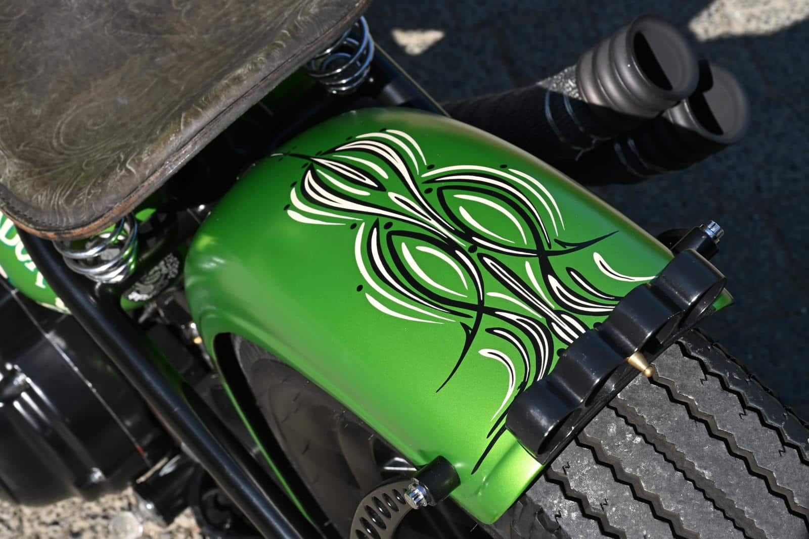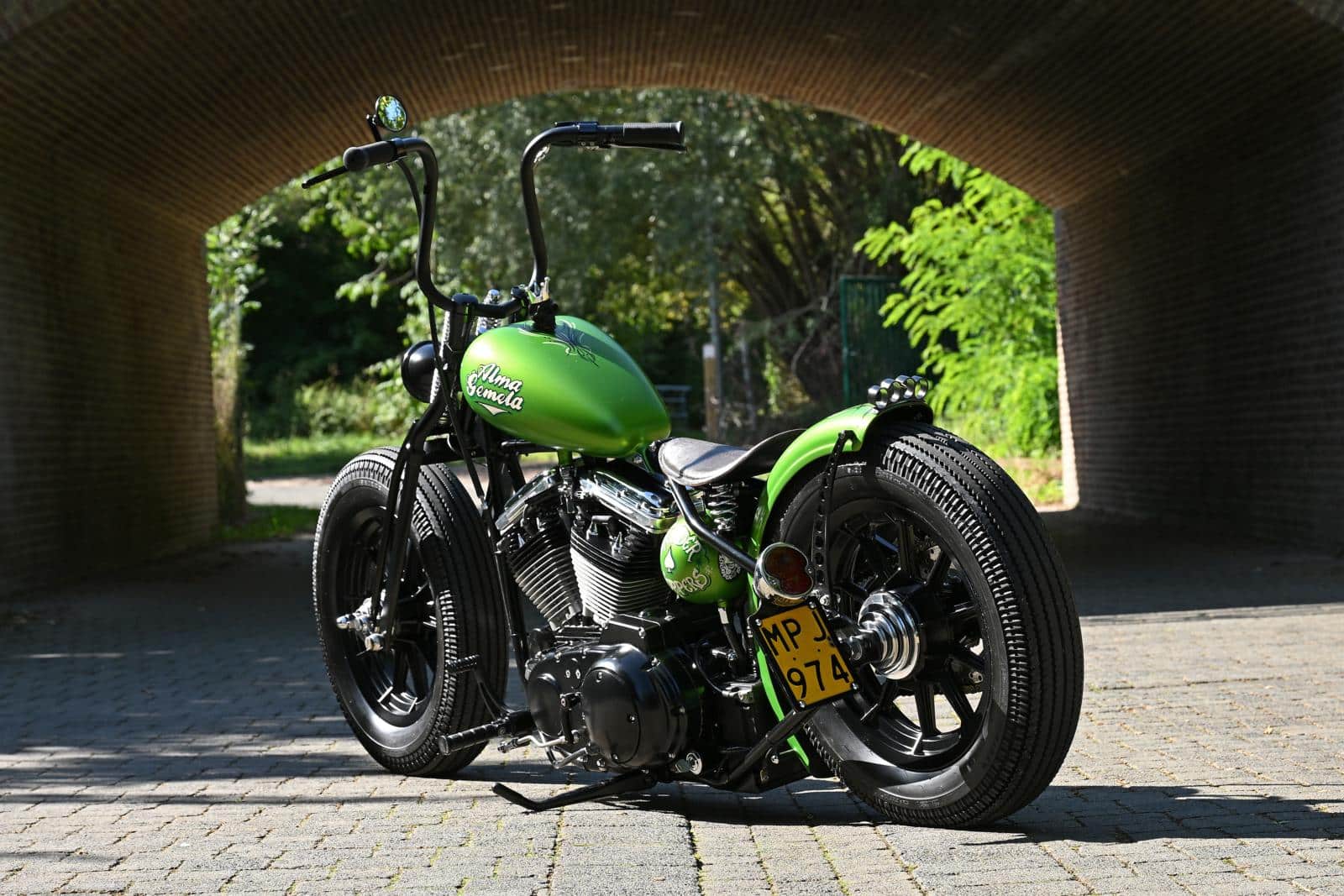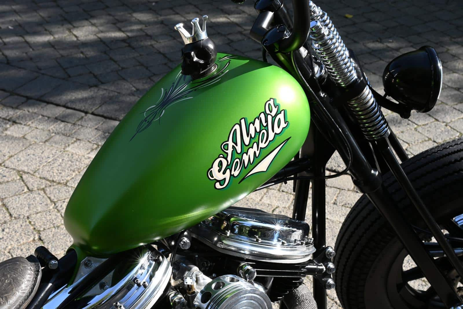 Marino vertelt verder: “Vanaf de voltooiing in 2009 heb ik tot twee jaar geleden veelvuldig op het choppertje gereden. Het merendeel van de kilometers zijn in Zuid-Frankrijk afgelegd. Daar ga ik regelmatig op bezoek bij een vroegere stadsgenoot en telkens neem ik het hardtailtje mee in de camionette. Het is er machtig rondploffen, want de wegen zijn er in vergelijking met het roemruchte Belgische ruïneasfalt, veel egaler. Ginds kan het machientje, met zijn compacte afmetingen en zeer laag geconstrueerde zitpositie, zijn potentieel ontplooien. Dat maakt mijn verblijf er telkens tot een ongelooflijk toffe congéperiode. Voor het thuisfront en om wat meer comfort te hebben, heb ik me twee jaar geleden een FXR uit 1993 aangeschaft. Het choppertje staat dus meestentijds stil. Toch haal ik hem tussendoor af en toe eens buiten om hem in conditie te houden. Hij is naar mijn goesting gecustomized en ik wil hem in deze staat behouden. Omwille van zijn emotionele achtergrond blijf ik het choppertje fanatiek koesteren. Wellicht zal hij levenslang bij mij blijven. El Cheapo deed het groen metallic spuitwerk. De matte vernis eindlaag wijkt enigszins af van de traditionele, blinkende laklagen. Tegenwoordig is matte lak populair, maar vroeger zag je dat niet zo veel. Op het moment dat ik de motor aan het bouwen was kwam hier regelmatig iemand langs met Spaanse roots. Hij heeft het woordje zielsverwant of soulmate voor mij in het Spaans vertaald. De gepainte ‘Alma Gemela’ op de tank houdt zodoende de nagedachtenis aan mijn overleden makker overeind. Sommigen vragen zich af wat het betekent, maar voor mij zijn het geen loze woorden of een of andere populistische spreuk. Het is helaas onverbiddelijk, persoonlijk sentiment.”