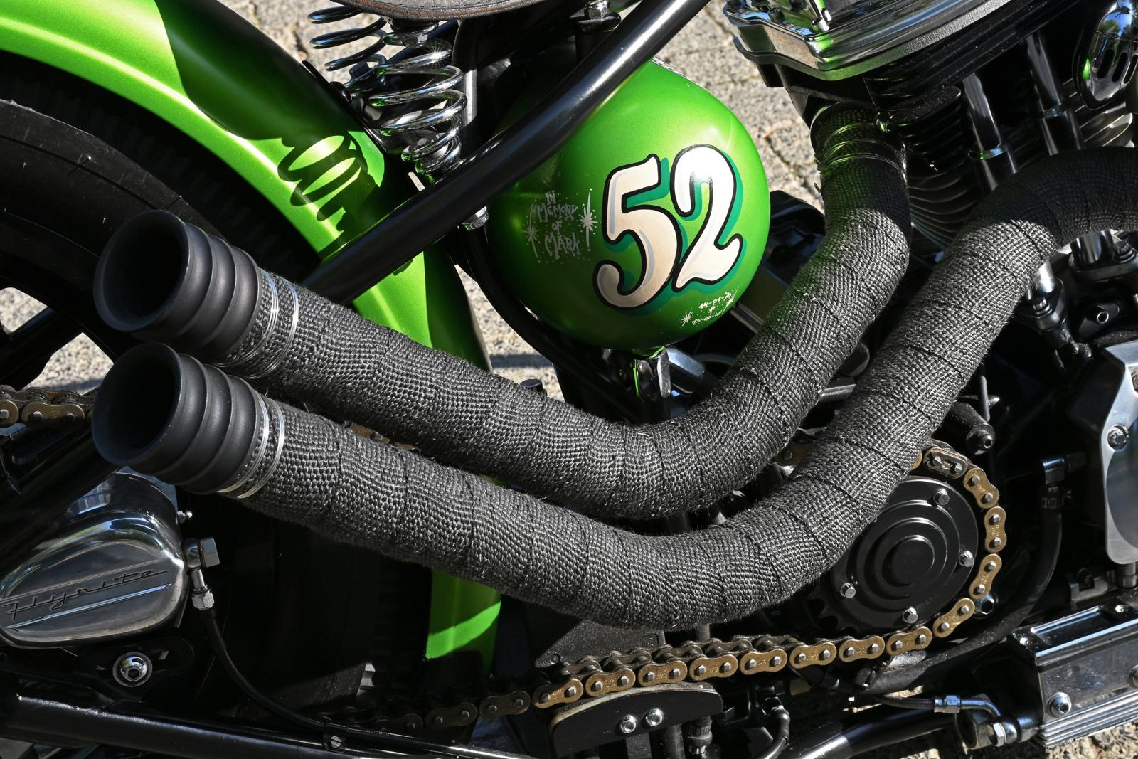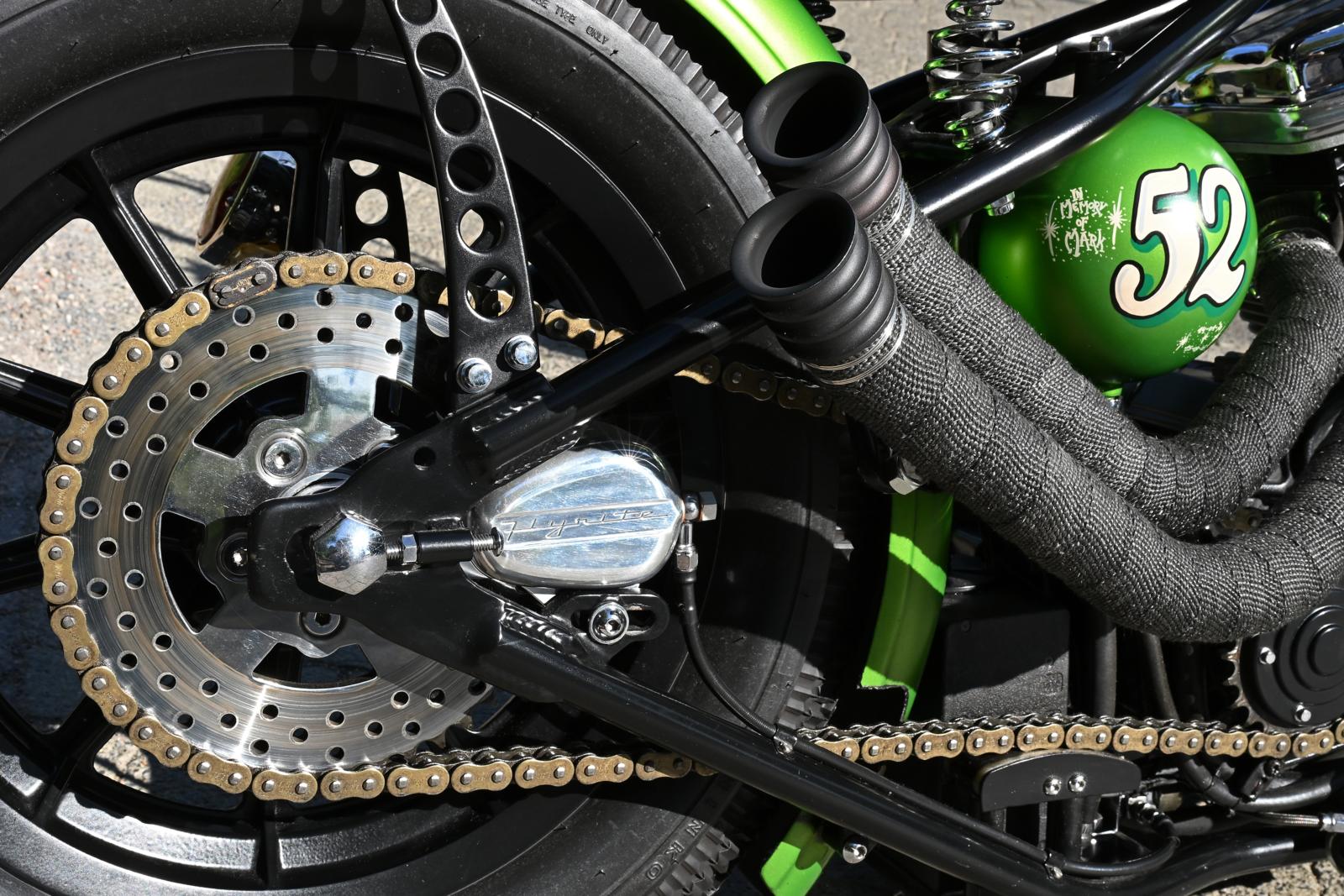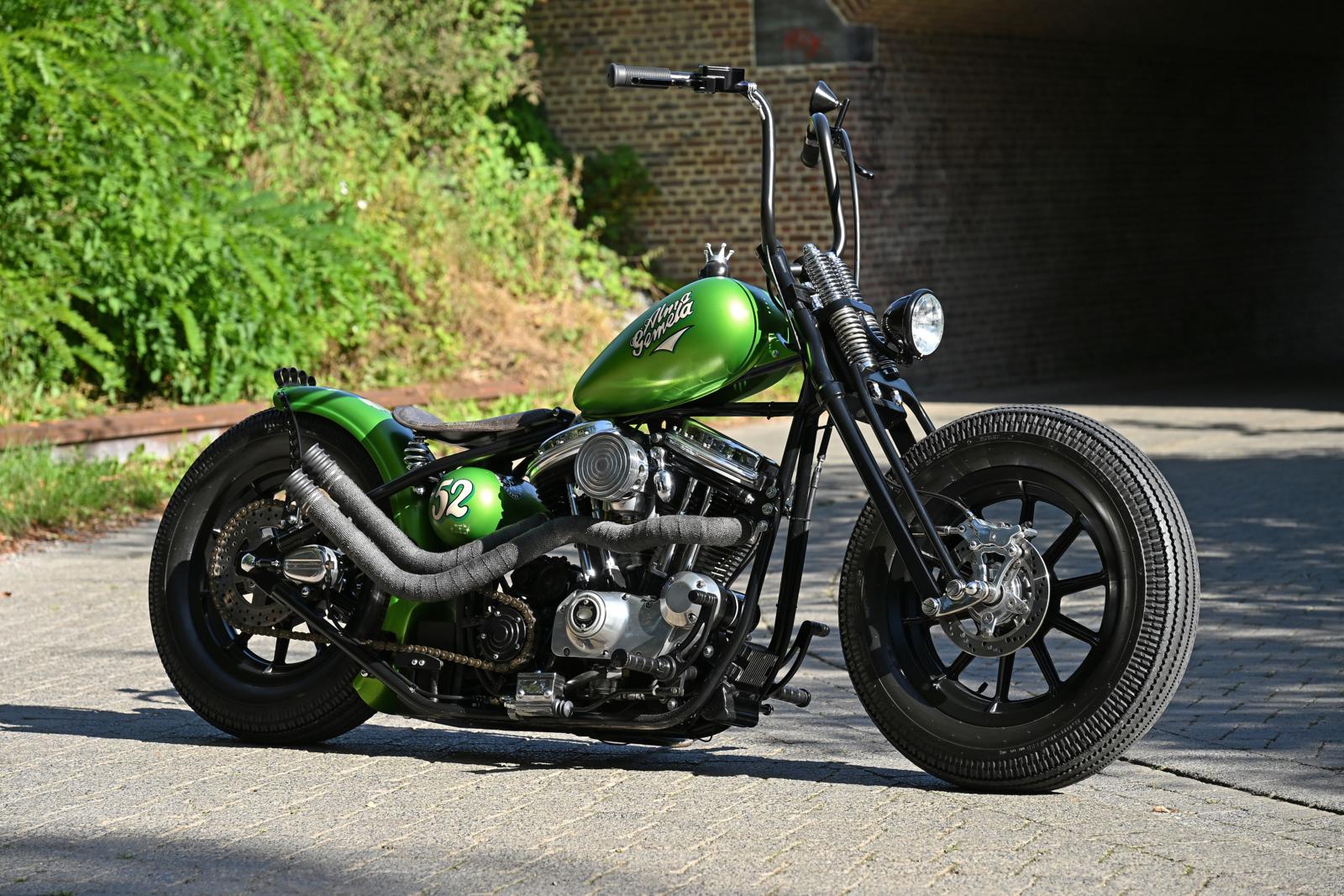 Meewarig vertelt Marino verder: “De Sportster behoorde eigenlijk toe aan een makker waar ik vroeger regelmatig mee optrok. Hij was als elektricien tewerkgesteld, maar door een verkeerde kabel door te knippen is hij tijdens zijn dagtaak schielijk overleden op 35-jarige leeftijd. Na het ongeval besloten zijn ouders de motor van hun enige zoon als aandenken te bewaren. Ik ben steeds contact blijven houden met die mensen en na een tweetal jaar heb ik hun gevraagd of ze niet bereid waren om het machientje aan mij te verkopen. Zo kon ik de motor rijdend en de gedachtenis aan mijn kameraad in ere houden. Dat vonden ze een goed idee en ze zijn akkoord gegaan met het voorstel. Als ultiem respect heb ik door El Cheapo het badgenummer 52 van mijn gemiste spitsbroeder op de selfmade olietank laten painten. Bij aankoop was de XL slechts bescheiden verbouwd, want op een set andere wielen na stond de machine nagenoeg standaard. Ik wou er graag iets speciaals uit brouwen en heb er een hardtail project van gemaakt. Het V-twin blokje bleek tijdens een inwendige controle nog perfect in orde te zijn. Daar ben ik grotendeels afgebleven. Enkel door Exotic Panhead rocker covers te monteren is de look lichtjes gewijzigd.”