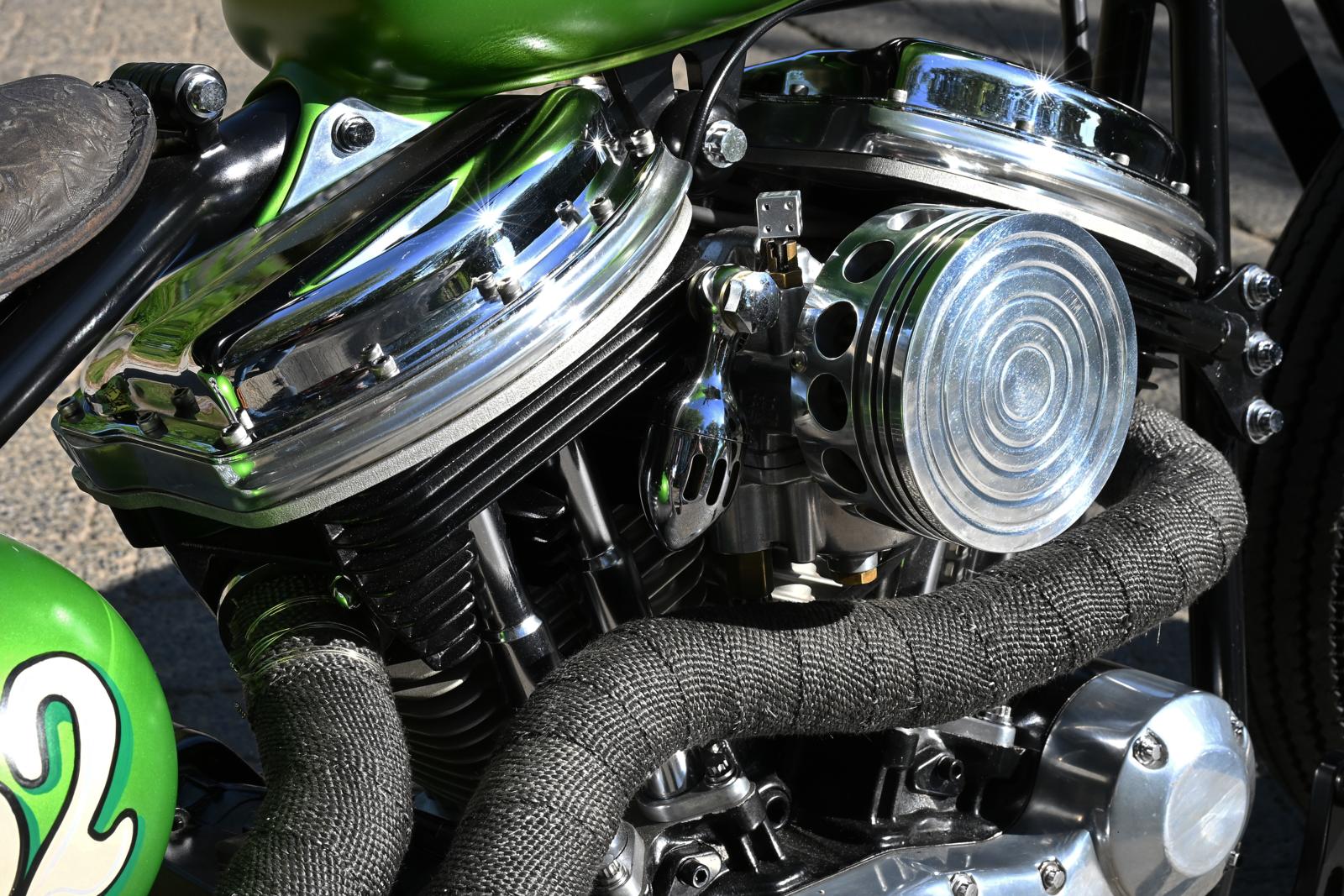 De courant gebruikte frames voor Sportster choppertjes vielen volgens Marino te wijd uit. Hij is een fervent voorstander van slanke, compacte frames waar alles net gepast tussenin schuift. “Het idee om een hardtail frame van Flyrite Choppers te gebruiken kwam tot stand tijdens een bezoekje aan de Daytona bikeweek”, verklapt de customizer. “Op dat evenement heb ik ontzettend schoon materiaal gezien en het was tevens een uitgelezen moment om er interessante spullen op de kop te tikken. Accessoires van Flyrite Choppers zijn in onze contreien immers nauwelijks gekend. De lasnaden van het frame heb ik wel nog moeten effen slijpen en keurig glad zetten. Het gecombineerde roestvrijstalen remschijf/tandwiel achteraan werd geassembleerd bij dezelfde Amerikaanse toeleverancier. De luchtfilter is op de draaibank gedraaid uit één blok aluminium. Het heeft de vorm van een piston, inclusief de groeven voor de zuigerveren. De wielen, waarvan ik de zijkanten afgefreesd heb, zijn van een Electra uit de jaren ’90. Het Dyna achterspatbord werd verzaagd en aangepast aan de hoekige vorm van de klassieke Shinko banden die de vintage look extra accentueren. De stangen van de Paughco springervork zijn rond gemaakt, want de originele geblokte structuur vond ik niet zo mooi. Eerst had ik er een vrij hoge apehanger op staan, maar die heb ik onlangs een tikkeltje ingekort. Daardoor ligt de machine thans wat beter in de hand.”