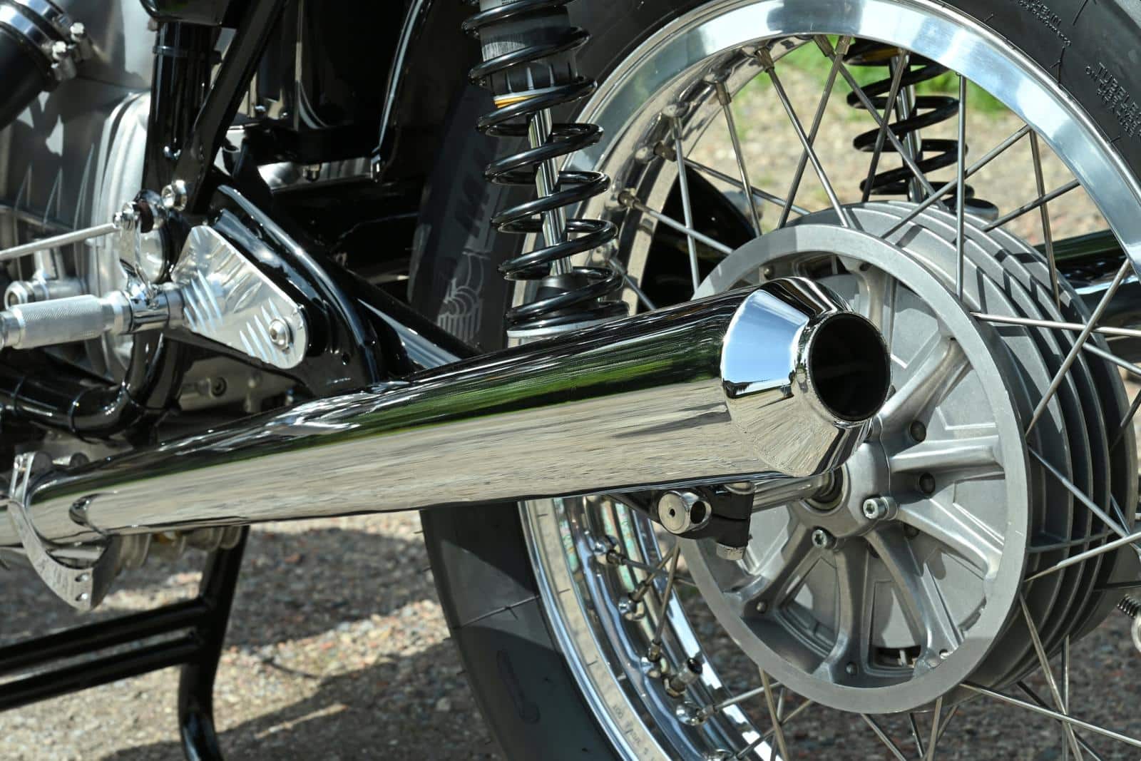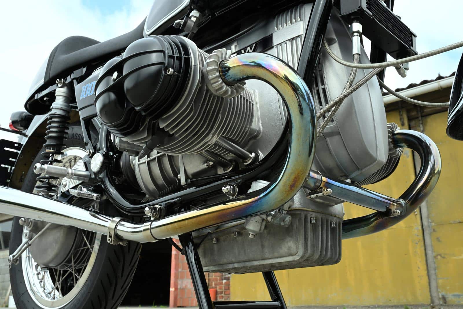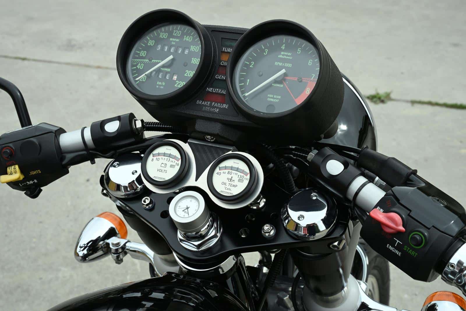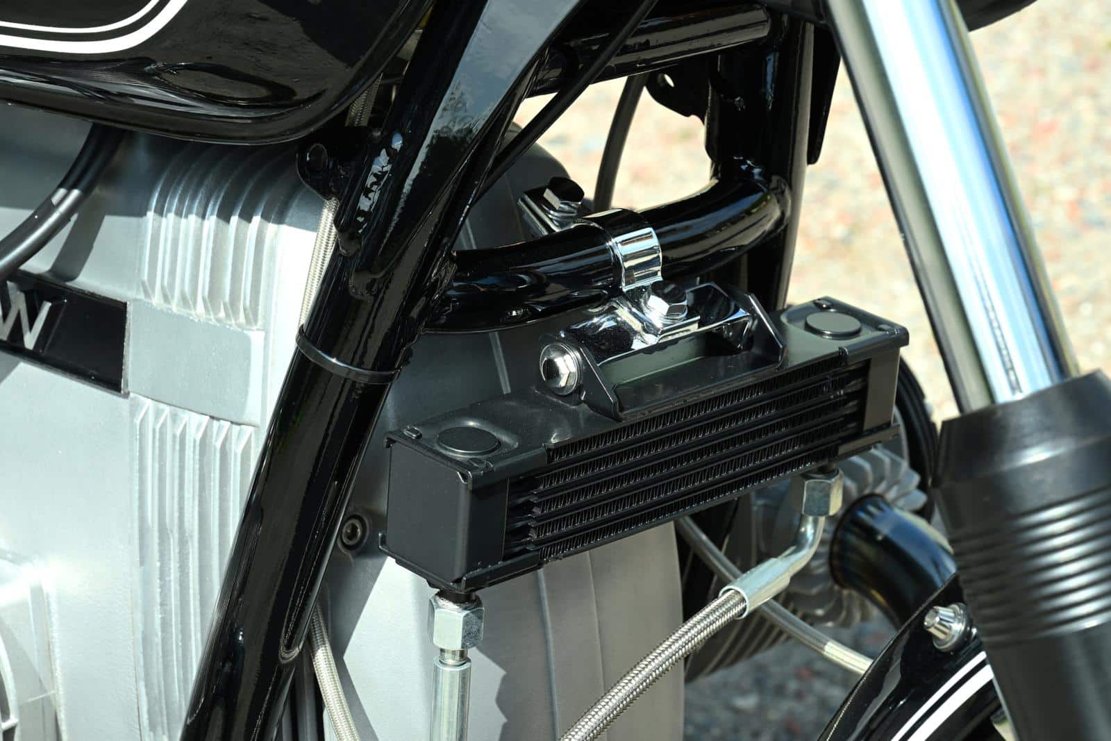 Steven vervolgt: “De voormalige eigenaar heeft zijn ganse carrière in de matrijzenbouw gewerkt en zes jaar aan de boxer gesleuteld. Elk boutje werd door hem conisch afgedraaid en verchroomd. De details zijn werkelijk fenomenaal. Ook het motorblok werd grondig onder handen genomen en volgens het meegeleverde dossier werden daar nogal wat bankbiljetten tegenaan gekletst. Zo werd de motor getuned bij ‘Motoren Israel’ in Neuhaeusel. Daar zijn ze gespecialiseerd in het reviseren van BMW boxermotoren.” Het motorblok heeft twee bougies per cilinder. Door de dubbele ontsteking heeft de krachtbron minder last van ‘pingelen’ en het brandstofmengsel wordt gelijkmatiger verbrand. De grote Wossner zuigers wegen een pak minder dan de originele pistons en ook de Siebenrock drijfstangen zijn lichter dan hun standaard versies. Beide cilinderkoppen zijn geflowed en de krukas is net als het vliegwiel lichter gemaakt en uitgebalanceerd. De in- en uitlaattrajecten werden vergroot. Voor de carburatie werden de originele 40 mm Bings behouden, maar de sproeierbezetting groeide van 170 naar 185. De van 2.25 tot 3.5 liter vergrote carterpan en Siebenrock oliekoeler zorgen er voor dat de thermische toestand beter onder controle blijft. Op de Morad spaakvelgen, die iets breder zijn dan de originele Weinmann exemplaren, kunnen bredere banden gemonteerd worden. De Michelin sloffen hebben een passend, klassiek profiel. Met de aangepast Rennsport verhoudingen liggen de versnellingen van de originele 5-bak iets korter op elkaar. Door de motorische upgrade klimt de motor sneller in hogere toerentallen, terwijl het standaard vermogen van 70 naar een zeer fatsoenlijke 90 pk aan het achterwiel steeg.
