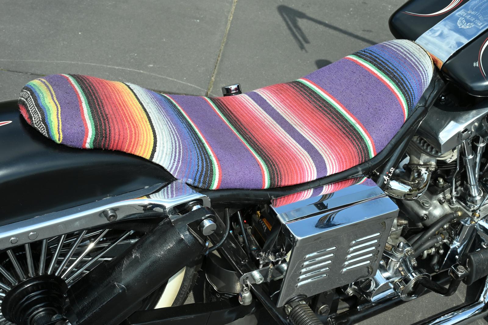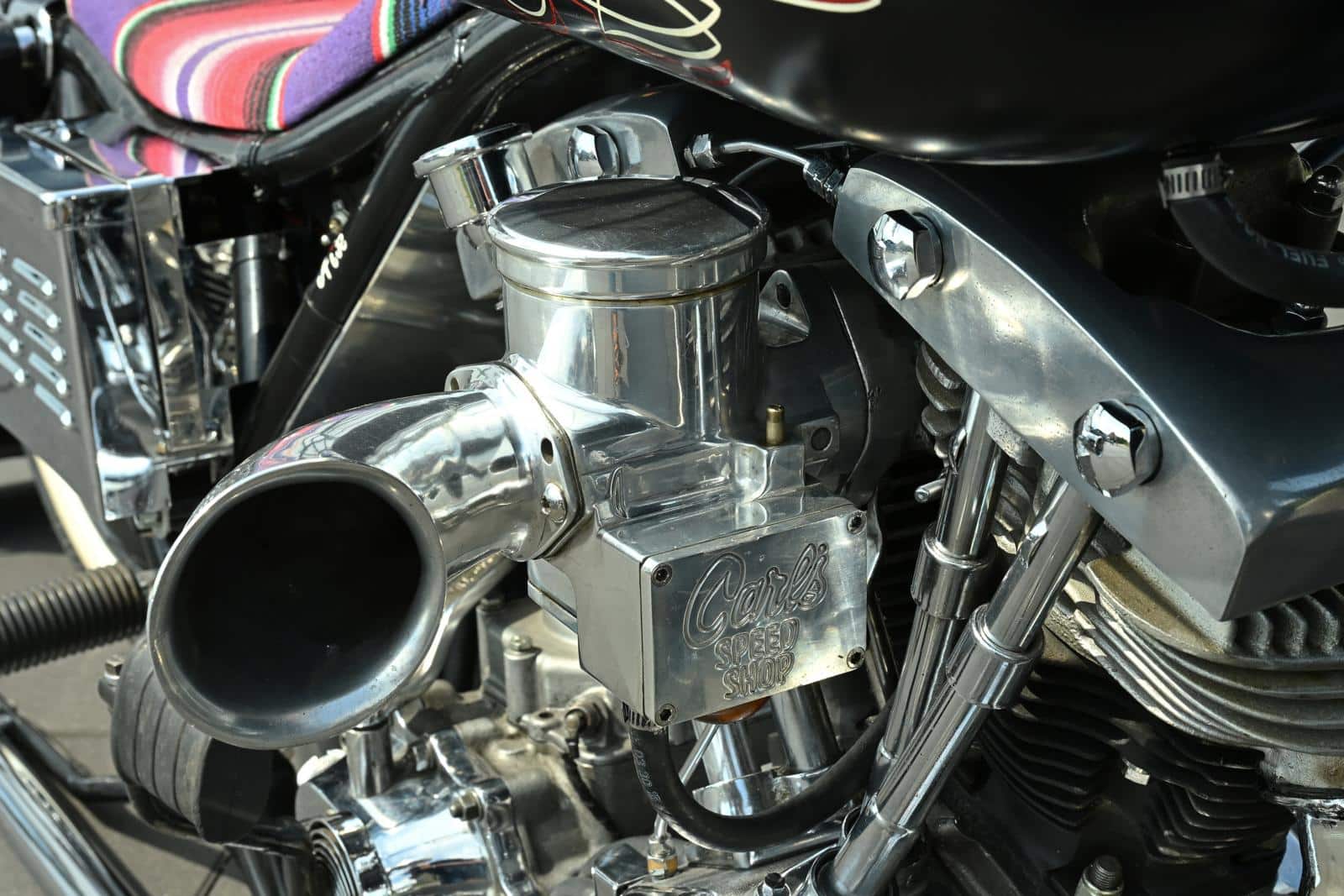 Vins verhaalt passioneel verder: “Het 1200cc Shovelblok had ik op het schap liggen als overblijfsel uit een voormalig project en heeft me bijgevolg relatief weinig geld gekost. De Carl’s Speedshop carburateur wordt vaak gebezigd voor snelheidsrecords op de Bonneville-zoutvlakte, maar in onze contreien is de opzichtige joekel amper te vinden. Voor de verkoop heb ik hem van de motor afgevezen, want dat hebbedingetje wil ik graag zo lang mogelijk in mijn bezit houden. De selfmade uitlaten zijn ongedempt, puur natuur dus. Nadat ik een demonstratie gezien had van een Hot Rod met flamethrower stond het vast dat ik dat ooit zelf eens op een motor zou uitproberen. Ik dacht daarvoor benzine als brandstof te kunnen gebruiken, maar een eerste probeersel leverde een zodanig indrukwekkende steekvlam op, dat de veiligheid ernstig in het gedrang kwam. Op zoek naar een veiliger optie kwam ik bij gas terecht. Aanvankelijk wou ik dat gas opslaan in een soda frisdrankbus, maar het vullen was veel te complex. Uiteindelijk is het een doodgewoon aangekocht gasbusje geworden, dat onder het zadel zit en geactiveerd wordt met een knop op het frame. De vlam wordt geactiveerd met de vonkjes van een ordinaire barbecue gasontsteker. Het motorblok hoeft dus niet te draaien om een klein showke op te voeren. Het denkwerk erachter gaf me een ongelooflijke voldoening.”
