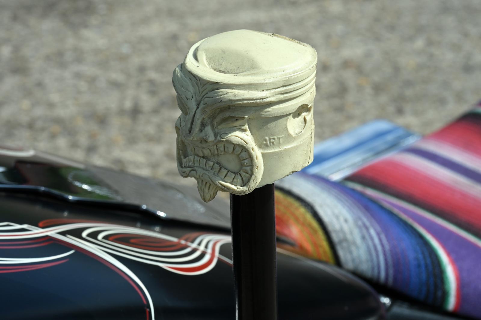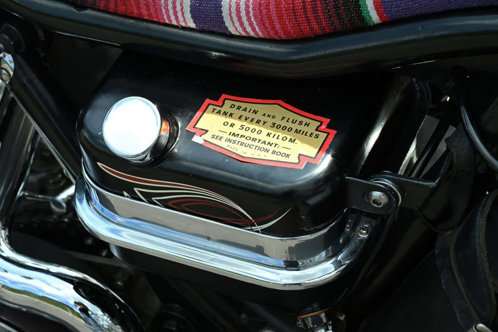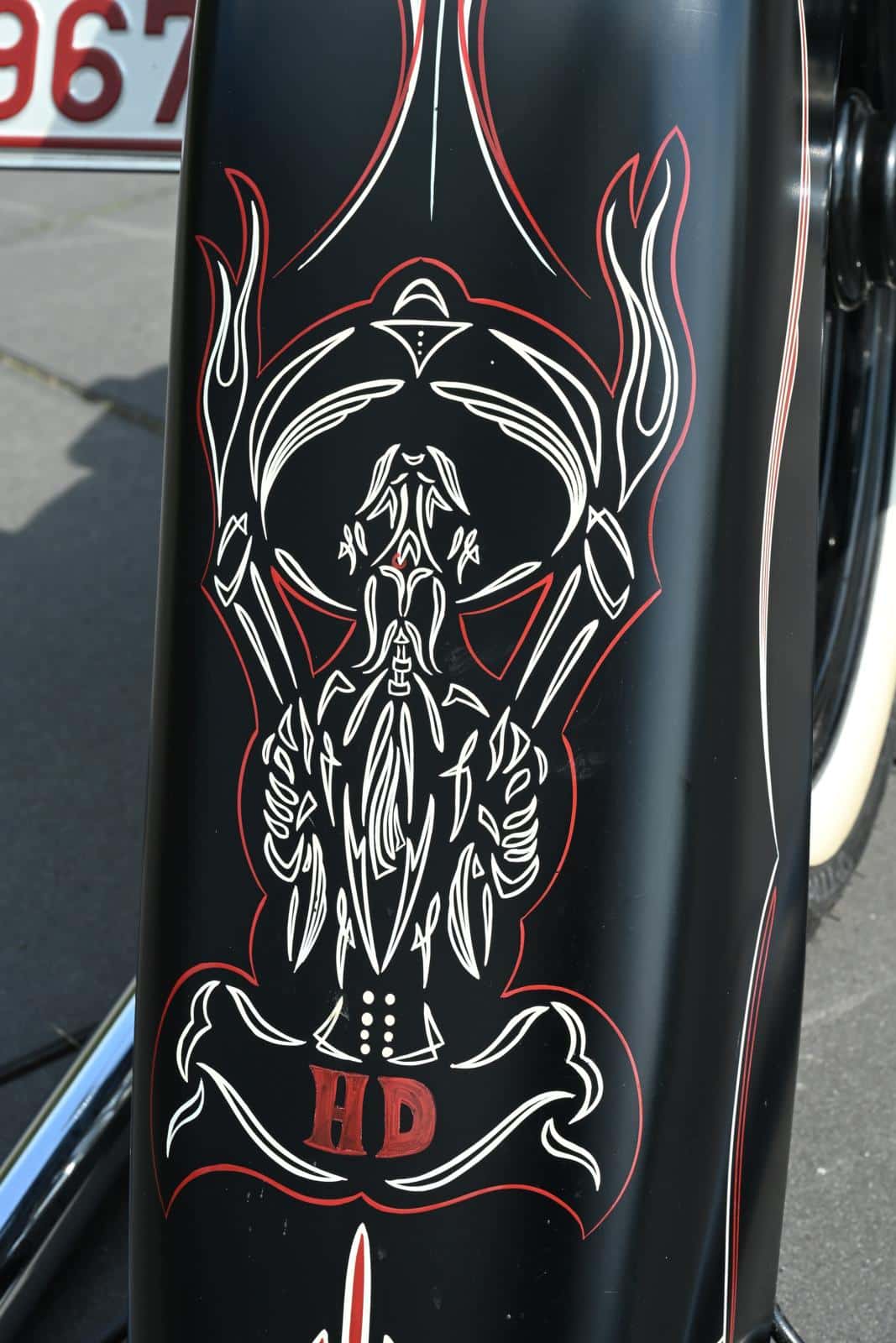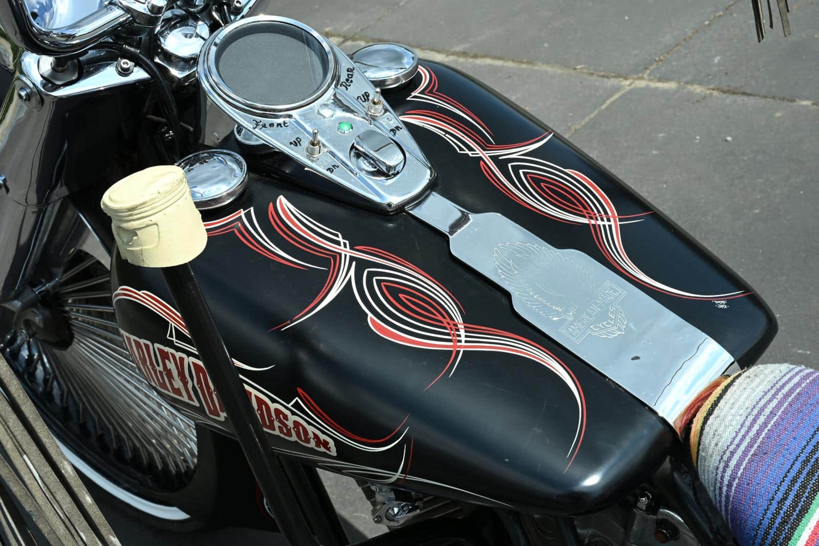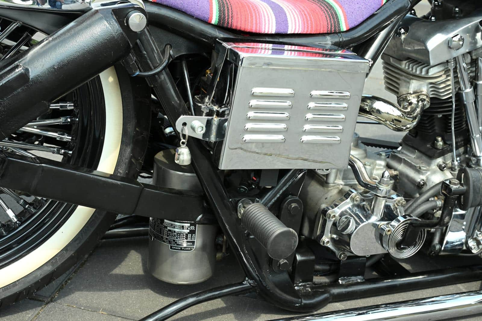 Vins vervolgt:“Het is altijd mijn ding geweest om iets te construeren wat iemand anders niet heeft. Ook al is het met de Suïcide clutch handschakeling, in combinatie met een retro apehanger, stevig werken onderweg. De naam ‘Black Widow’ leek me vrij passend. Toen ik hem voor het eerst aantrapte stond het zweet zowaar in mijn onderbroek. De op zolder aangetroffen handvatten hebben lange oldskool franjes en zijn een regelrecht stijlsymbool uit de hippie- en choppercultuur van de Seventies. De FL olietank- en batterijcovers zijn aan het frame aangepast en ingebouwd in dezelfde stijl als het originele model. Achteraan zit er een rem met Zodiac tandwiel op uit eigen fabricaat; een experiment dat verrassend goed is uitgevallen. Een voorrem zit er niet op. Royal Jack is ondertussen zowat mijn ‘huisspuiter’. Ik werk er al jarenlang mee samen en hij kent mijn verzuchtingen ondertussen al vrij goed. Motoren personaliseren blijft mijn allergrootste passie. In mijn topjaren bouwde ik tot vijf extreem gecustomizede motoren. Het enige wat aangekocht werd, was het motorblok en de versnellingsbak. Je kon de frames ook kant en klaar bestellen natuurlijk, maar ik smeedde ze volgens wens en op maat van de klant.”
