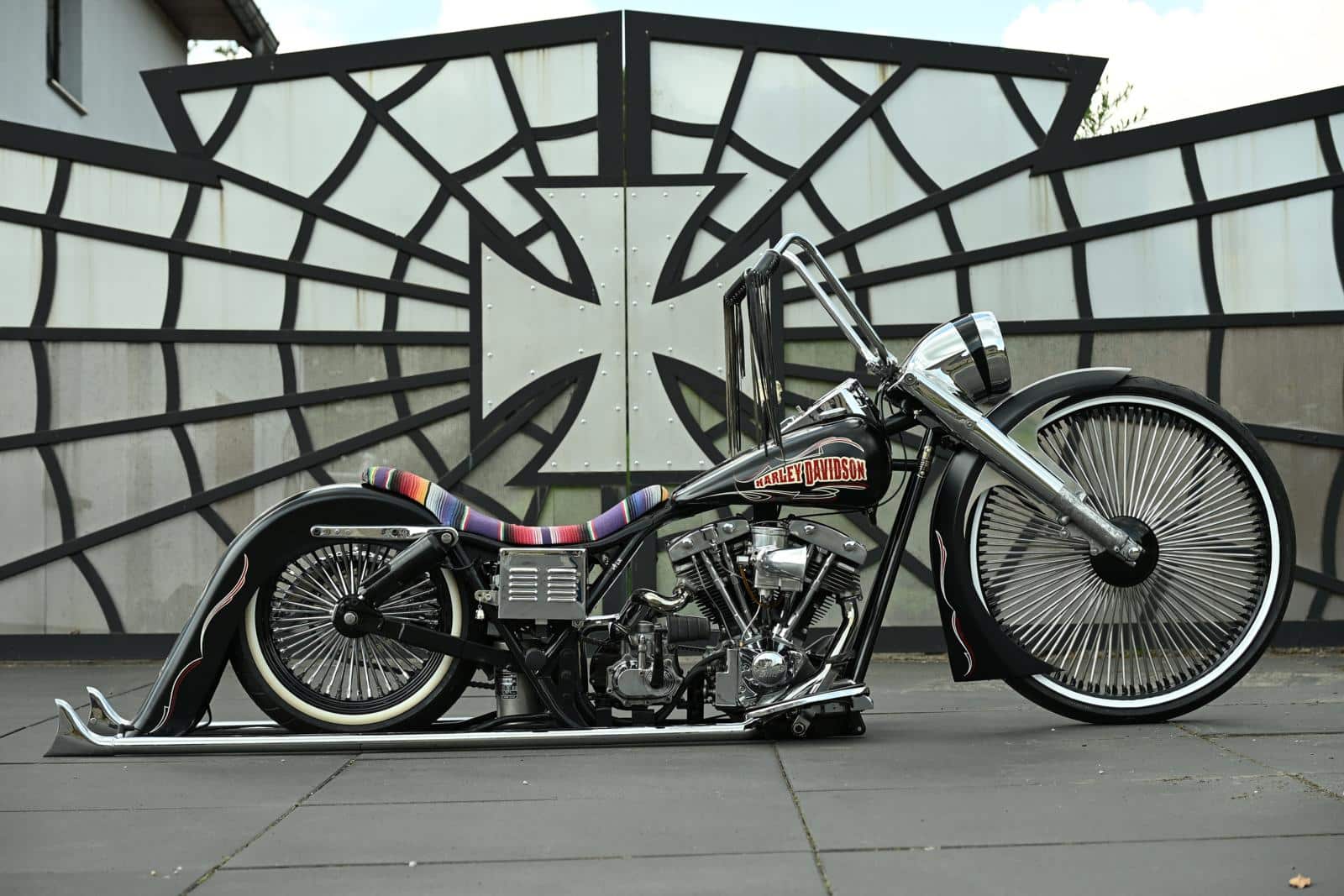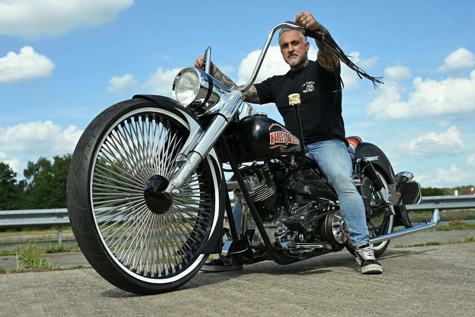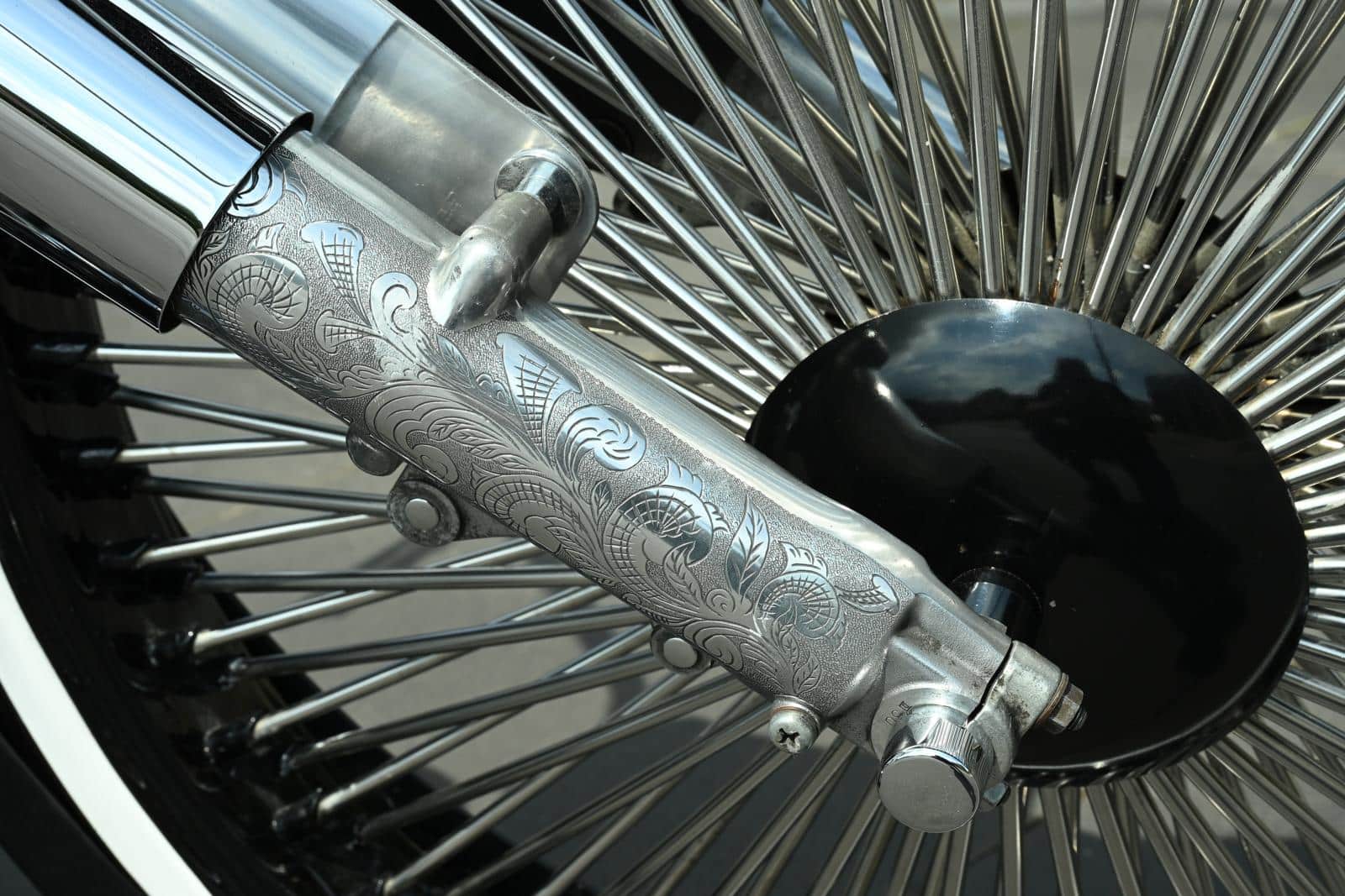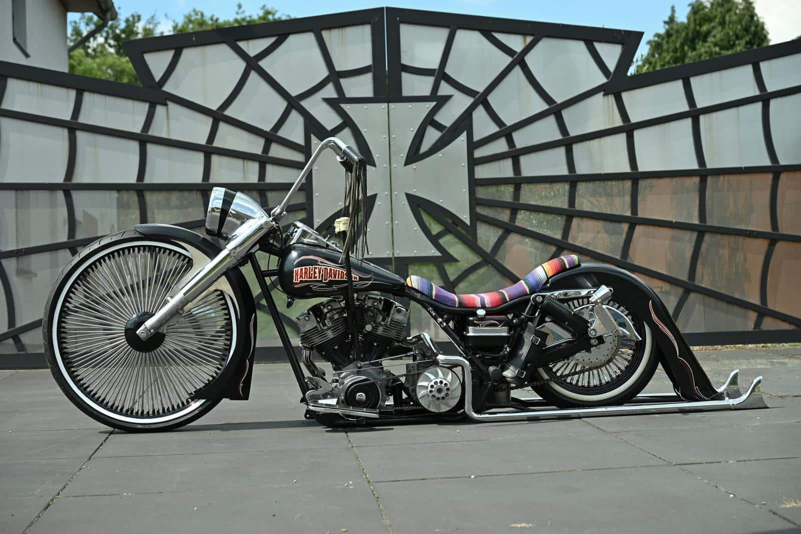 Reeds voor aanvang had Vins drie onvoorwaardelijke vereisten voor zijn eigen ‘one of a kind motorcycle’: de machine moest luchtvering krijgen, er moesten flamethrower uitlaten op en 30 inch wielen met 100 lange, kaarsrechte spaken. Dat was minder makkelijk dan gedacht. “Gespaakte wielen met deze afmetingen worden eigenlijk niet gemaakt”, oppert hij. “In een eerste fase heb ik de velgen zelf vervaardigd en dunne spaken laten maken. Tot mijn verbijstering moest ik tijdens een eerste proefrit vaststellen dat de wielen instabiel waren en begonnen te zwabberen. Vermoedelijk lagen de lange en fijne spaken aan de basis. Met nieuwe, uit Inox gemaakte wielen en dikkere spaken is dat euvel inmiddels opgelost. Van het FXR kader had ik enkel nog het ondergedeelte en de reden daarvan is me tot op heden een mysterie. Het ontbrekende fragment heb ik zelf gelast en aangepast aan de verhoogde en verlengde afmetingen. Met enkel het frame en de gemonteerde wielen op de heftafel zat ik, met een frisse pint in de hand, dikwijls urenlang te filosoferen hoe ik de verdere lijnen zou uitzetten. “In een volgend stadium werd de air ride gemonteerd, want ik wou de motor absoluut met de buik tegen de grond kunnen stationeren. De bediening zit in de dash cover van de dik 20cm verlengde benzinetank. De achterbrug werd uiteraard aangepast aan de reeds opgebouwde dimensies. Verder werd het spatbord gemodificeerd om niet tegen de band aan te komen tijdens het zakken.