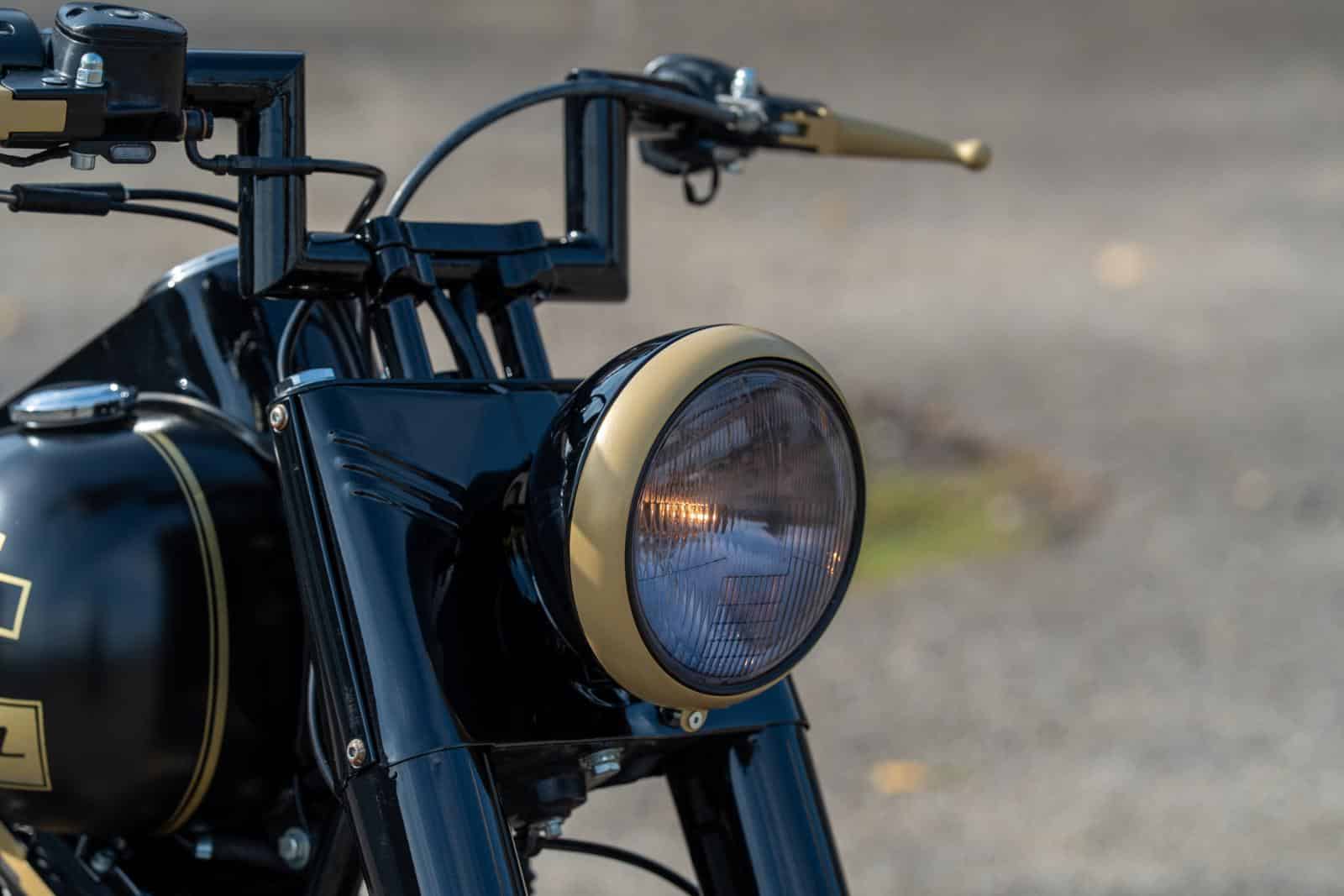 De inspiratie voor de Bobber kwam van een Thunderbike-exemplaar. Al het chroom moest verdwijnen: dus koplamp, meters, voorvork, olietank, kappen, kleppendeksels zonder chroom. Tom gaat verder: “Alles werd schoongemaakt en klaargemaakt voor de poedercoater. Zwart in hoogglans of mat, aangevuld met gouden details. Daarna volgden het frame en het blok, compleet opnieuw opgebouwd met nieuwe pakkingen en verse olie. De wielen kregen originele naven, maar die werden door Haan Wheels opnieuw gespaakt. Het Z-bar stuur was een project op zich. Zelf meten, draaien en lassen tot het stuur dat ik in mijn hoofd had werkelijkheid werd. Ook het achterspatbord verbouwde ik zelf. Het eerste exemplaar was te kort. Na een rit over een natte weg had ik een streep op mijn rug. Dus volgde een langere versie. De kleuren zijn geïnspireerd op de gevel van de Chanel-winkel in Amsterdam: mat metallic goud.” Tank en details spoot Tom zelf: eerst goud, daarna afplakken, zwart eroverheen en afwerken met matte 2K-lak. “Voor een eerste keer spuiten ben ik er best trots op. Het zadel komt uit Rusland en is gemaakt van dik buffelleer met siernaden. Door de oorlog duurde de levering lang, maar via Belarus en Polen kwam het zadel uiteindelijk toch in Nederland terecht. Rijden doe ik er nauwelijks mee. Hooguit 200 kilometer per jaar. Voor mij zit de echte kick in het bouwen.”