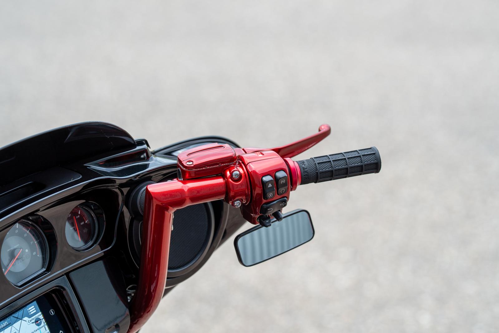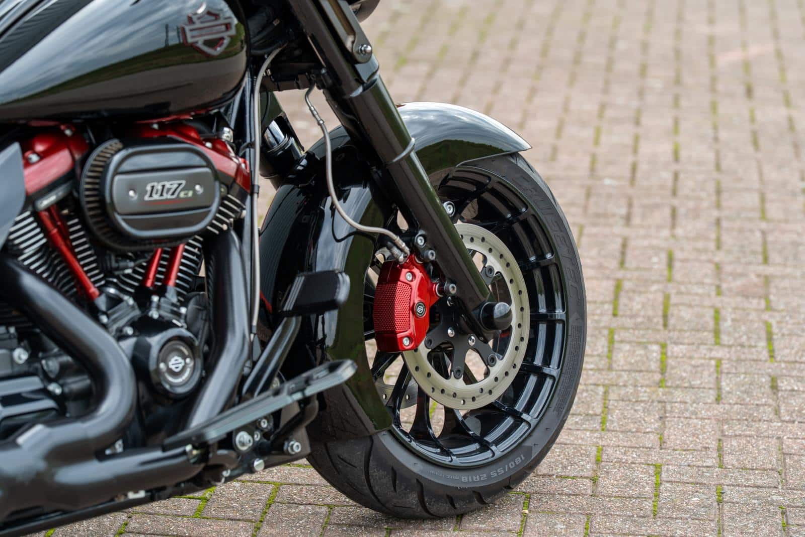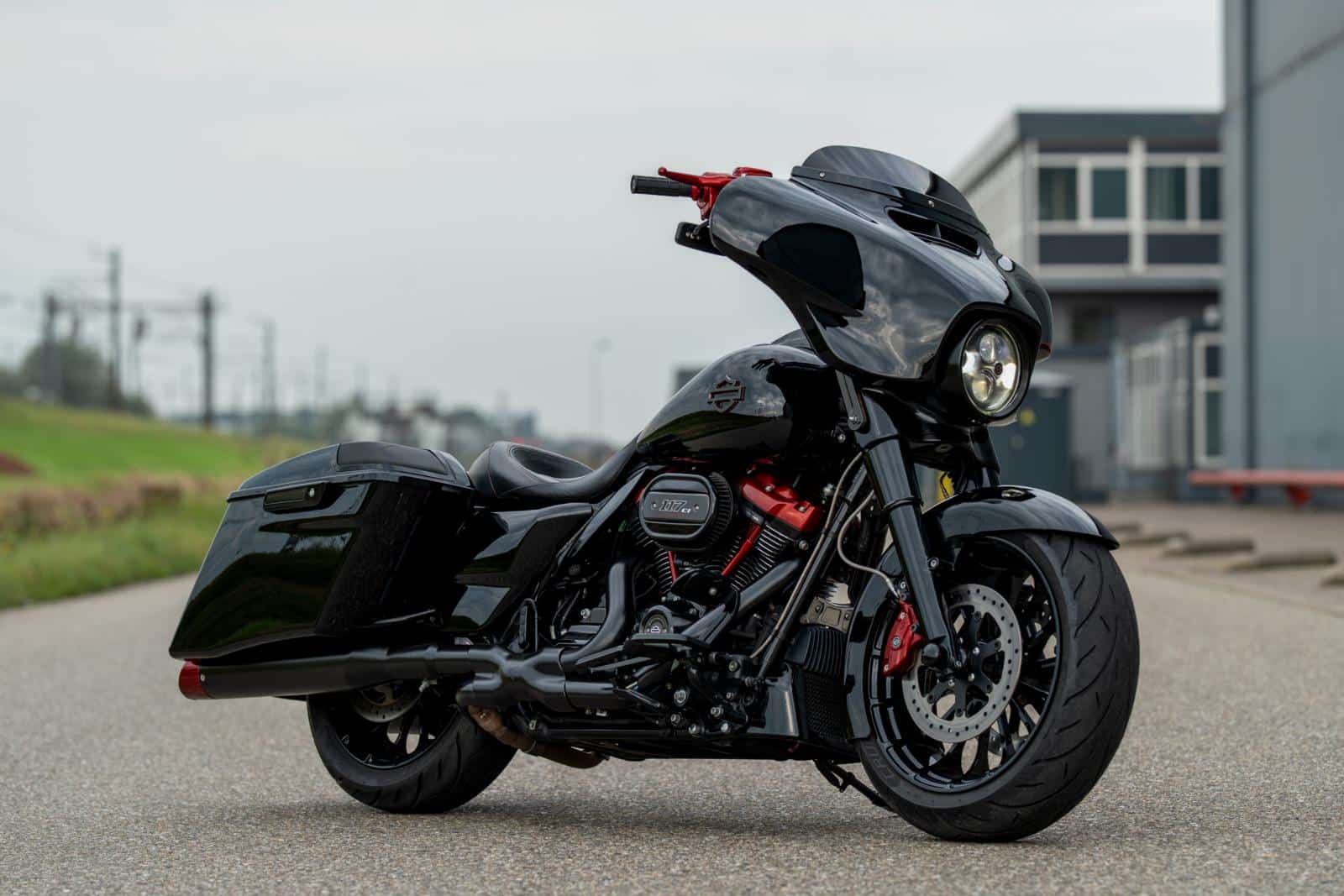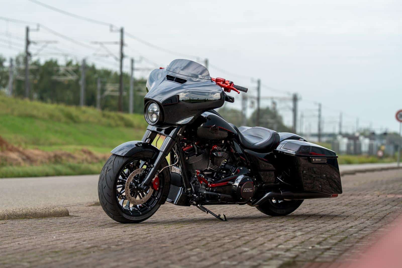 Tom was op zoek naar een CVO Street Glide en hij vond die bij een H-D-dealer in België, waar hij vervolgens samen met Walter naartoe reed. “De motor had lakschade en een koffer was kapot, maar verder was ‘ie origineel en precies wat ik zocht”, vertelt Tom, terwijl Walter instemmend knikt. “Het chroom moest verdwijnen. Ik wist van het poedercoatbedrijf dat rood over chroom veel meer effect geeft dan over zwart. Nadat de delen gespoten waren, begon ik met de opbouw van het blok en de rest van de motor. De voorkant kreeg een complete metamorfose: een fat front met een brede 180-voorband, Arlen Ness-vorkbussen, een aluminium velg en een Arlen Ness voorspatbord uit Amerika. Dat was overigens wel een dingetje” stelt Tom. “Er is een vaste volgorde om het passend te krijgen: eerst de vorkpoten naar buiten draaien, dan het wiel erin en alles weer terug. Het komt heel nauw. Daarna volgden een nieuwe Batwing, koffers met aangepaste deksels voor grotere speakers, en een koplamp die op 60 graden in de oven ging, zodat ook de binnenzijde meegespoten kon worden. Het stuur, een LA Choppers, kreeg alles binnendoor, op de remleiding na. De CVO is standaard al schitterend, maar met de upgrades zelfs nòg mooier. Hij is getuned -niet door mij hoor- en heeft een ziek vermogen.” Of hij ‘m gaat verkopen, weet Tom nog niet. “Misschien, want ik mis wat show. Het moet voor mij echt apart zijn, zoals die Mexicaanse Softail.”