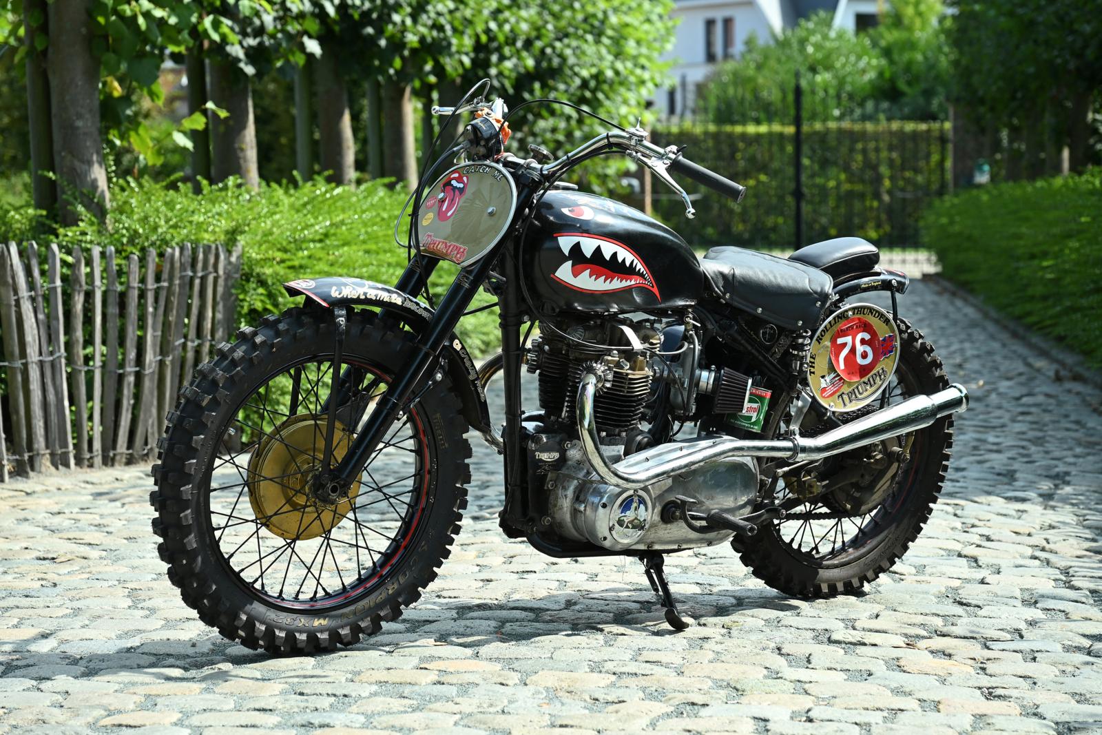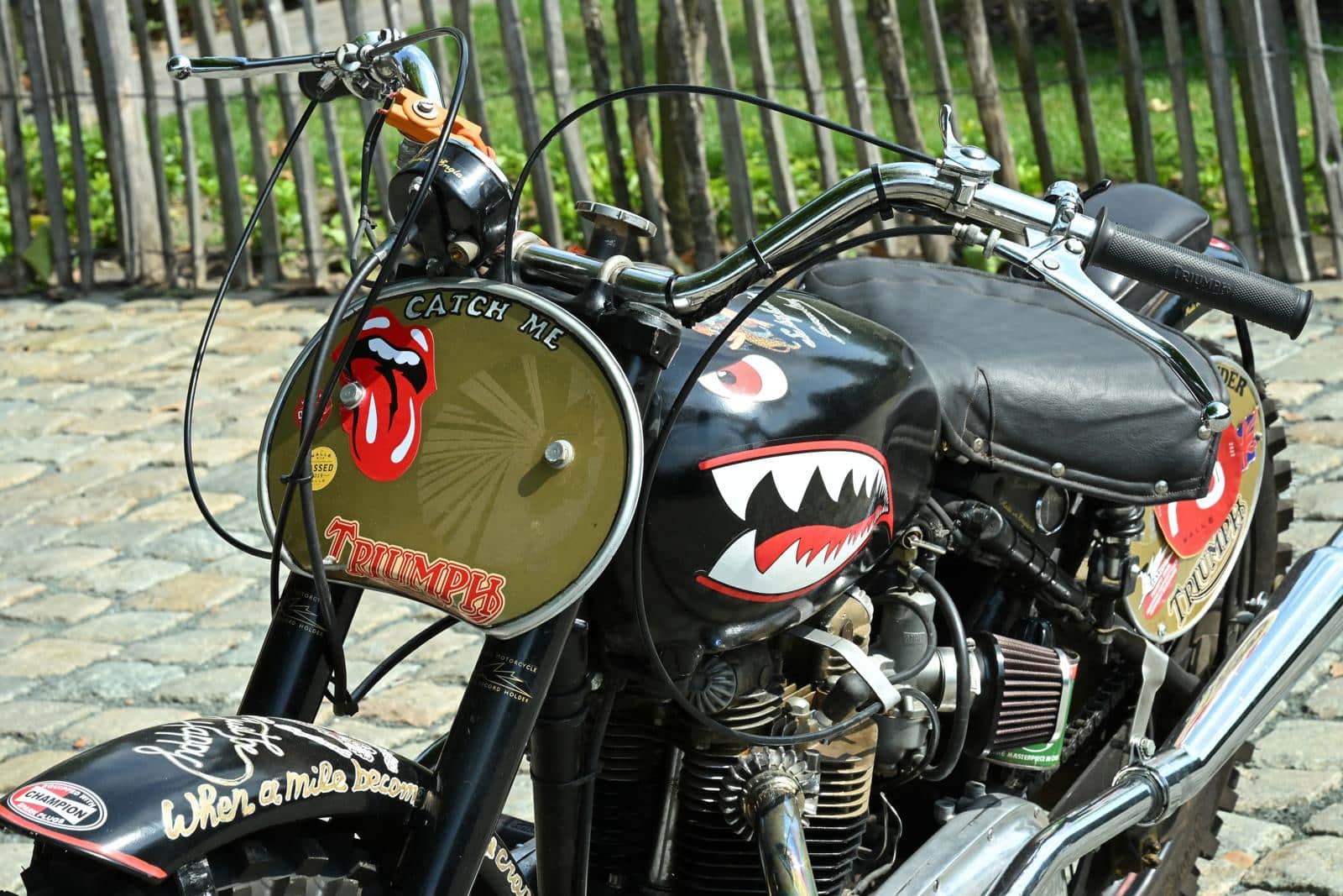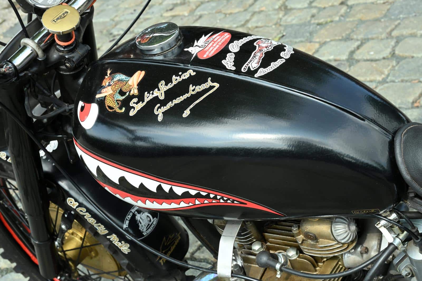 Voorafgaand aan de zoektocht naar een donormachine wist Joris al wat hij wou. Het moest een Triumph met een stijf Rigid frame zijn. Schokdempers zitten er dus niet op. Met de ‘sprung hub’, een in het achterwiel geïntrigeerde veringnaaf, beschikt de motor toch over enkele centimeters demping. Het klassiek Lycett zadel, dat voorzien is van twee ooit eens ergens in Nederland bestelde amortisseurkes (veren), vangt de overige schokken een tikkeltje op. “Om de zwarte laklaag te spuiten ben ik de kelder ingedoken,” lacht Joris. “De haaienstickers zijn op bestelling gemaakt. Zo’n sticker had ik ooit eens gezien op een foto van een sidecar. Dat vond ik wel iets hebben. De cilinderkop is goudkleurig gespoten, bij vooroorlogse machines was dat brons. De motor heeft geen specifieke doeleinden en vertoeft meestal in de schuur. Hij werd gebruikt voor deelnames aan strandraces en de Malle Mile. Op dergelijke wedstrijden moet de motor goed marcheren, maar het hoofddoel blijft plezier. Eenmaal aan de startlijn verdwijnt het normale verstand en komt de adrenaline naar boven. Een podium of lauwerkransen zijn echter geen vereiste. Het is eerder een stoeipartij tussen taaie rakkers, die mentaal 16 jaar gebleven zijn. Toch moet er voor de volgende race een sterker blok in en andere uitlaten op. Het competitiebeestje is nog lang niet dood. Anderzijds kan ik op een uurtje schroeven de twin terug straatlegaal maken. De lichtschakelaar zit verscholen in een origineel Castrol olieblikje aan de zijkant.”