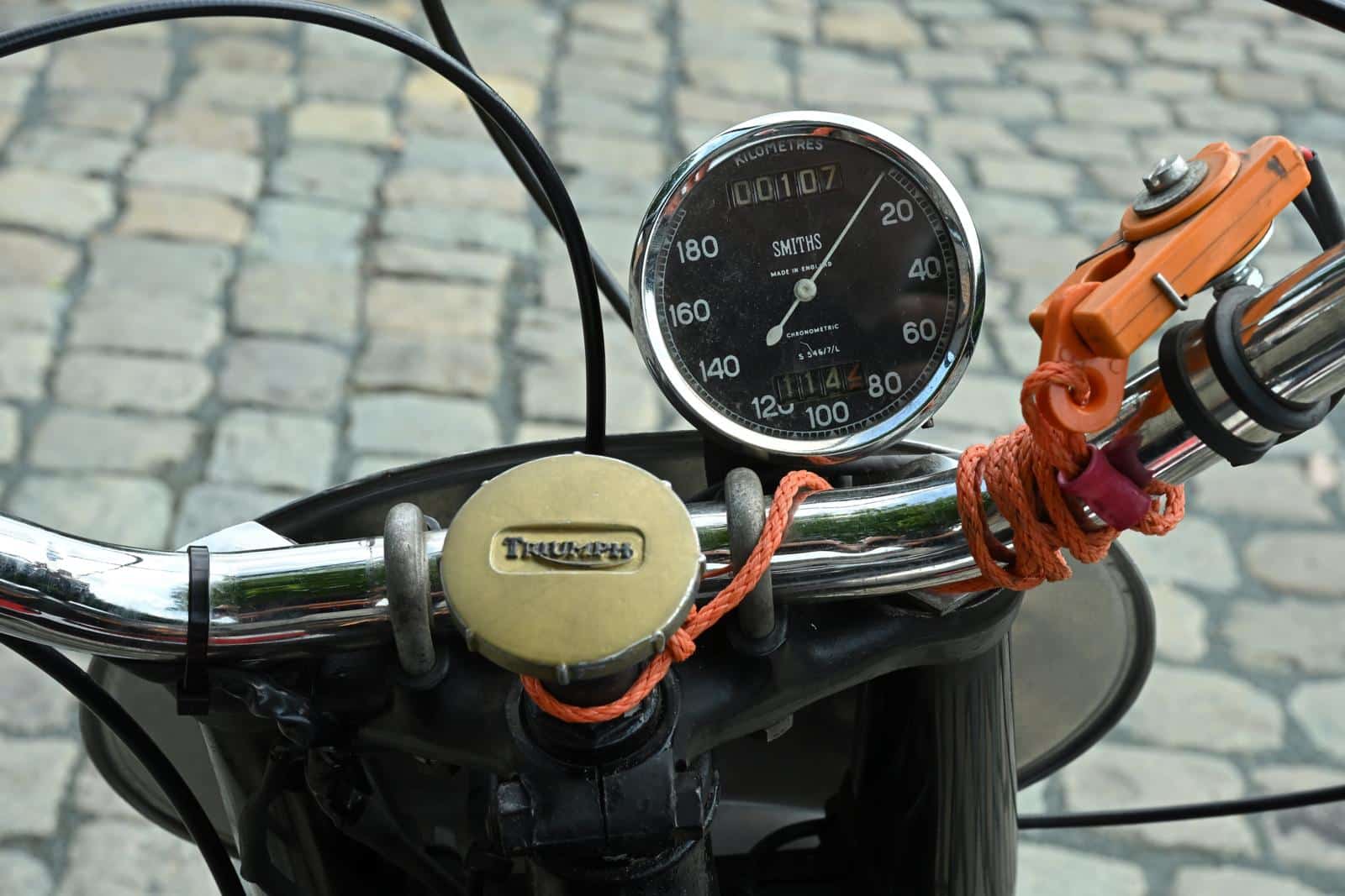 Joris: “Mijn vriend, die ondertussen de zeventig gepasseerd is, heeft nogal wat Triumph’s in de schuur staan en had de 6T ruwweg vijftig jaar in zijn bezit. Als jonge gast sjeesde hij er voor de fun mee door de bossen. Achteraan zat er een groot tandwiel op en de machine was ietwat krakkemikkig overspoten geweest. De ideale donor voor het project waarvan de meeste aanpassingen reeds door mijn hoofd dwarrelden. De opzet was de deelname aan The Malle Mile Festival, een Engelse non-stop hulde aan snelheid, motorcultuur en muziek. Spielerei op het hoogste niveau.”