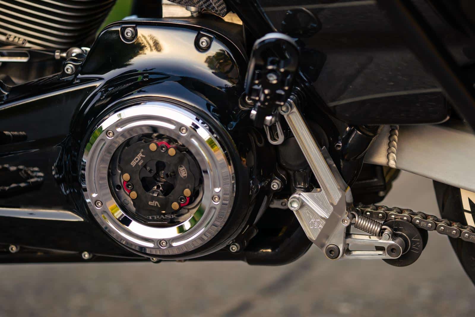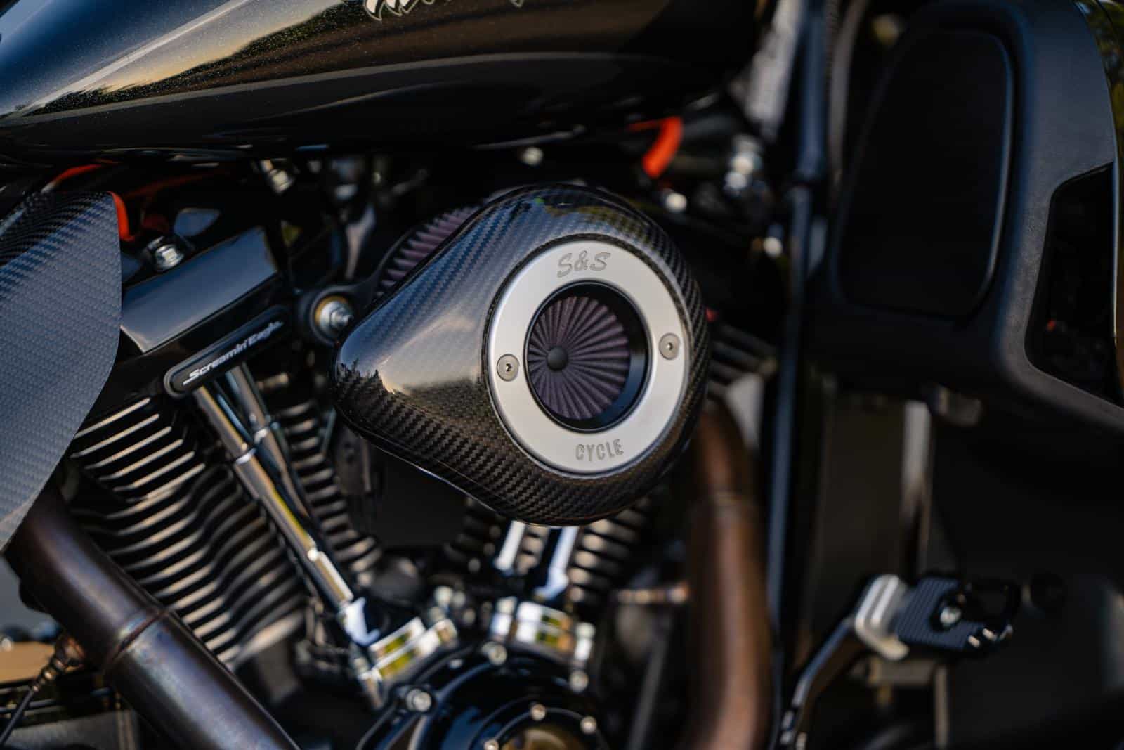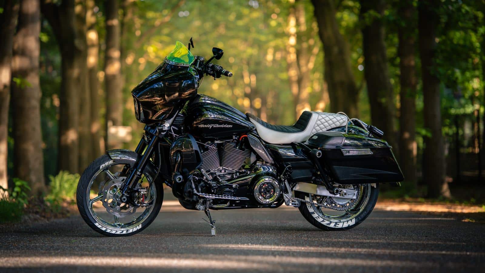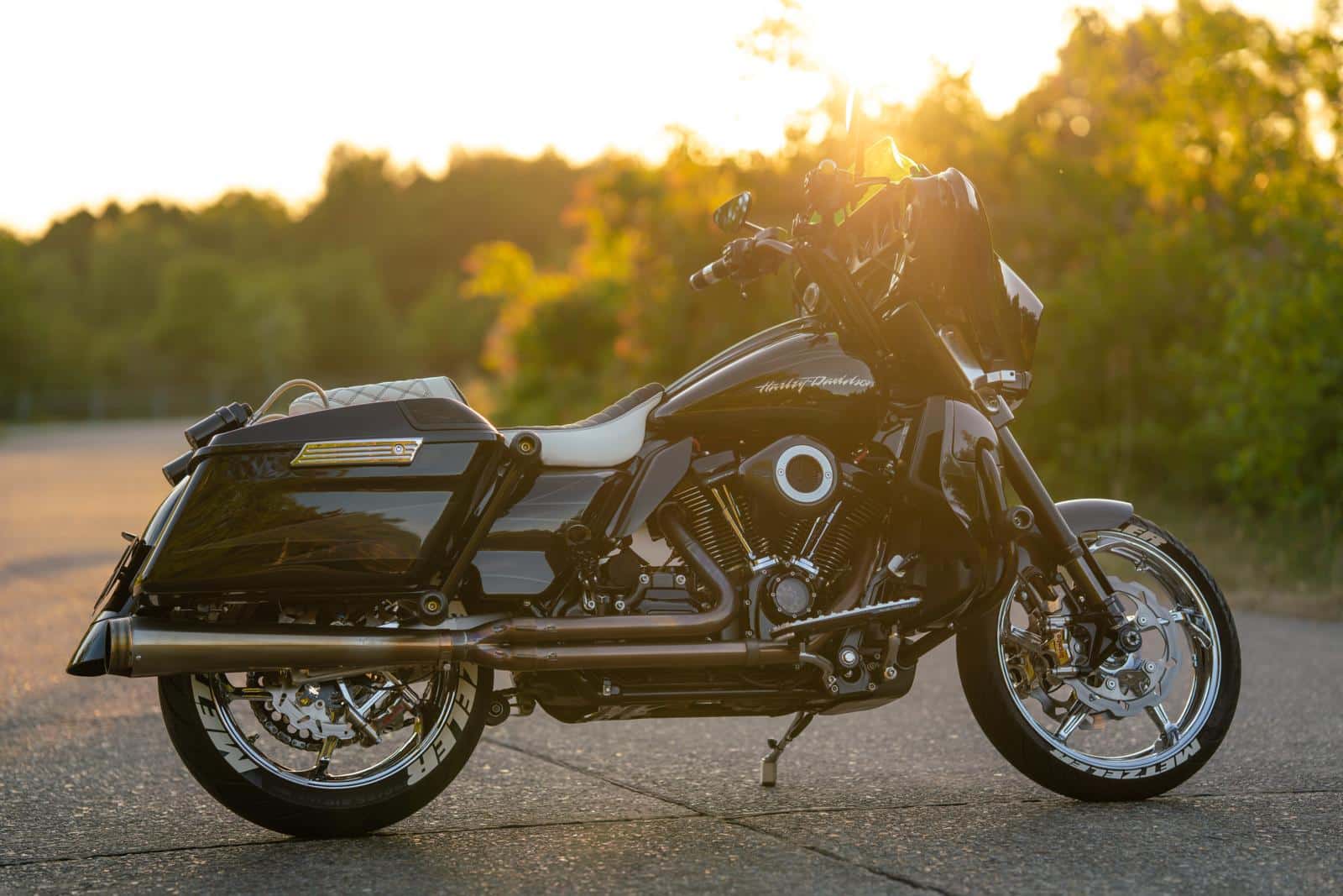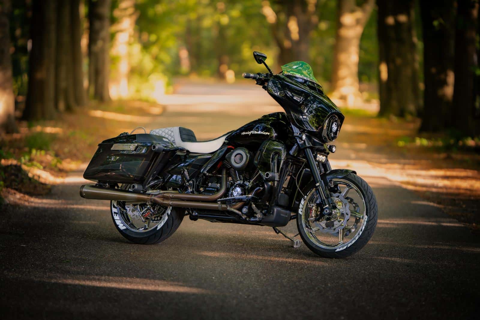Eli Finies stapt af, lacht breed en geeft me een hand als een bankschroef. “Zo”, zegt hij, “dat is ‘m dan.” En ja hoor dat is ‘m. We lopen eromheen alsof we een bom onschadelijk moeten maken. Alles glimt, alles klopt. Eli begint te vertellen en hij kent elk boutje, elk moertje, elke kabel bij naam. Tja, het verschil tussen kopen en bouwen. Dit is z’n kind. “Alles zelf gedaan,” zegt hij met een grijns en dat geloof je meteen. Die handen van hem lijken gemaakt om staal te buigen. Eli, bouwjaar ’82, is sociotherapeut van beroep, ja echt waar! Dus iemand die normaal mensen weer op het rechte pad zet. Grappig eigenlijk want zijn motor doet precies het tegenovergestelde. Zijn CVO is een 2017’er, maar er is geen schroef meer standaard. Milwaukee Eight-blok, 132 cui, S&S-zuigers, SE extreme CNC heads, injectie met 68 mm throttle body, Star Racing 3/4 nokkenas en S&S Teardrop luchtfilter dat hij zelf heeft aangepast. De uitlaat een Fuelmoto Jackpot 2-1 RTX stainless. Het rijwielgedeelte is genieten voor techneuten met de Rebuffini upside down voorvork, Brembo GP4-RX remmen en Metzeler Cruisetecs die plakken als kauwgom op asfalt. Alles klopt!
