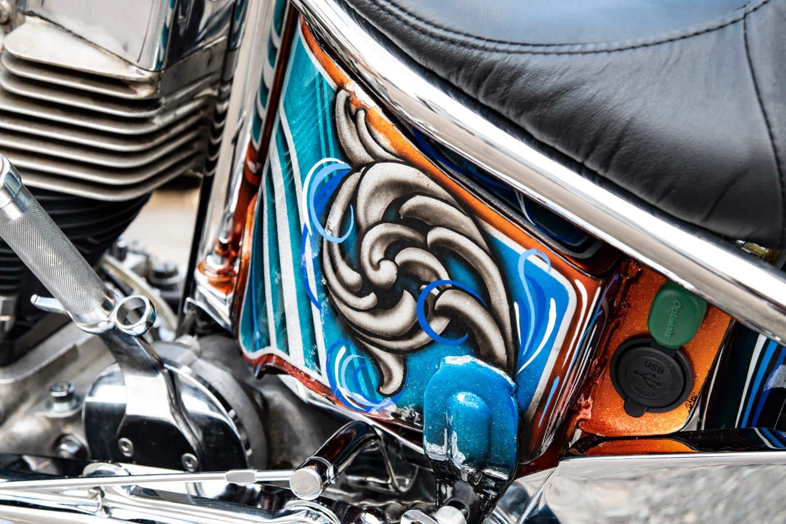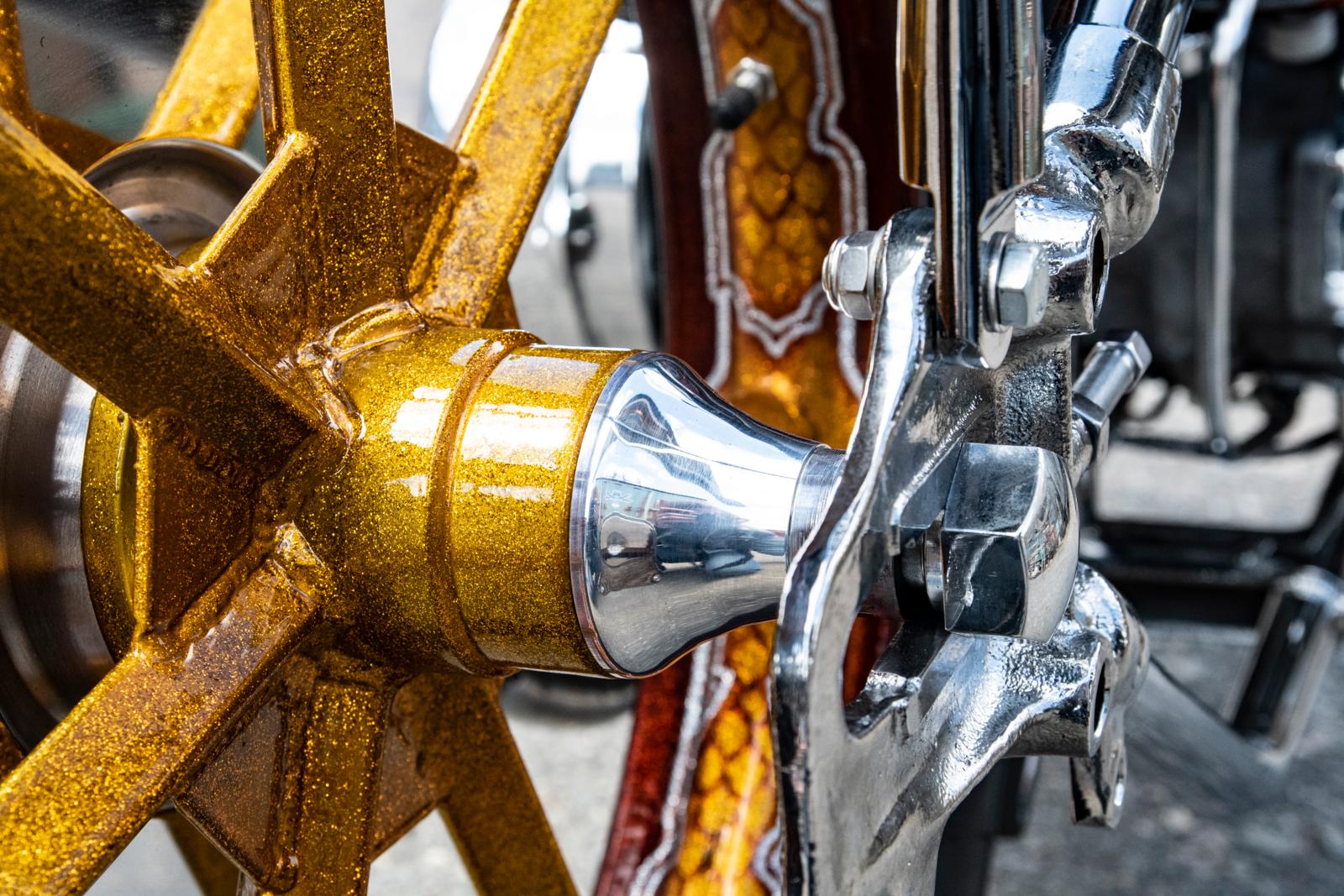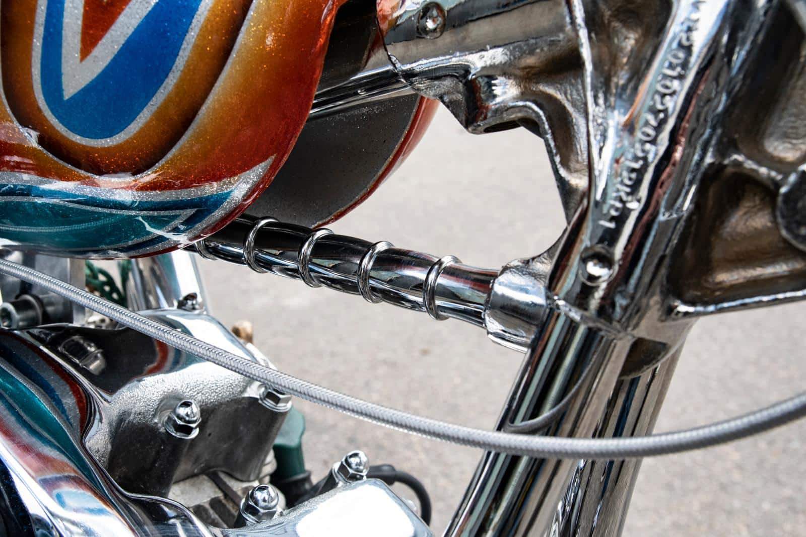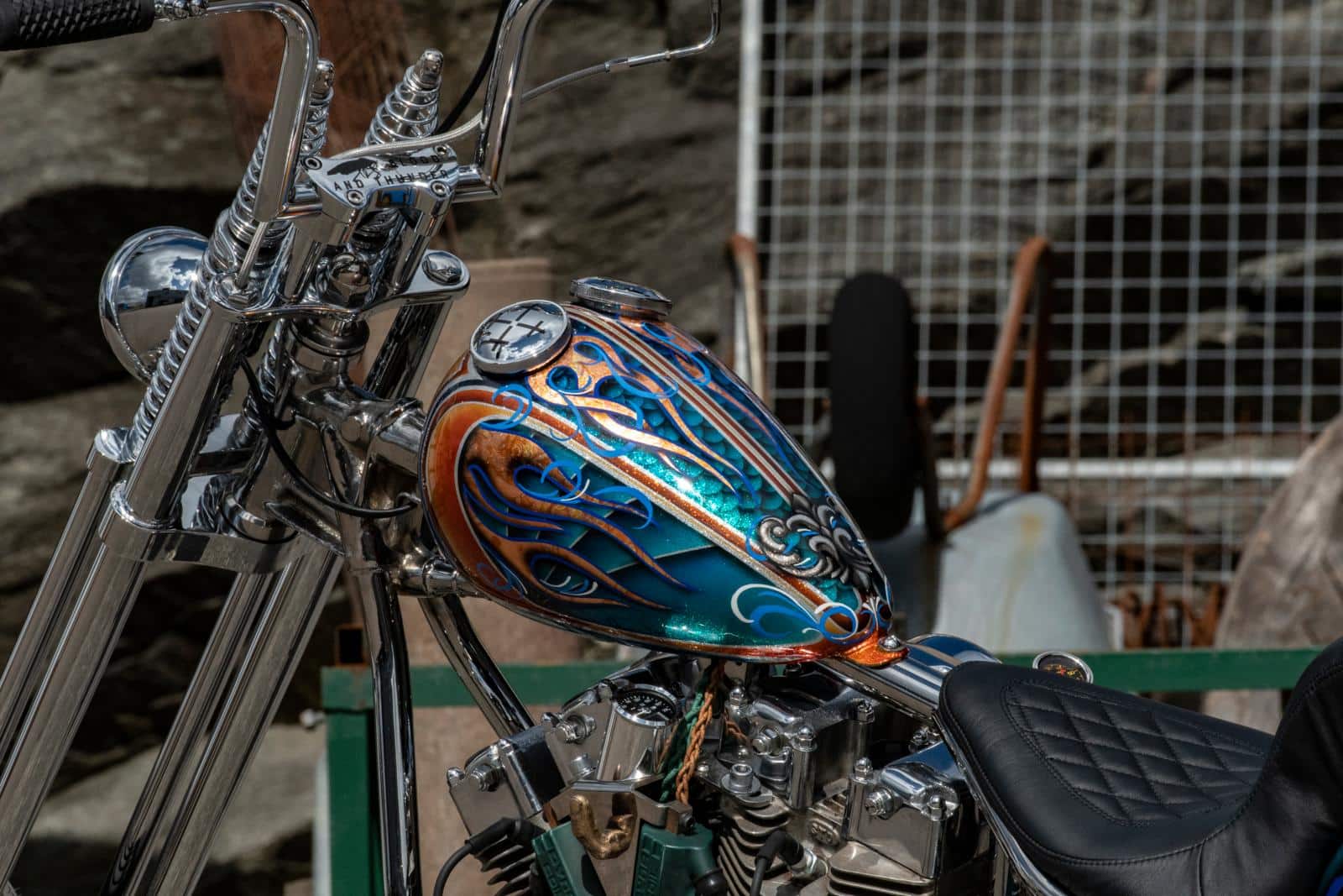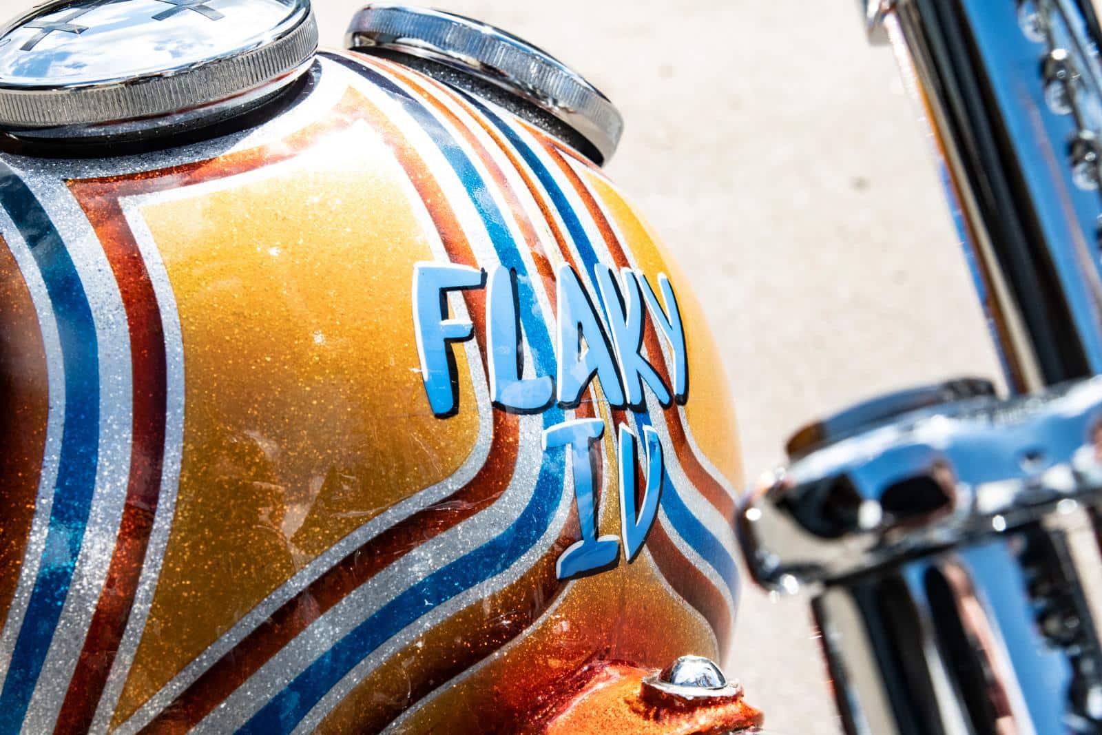 Daniel is nog niet zo oud, maar desondanks al wel een ervaren bouwer. Hij voltooide zijn eerste chopper in 2006. Dat was in eerste instantie een tamelijk eenvoudig geheel in stemming zwart, maar later volgden nog diverse aanpassingen inclusief een veel sprekender paintjob. Een bijzonder detail op die bike was het schakelpook, een onderdeel dat Daniel zelf maakte uit een mes en het magazijn van een geweer. Hoewel Daniel die eerste bike al lang geleden verkocht heeft, besloot hij destijds dat onderdeel zelf te houden. Terwijl hij met Flaky IV bezig was bedacht hij dat die oude schakelpook perfect zou passen op de bike. Hij zocht en vond ‘em in zijn werkplaats, verwijderde alle stof en roest, waarna het allemaal perfect op de bike bleek te passen.