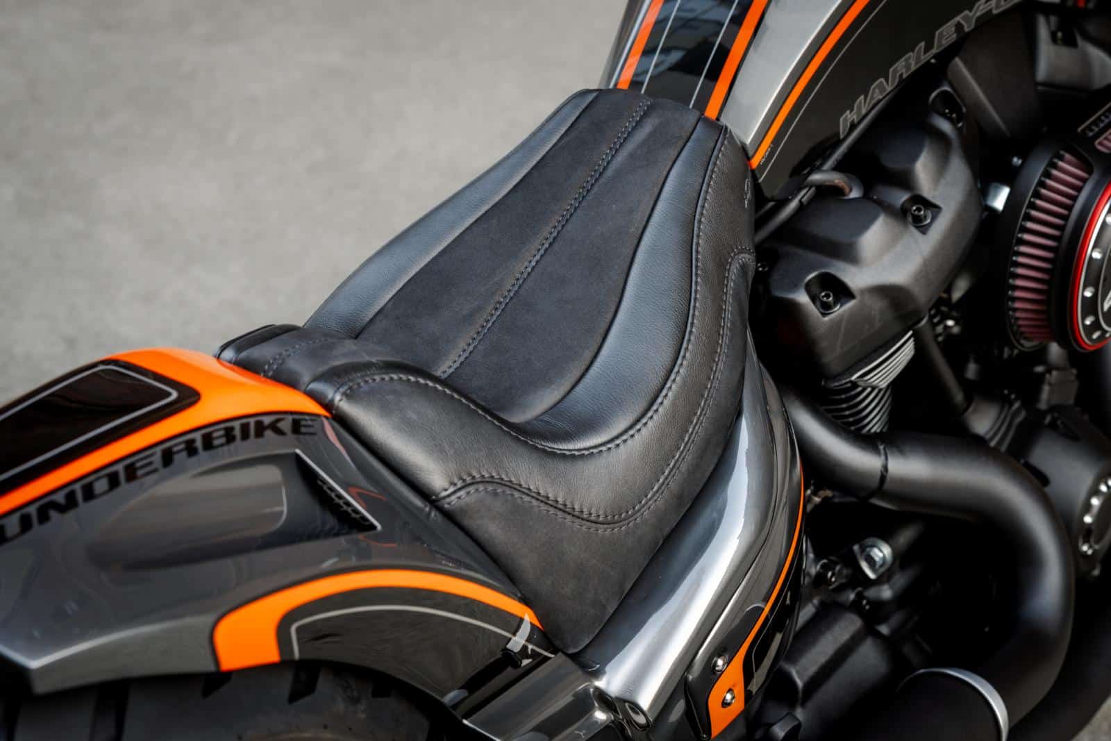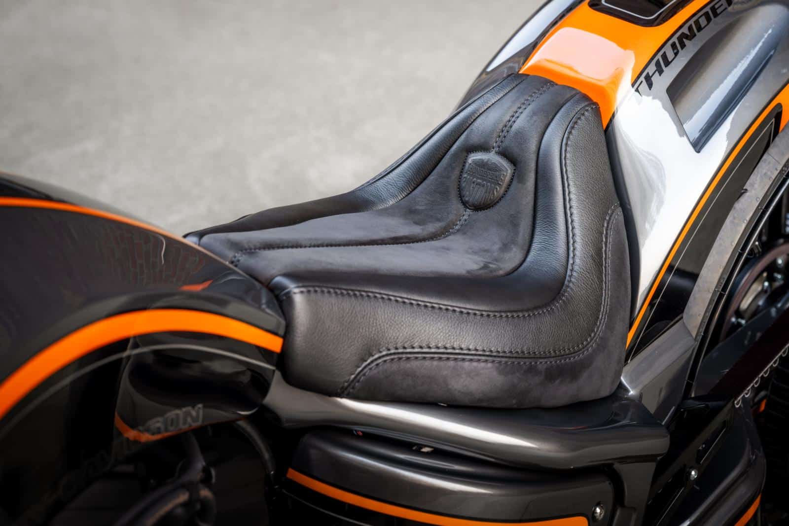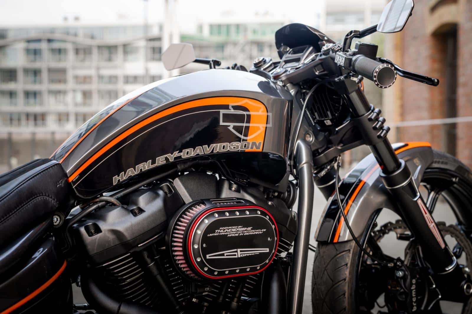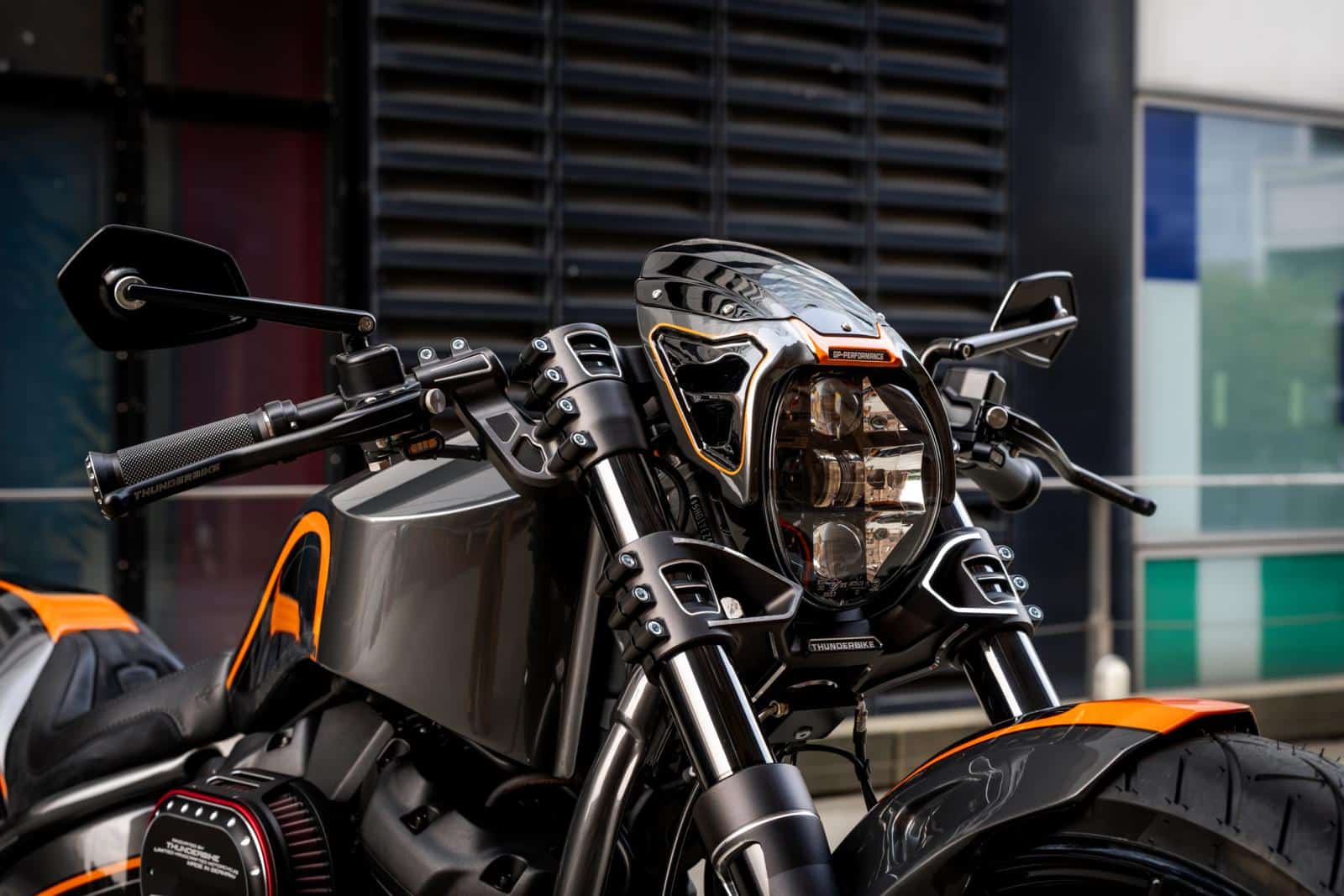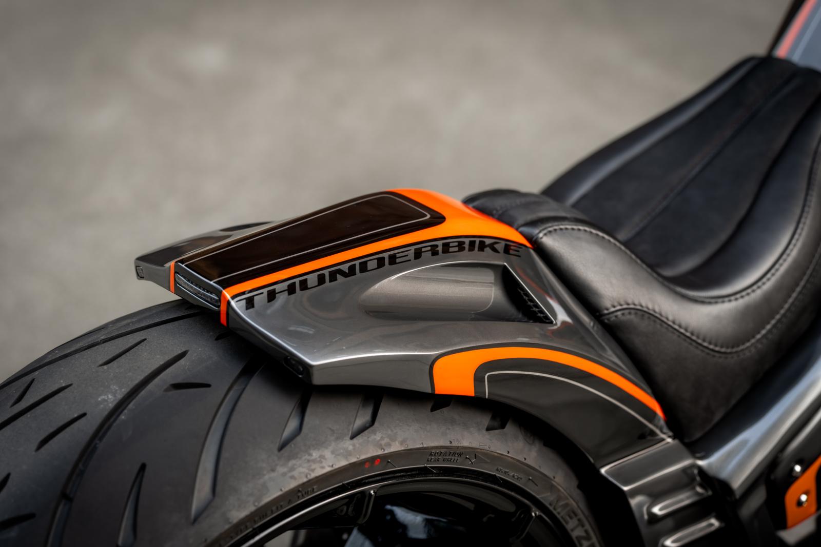 Het GP-style achterspatbord bevat ‘verborgen’ LEDs als achterlicht en zit vastgelast, net zoals de front spoiler. Het GP zadel, voor het achterspatbord, is special ontworpen op de extra brede 260 achterband. De GP aluminium tank benadrukt het sportieve karakter van de Harley. Aan de achterzijde steelt de enkelzijdige swingarm de show, maar zijn ook het 21 inch wiel, de GP-pulley en de perimeter remschijf stuk voor stuk onderdelen die de aandacht trekken. De sidemount houdt het geheel optisch intact en de Slamtail Suspension kit maakt het mogelijk met een druk op de knop de achterkant te laten zakken, net als een Airride. De verschillende covers op de bike zijn afkomstig uit de ‘Drilled’ serie, terwijl de ovale airbox cover weer uit de Grand Prix serie afkomstig is. Dat alles op een blok waarvan de carters een ‘wrinkle black’ finish hebben gekregen. De rest van het spuitwerk kwam voor rekening van Thunderbike’s ‘huisartiest’ Ingo Kruse. Puur voor de looks werd de GP-Suzuka (genoemd naar het fameuze circuit in Japan) door Thunderbike uitgerust met hun GP uitlaatsysteem, dat echter niet straat-legaal is. Maar de uitlaat is dan ook het enige onderdeel dat vervangen zou moeten worden om legaal met deze machine de straat op te mogen. Alle andere parts zijn straat-legaal en… Volop verkrijgbaar voor iedere customliefhebber die zijn motor een Thunderbike-touch wil geven.