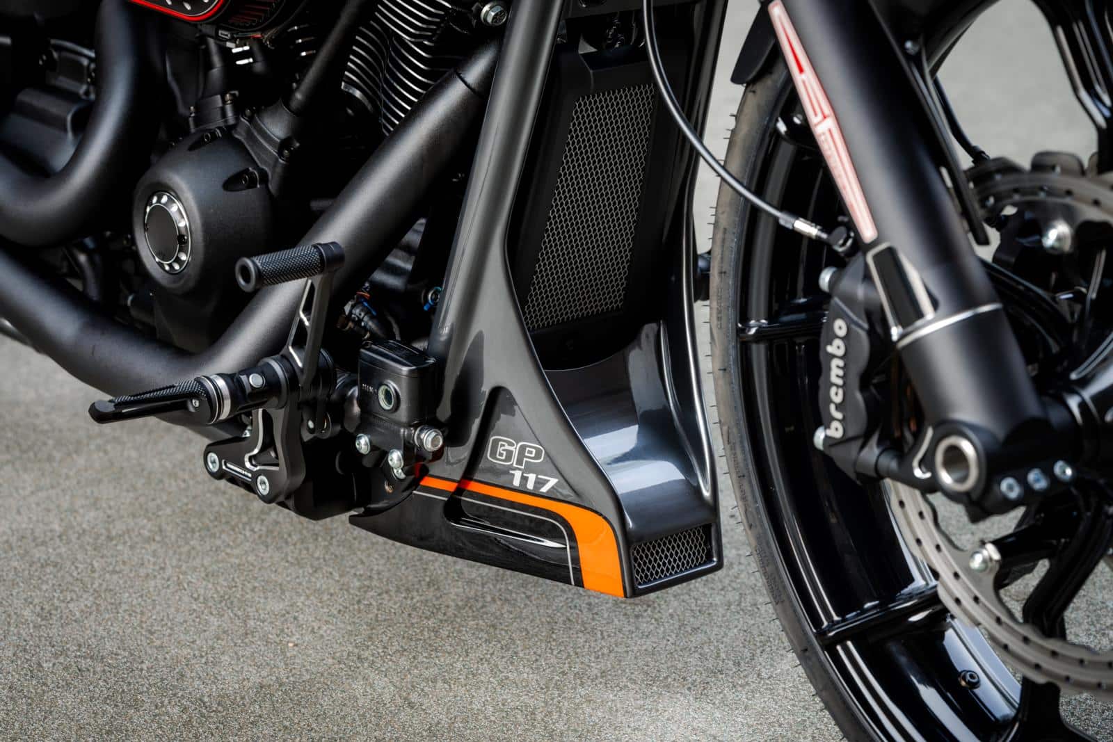 Een nieuwe koplamp kan een motor al een heel ander aangezicht geven en het ‘Windshield kit’ van Thunderbike doet dat in dit geval, in combinatie met de extra brede GP Performance kroonplaten en clip-ons, zeker. De zwarte, DLC coated, vorkpoten steken in twee GP onderpoten met venstertjes. Het 23 inch Grand Prix voorwiel is CNC gefreesd uit een massieve plaat aluminium. De bevestigingen voor de imposante 340 mm Streetmaster remschijven zijn geïntegreerd met het wiel. Voor de remcapaciteit zorgen verder twee radiaal gemonteerde Brembo vierzuiger klauwen. Het GRP-GP voorspatbord past er perfect bij. De GP clip-ons zijn uitgerust met non-slip Phantom handvatten met satin afwerking. Daaronder de Stripe knipperlichten en erboven de Motogadget spiegels. De look wordt gecompleteerd met doorboorde bicolor toppers en een (verlicht) Rebuffini keypad. Aan de linkerzijde bevindt zich de ombouw naar hydraulische bediening van de koppeling. De naar voren gemonteerde forward controls komen uit de Phantom lijn van Thunderbike en hebben eenzelfde satin afwerking.