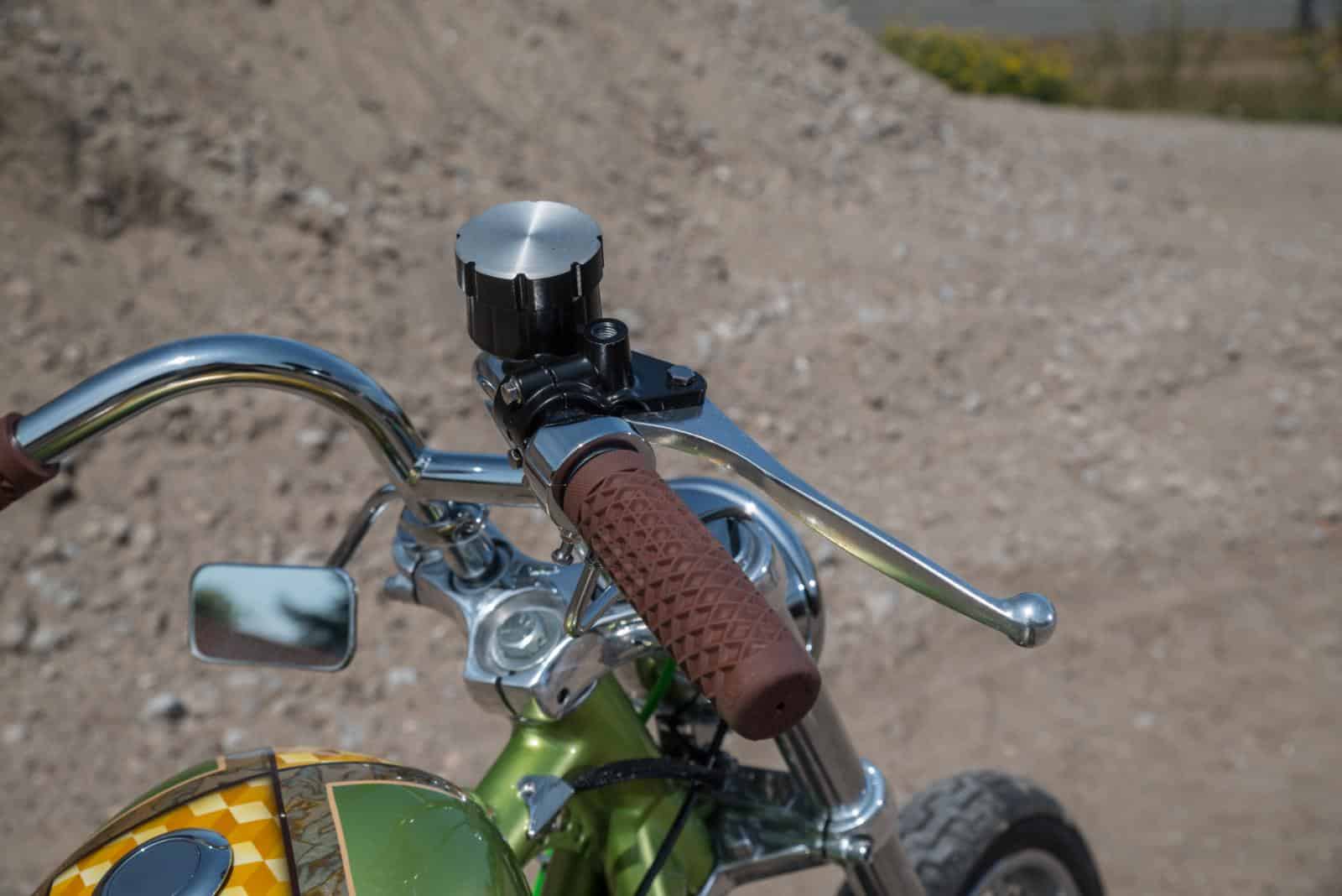 Het Sportster 883-blok bleek van alle kanten te lekken. Tijd voor nieuwe pakkingen dus. “Bij Wing Palace kreeg ik een setje 883-pakkingen mee, maar die pasten niet!” lacht Wilbert. “Wat bleek? Het blok was ooit omgebouwd naar 1200 cc. Geen idee door wie, maar ik klaag niet.” Nu het blok toch open lag, werd het meteen aangepakt. “Ik heb de onderkant geshaved, zodat het minder massief oogt. Daarna is het blok matgrijs gespoten.” De cleane bouwstijl loopt als een rode draad door het hele project. Het stuur is zo kaal mogelijk gehouden: alleen een gashendel en voorrem. De kabels zijn strak door het stuur en frame geleid. Geschakeld wordt met een jockey-shift en voetkoppeling van Prism Supply uit Amerika. “Bij mijn choppers vind ik het zadel en de uitlaat eigenlijk het belangrijkst. De uitlaat moest echt vloeiend lopen en ik heb ’m drie keer opnieuw gemaakt voordat ik tevreden was. En het zadel? Dat moest af zijn vóór ik überhaupt over kleur ging nadenken.” De bekleding werd verzorgd door Marcel Miller, die voorstelde om het ruitjesthema ook hier terug te laten komen.