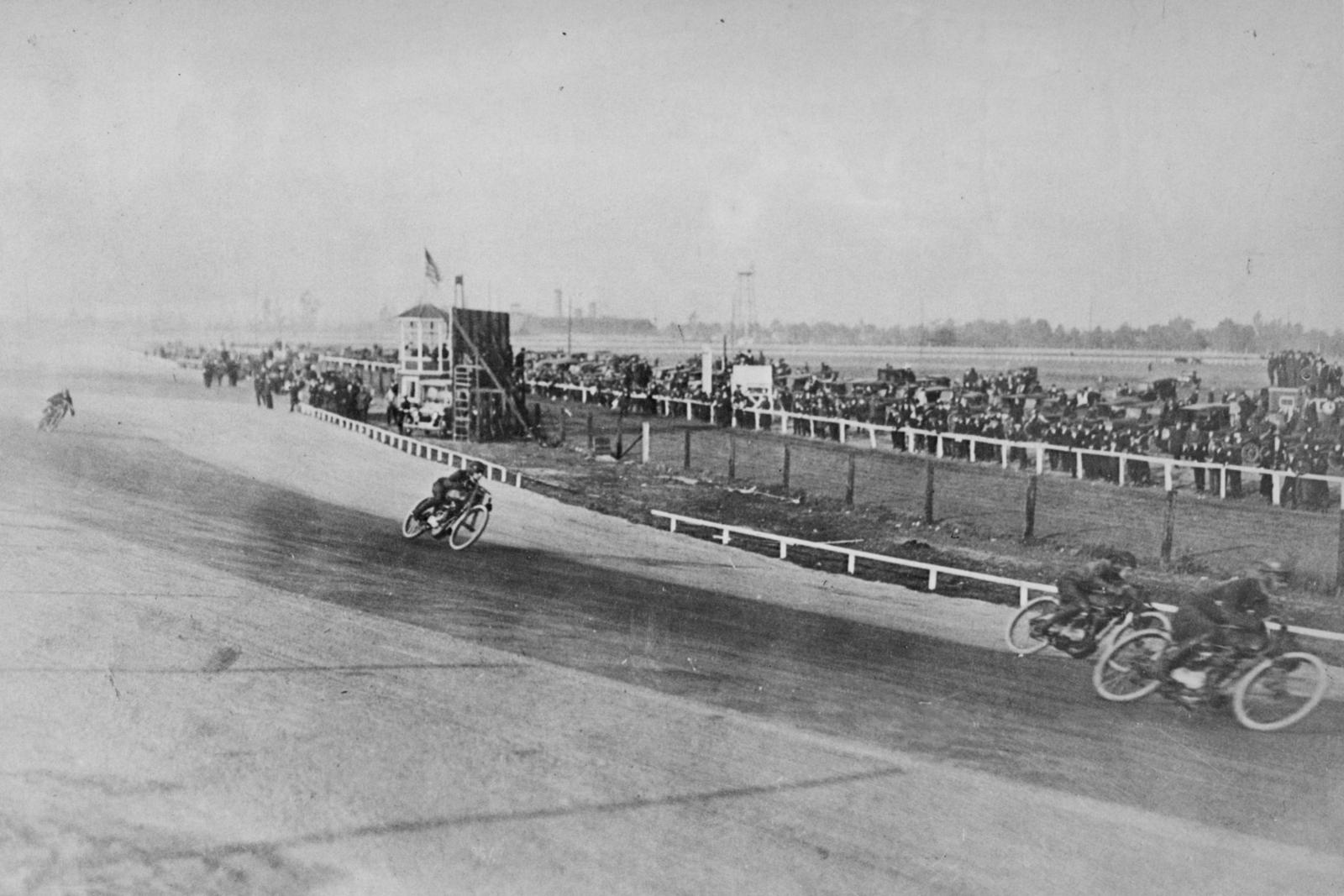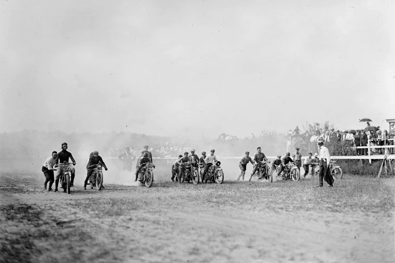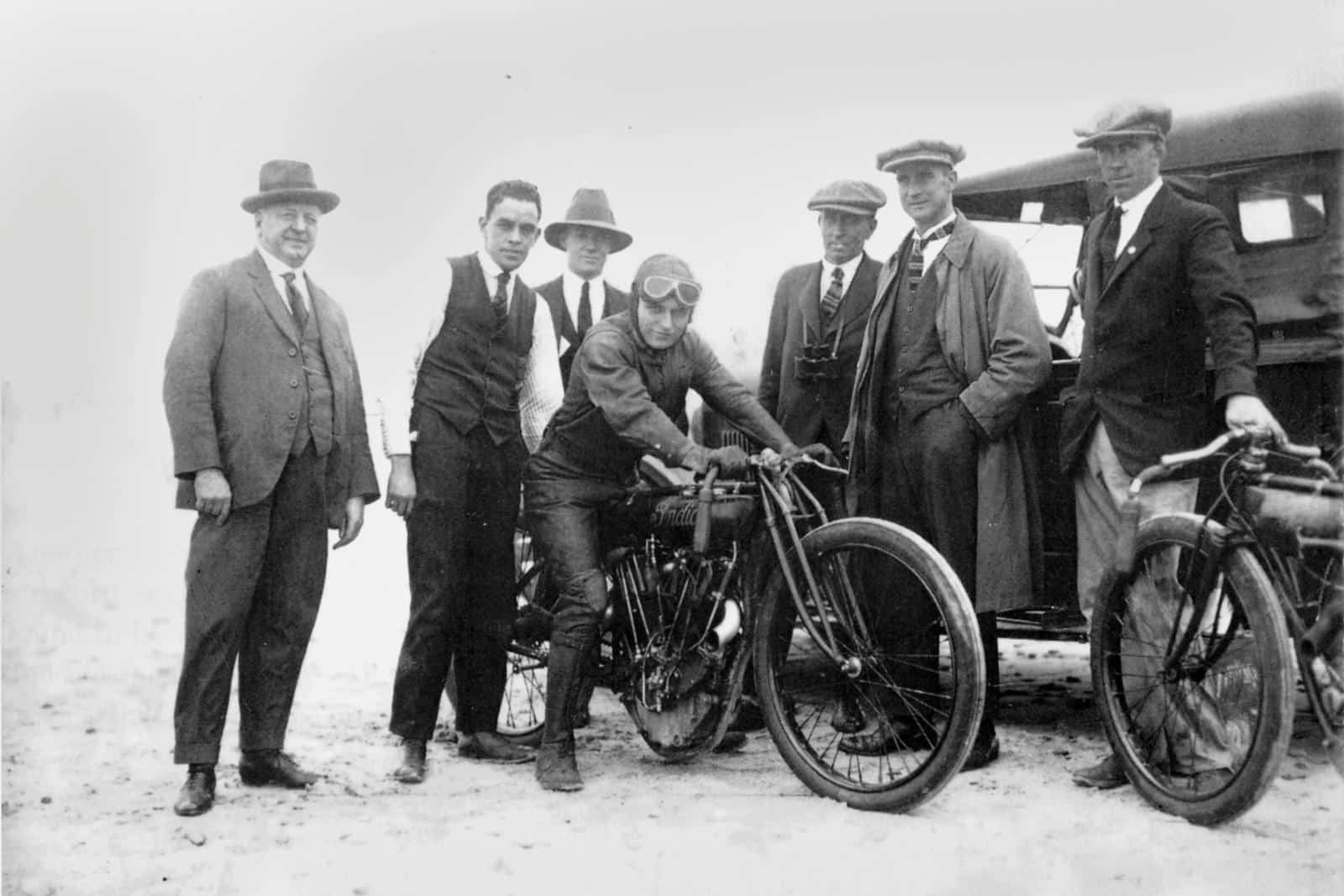 Tijdens de Labor Day van 1916 reed Paul Anderson – tweede van rechts – zijn eerste race in Benning op een 1000cc V-twin Excelsior.