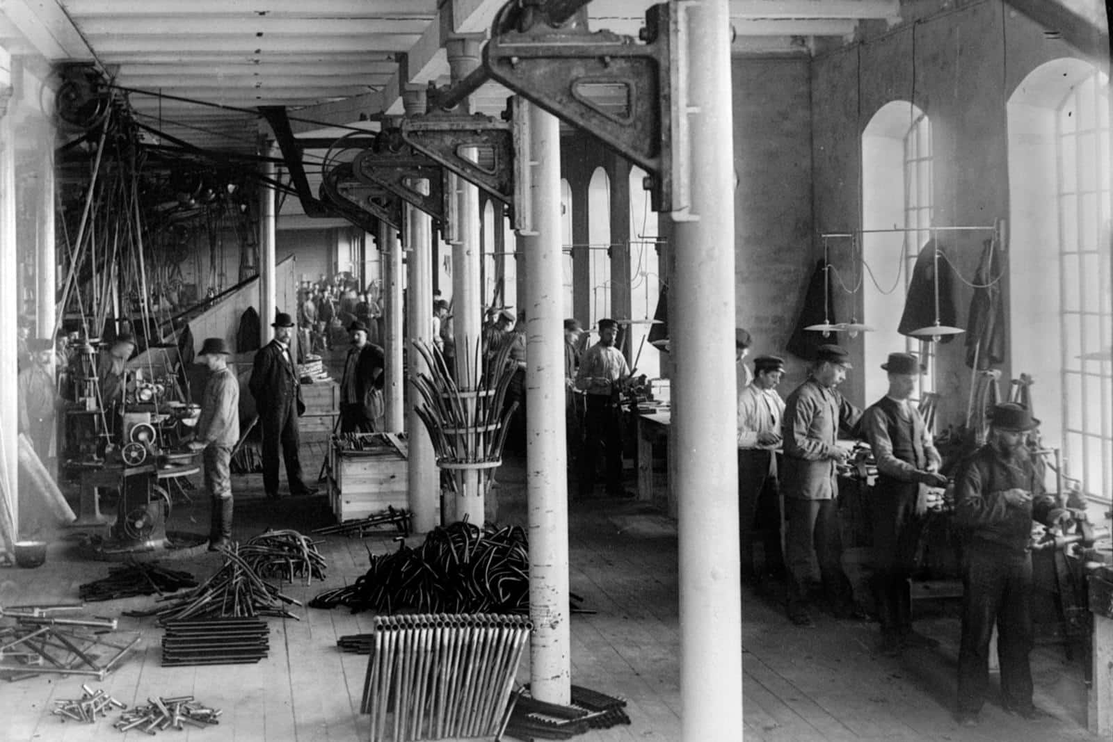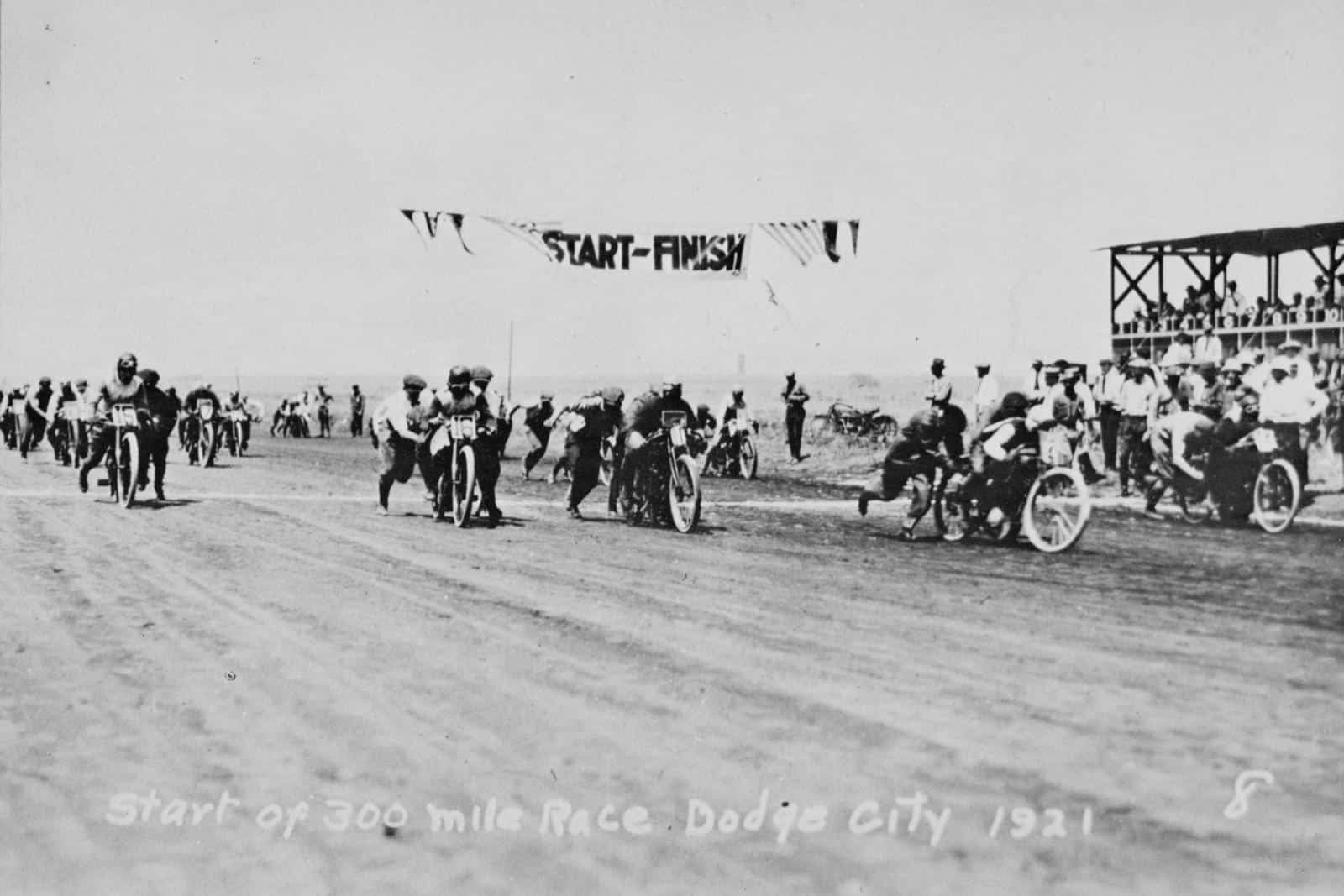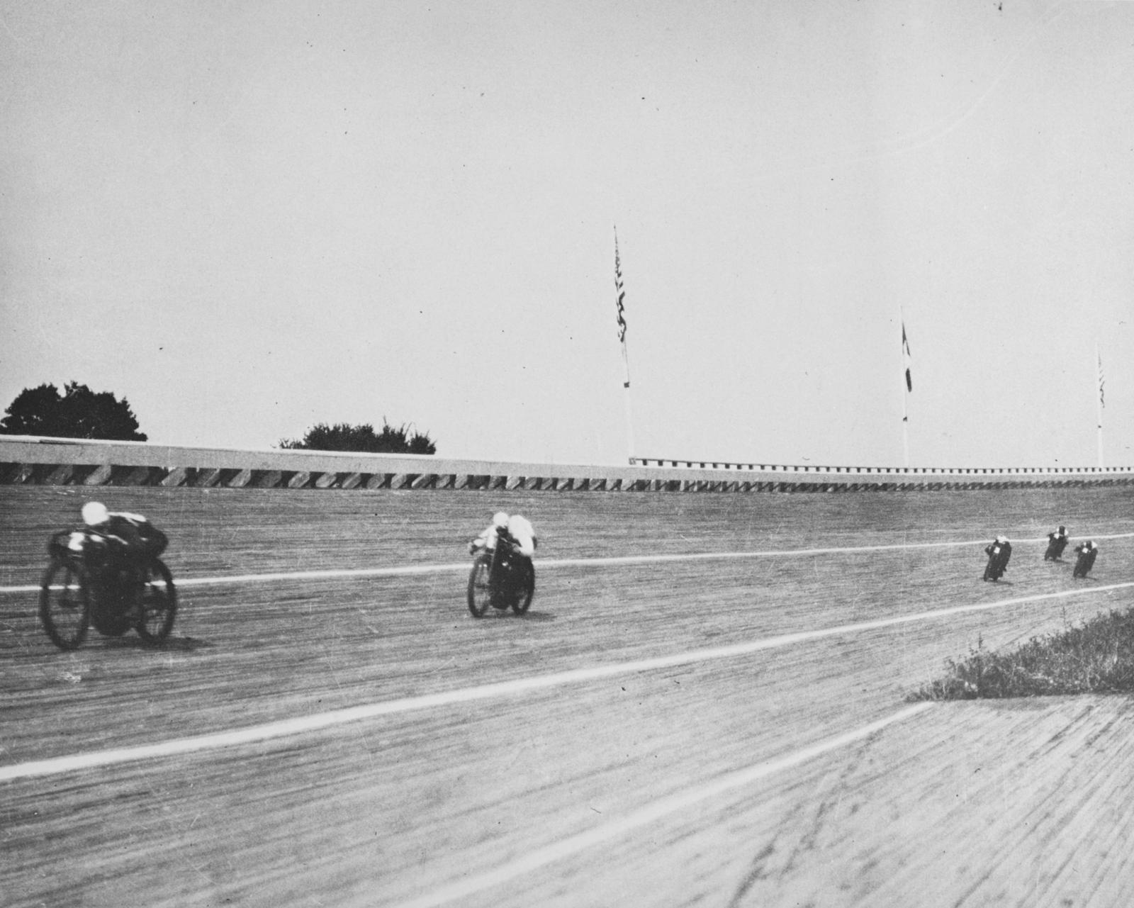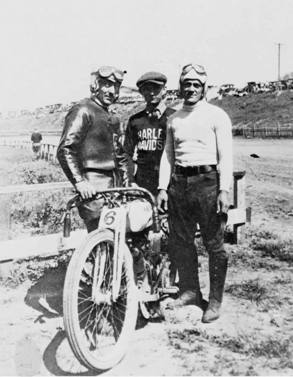 Tijdens de Labor Day van 1916 reed Paul Anderson – tweede van rechts – zijn eerste race in Benning op een 1000cc V-twin Excelsior.