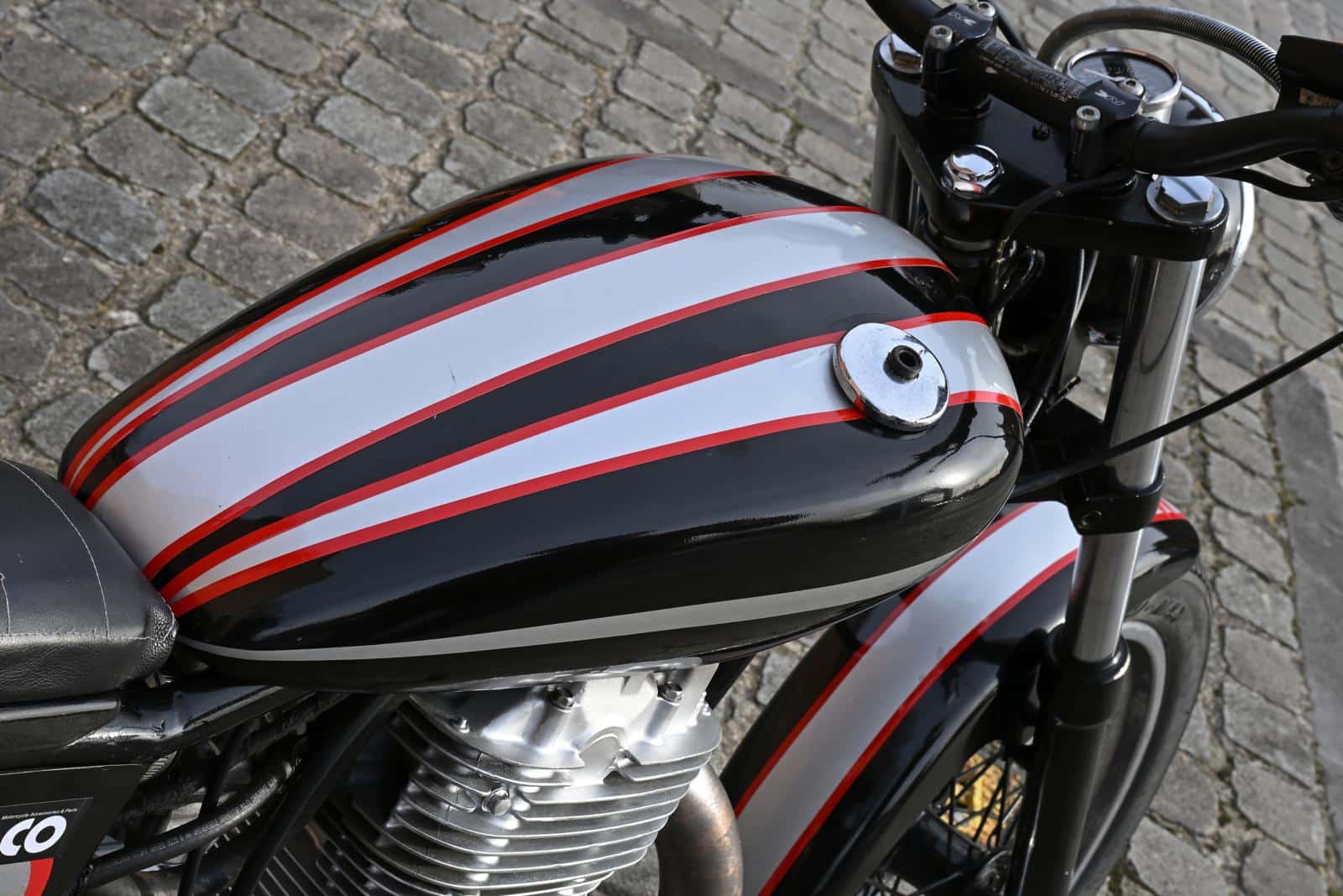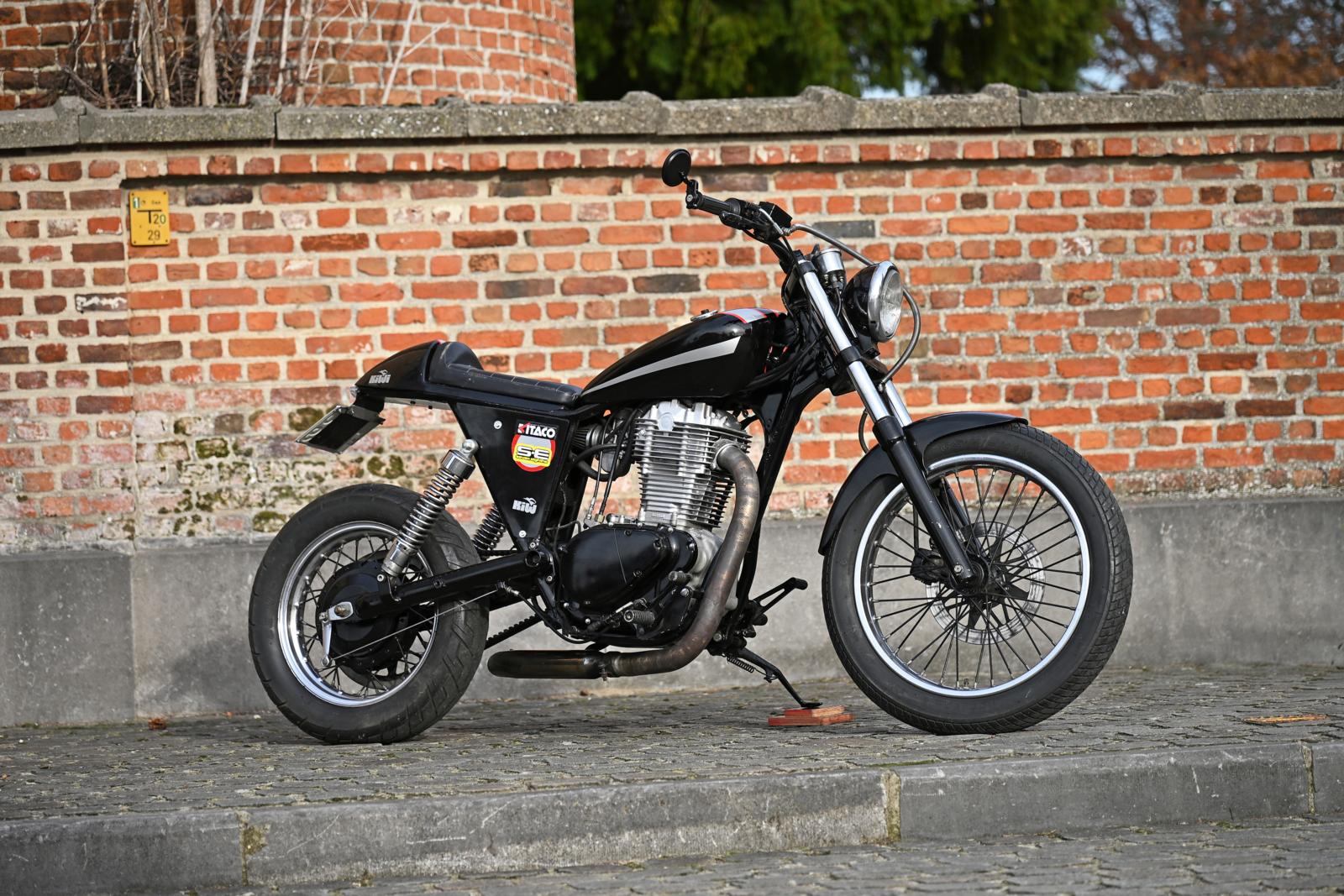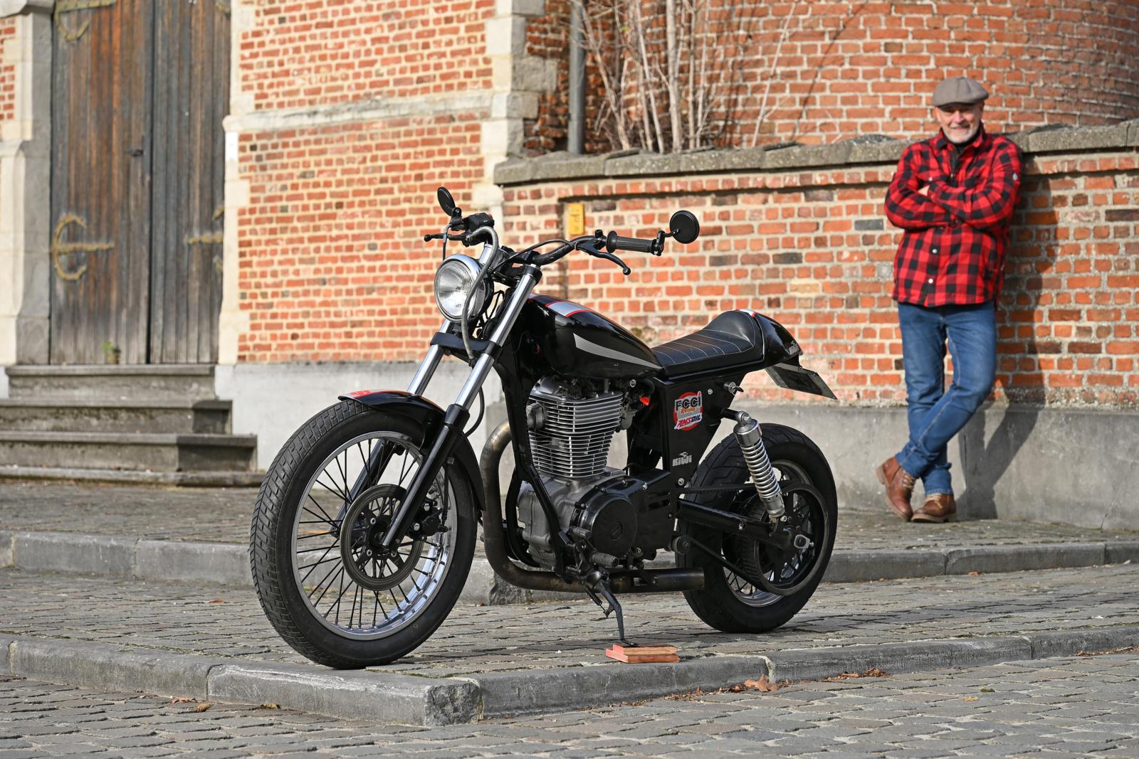 Voor de opbouw van zijn scrambler gebruikte Andy zowat alles wat enigszins bruikbaar of passend gemaakt kon worden uit zijn arsenaal haveloze onderdelen. “Door het gebruik van op het eerste zicht totaal onlogische onderdelen zal je met stelligheid nergens iets vergelijkbaars aantreffen”, lacht Andy. “Zo is de benzinetank afkomstig van een Honda CM 200 uit de jaren tachtig, ooit aangekocht per drie voor amper 300 euro. Voor de ontbrekende tankdop moest ik dan wel zelf een oplossing uitdokteren. Het zadel heb ik meegebracht van een swapmeet in Marche-en-Famenne voor een luttele 30 euro. De koplamp stond oorspronkelijk op de bouwvallige Sarolea die in mijn mancave bivakkeert. Daar wordt af en toe wel eens iets bruikbaars afgevezen. Het tellertje heb ik van een eerder aangekochte Honda 750 caféracer afgehaald. De spiegeltjes zijn aangekocht bij de caféracer webshop. Het spuitwerk heb ik met het pistool aangebracht met verf uit de Action. Die heeft me minder dan 15 euro per pot gekost. De grijze Avery tank wrap is van topkwaliteit en speciaal ontworpen voor gebruik op complexe oppervlaktes, zoals benzinetanks. De wrap was makkelijk te buigen, maar de techniek voor het aanbrengen bleek niet zo simpel als verwacht. Het eindresultaat is een prettig sturend machientje. Helaas kan het vehikel zijn chopper DNA niet verloochenen, want telkens wanneer het amusement begint, voel je de achterkant tegenpruttelen. De standaard krachtbron bleef ongewijzigd. Een blokje met amper 34 paardenkrachten tunen zou hoogstwaarschijnlijk weinig vuurwerk opleveren. Dat is op zich geen onoverkomelijke ramp. Door een uitwas aan trajectcontroles is het in België afgelopen met de spielerei.”