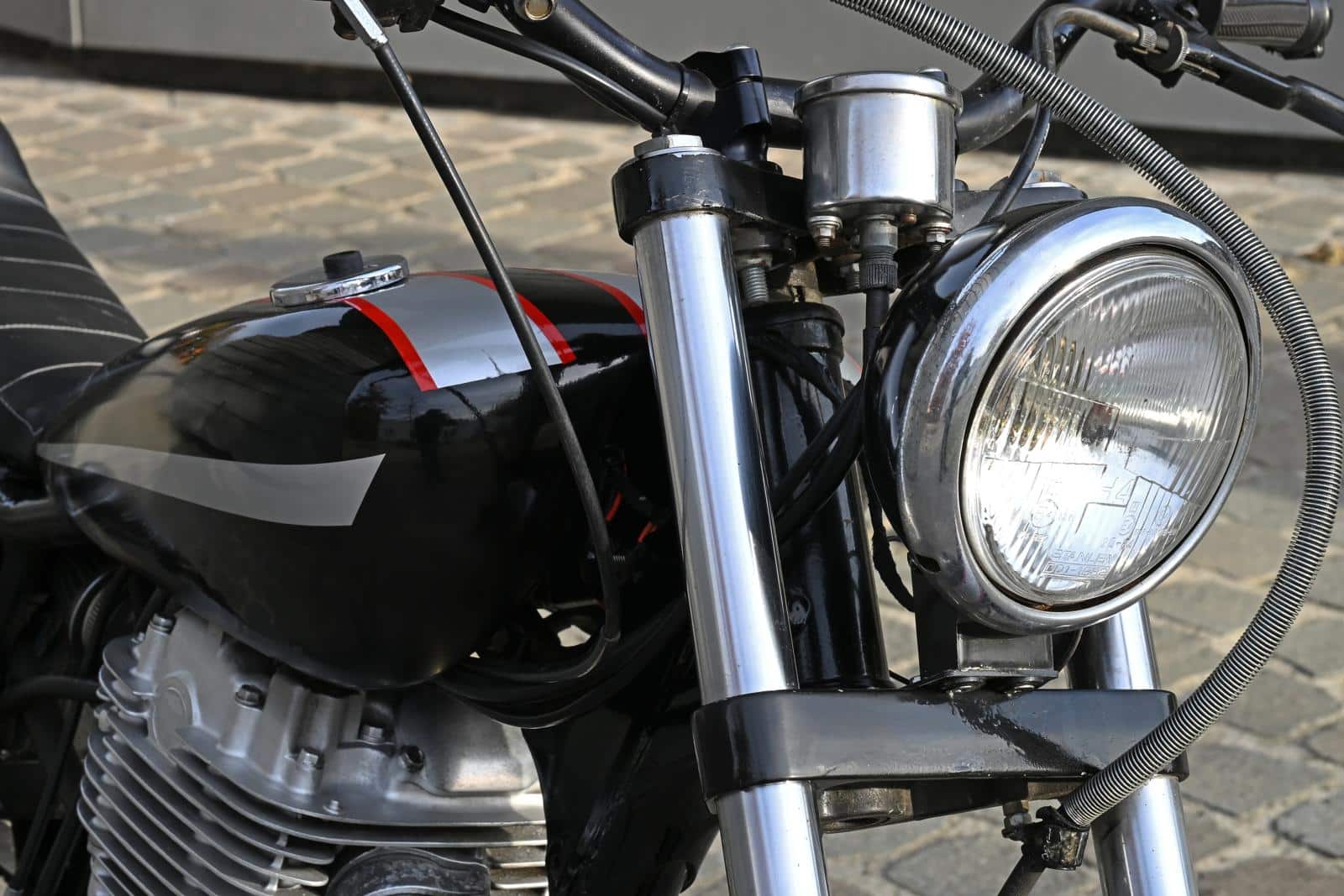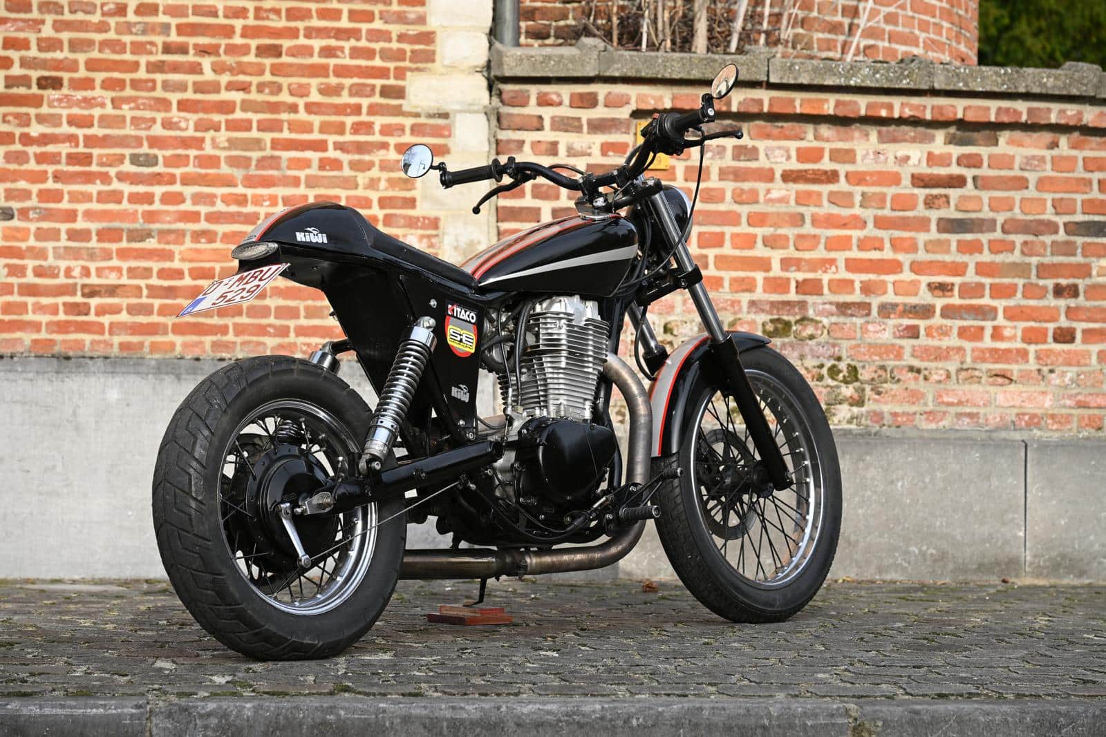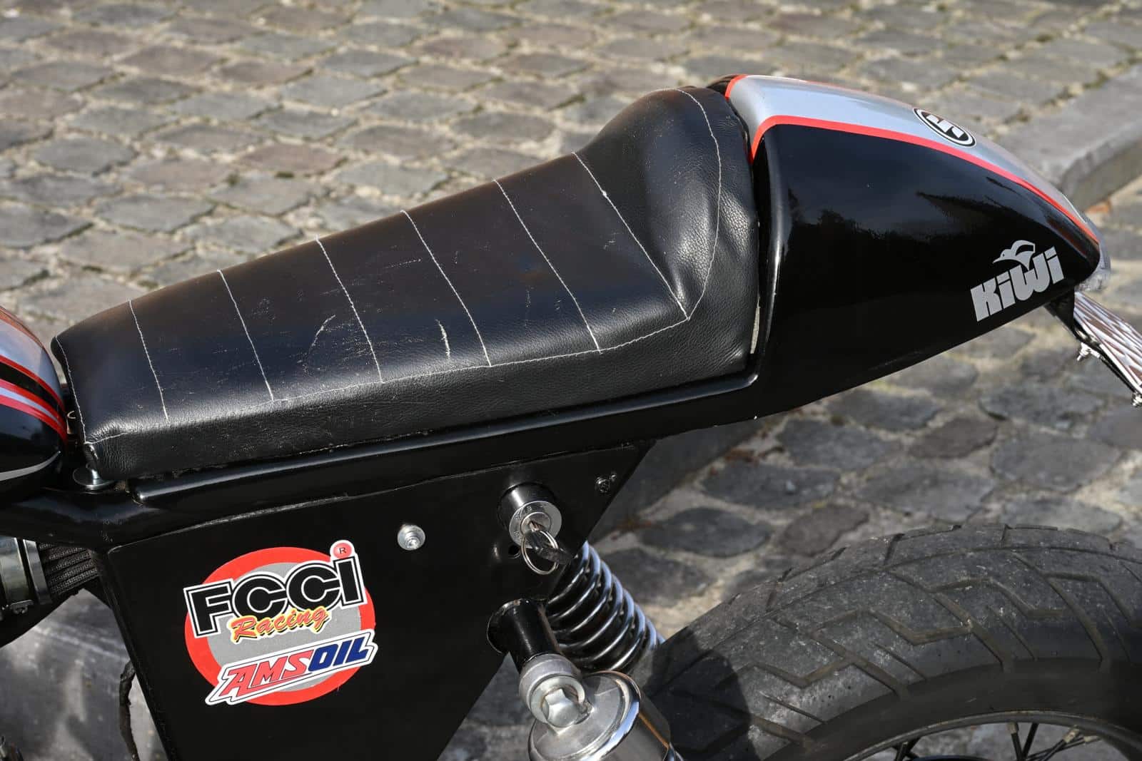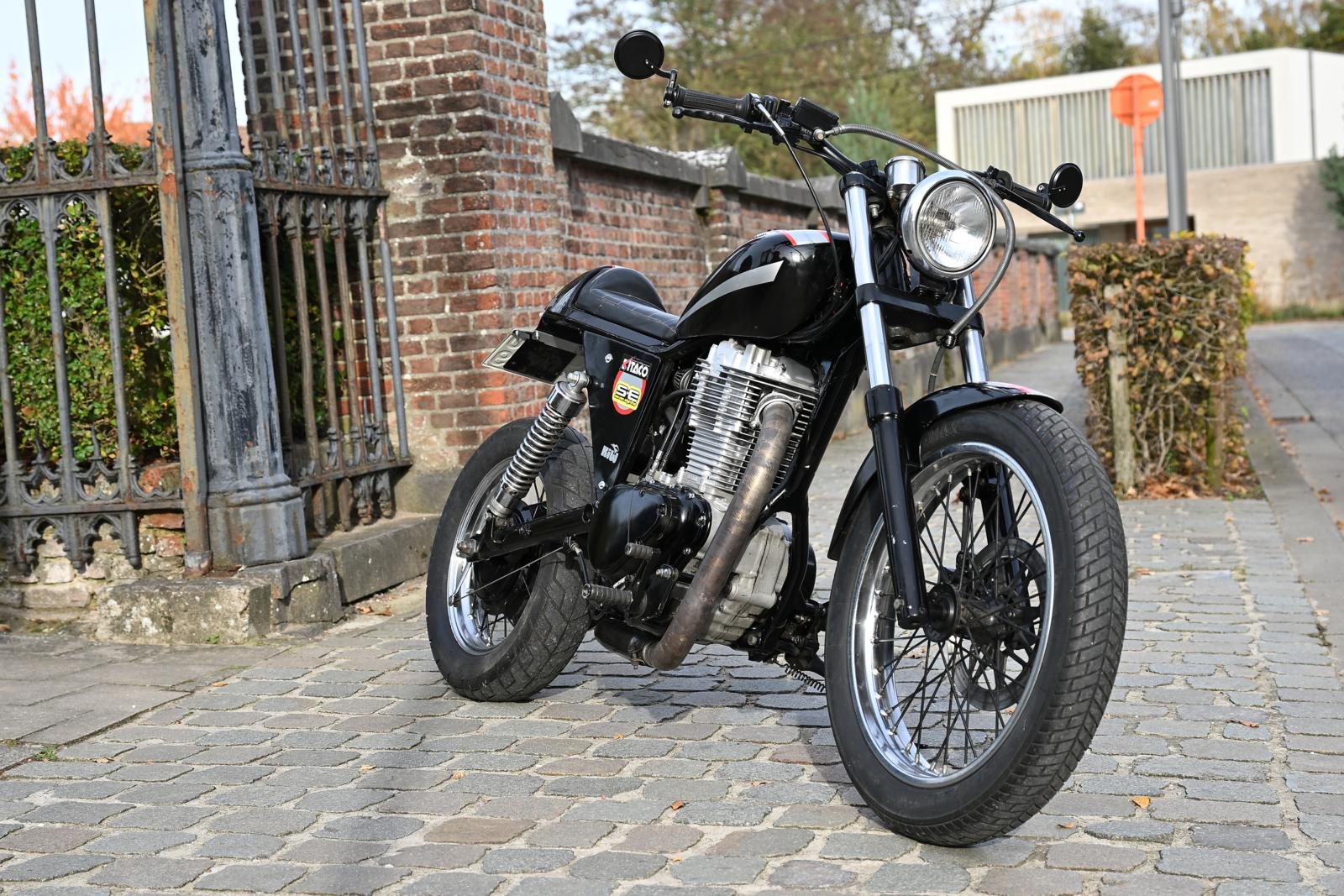 Voor de opbouw van zijn scrambler gebruikte Andy zowat alles wat enigszins bruikbaar of passend gemaakt kon worden uit zijn arsenaal haveloze onderdelen. “Door het gebruik van op het eerste zicht totaal onlogische onderdelen zal je met stelligheid nergens iets vergelijkbaars aantreffen”, lacht Andy. “Zo is de benzinetank afkomstig van een Honda CM 200 uit de jaren tachtig, ooit aangekocht per drie voor amper 300 euro. Voor de ontbrekende tankdop moest ik dan wel zelf een oplossing uitdokteren. Het zadel heb ik meegebracht van een swapmeet in Marche-en-Famenne voor een luttele 30 euro. De koplamp stond oorspronkelijk op de bouwvallige Sarolea die in mijn mancave bivakkeert. Daar wordt af en toe wel eens iets bruikbaars afgevezen. Het tellertje heb ik van een eerder aangekochte Honda 750 caféracer afgehaald. De spiegeltjes zijn aangekocht bij de caféracer webshop. Het spuitwerk heb ik met het pistool aangebracht met verf uit de Action. Die heeft me minder dan 15 euro per pot gekost. De grijze Avery tank wrap is van topkwaliteit en speciaal ontworpen voor gebruik op complexe oppervlaktes, zoals benzinetanks. De wrap was makkelijk te buigen, maar de techniek voor het aanbrengen bleek niet zo simpel als verwacht. Het eindresultaat is een prettig sturend machientje. Helaas kan het vehikel zijn chopper DNA niet verloochenen, want telkens wanneer het amusement begint, voel je de achterkant tegenpruttelen. De standaard krachtbron bleef ongewijzigd. Een blokje met amper 34 paardenkrachten tunen zou hoogstwaarschijnlijk weinig vuurwerk opleveren. Dat is op zich geen onoverkomelijke ramp. Door een uitwas aan trajectcontroles is het in België afgelopen met de spielerei.”
