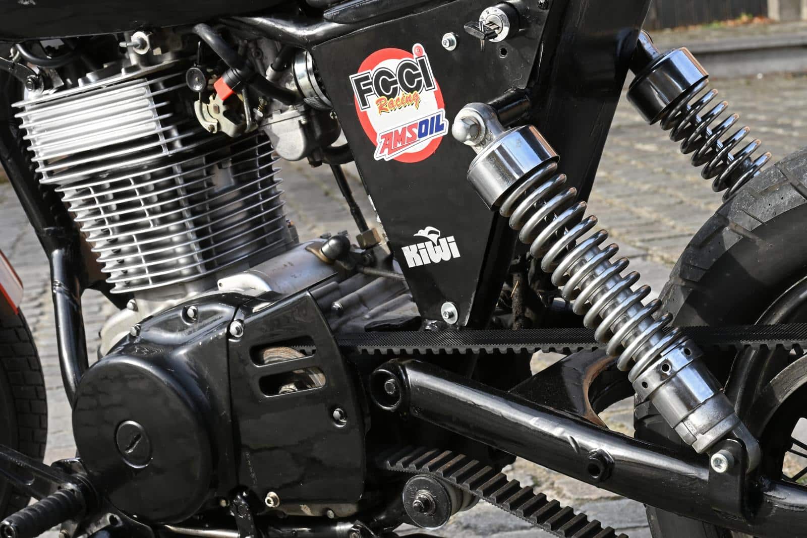 Na demontage werd het stalen frame verzaagd en gelast. Met de lange, van een oubollige Suzuki TS400 afkomstige schokdempers, heeft de gestationeerde scrambler een vrij hoge achtersteven. “De veren zijn iets te schuin en de bovenste bevestigingspunten wellicht iets te laag opgelast, maar om dat achteraf nog te wijzigen had ik geen goesting”, geeft Andy toe. “Van zodra er iemand in het zadel zit valt het overigens best mee. Daar moest ik natuurlijk rekening mee houden om de juiste spanning voor de riemaandrijving te bekomen. Onbemand sleept de riem een beetje, maar wanneer er iemand op de motor zit is de spanning perfect afgesteld. In Amerika worden er kits met kettingaandrijving aangeboden. Die schijnen behoorlijk duur te zijn en dat druist in tegen mijn oldskool basisprincipes. Door de stevige eencilinder compressie remt de machine gelukkig goed af op de motor, want met de gedateerde enkele schijf heeft de scrambler zowat dezelfde stopkracht als een Ford-T uit de aanhef van vorige eeuw. Ach, misschien steek ik er in een volgend stadium gewoon fatsoenlijke Brembo’s op.” De schrale selfmade uitlaat kronkelt zich met sportieve intenties naar de linker onderkant van de motor. Omdat eencilinders nog wel eens stevig kunnen kletteren werd er omwille van de demping binnenin de uitlaat een tweede buis gelast. Dat resulteert in een sportief, doch zeer acceptabel geblaf. De luchtfilter die standaard in een vierkante behuizing zit werd vervangen door een bij Amazon aangekocht universeel exemplaar. De perfecte fine-tuning vergde achteraf redelijk wat tijd.