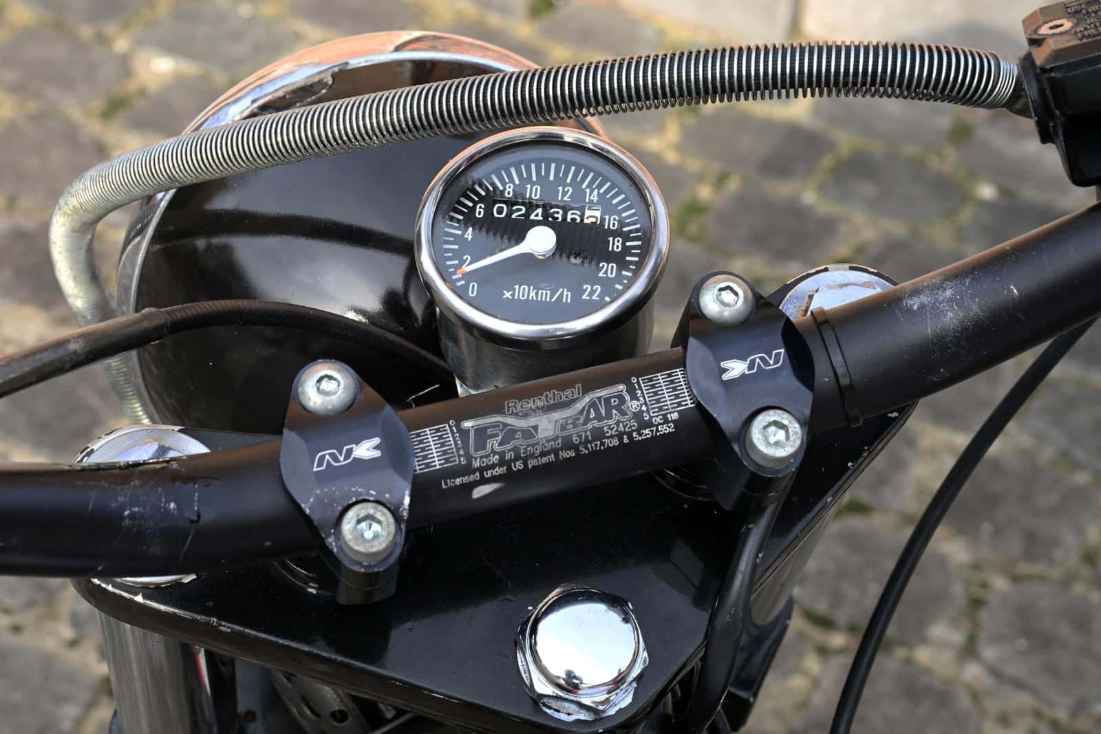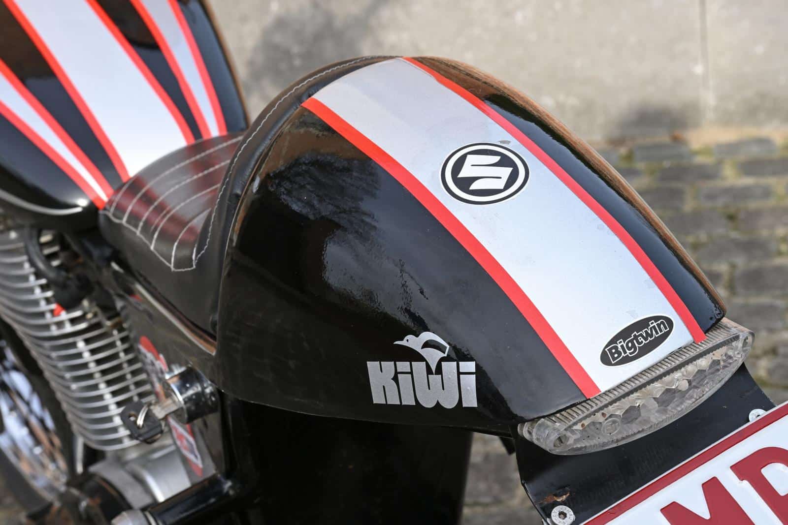 Andy vertelt enthousiast verder: “Op mijn schappen heb ik een enorme stock aan afgeschreven onderdelen liggen. Gerecupereerd uit voormalige projecten of gewoon doelloos aangesleept uit oldtimerbeurzen zoals Wieze of Veteraanmotoren Houtland te Roeselare. Verder ben ik op het internet steeds op zoek naar afdankertjes die dikwijls voor een paar honderd euro mee te scharrelen zijn. Zo kwam ik in Nederland, dicht tegen de Belgische grens, een Savage op het spoor. Een aartslelijk zwart gespoten en tot ratbike verbouwd gedrocht, dat bij zijn eigenares al jarenlang stilstond. Initieel vroeg ze er 500 euro voor, maar voor een luttele 400 euro had ik enige tijd later de deal rond. Aanvankelijk wou ik de Japanner gebruiken als reservedonor voor een eerder gebouwde caféracer. Bij thuiskomst kreeg ik het motorblokje tot mijn verwondering vrij makkelijk opgestart. Het zoemde letterlijk als vanouds. In die periode zag ik in de buurt van Zolder promotieborden voor een Speedway evenement. Dat bracht me op het idee om de eencilinder machine tot flattracker te transformeren. Mede door een gebrekkige 15 inch bandenkeuze voor dat type motoren bleek dat niet zo’n goed idee. Een bobbertje was alsnog een bruikbaar alternatief, maar helaas ben ik niet erg custom minded aangelegd. Toen ik wat later een verleidelijk plaatje van een Triumph Scrambler uit de zestigerjaren zag, was de keuze evenwel snel gemaakt. Dat zou het worden!”