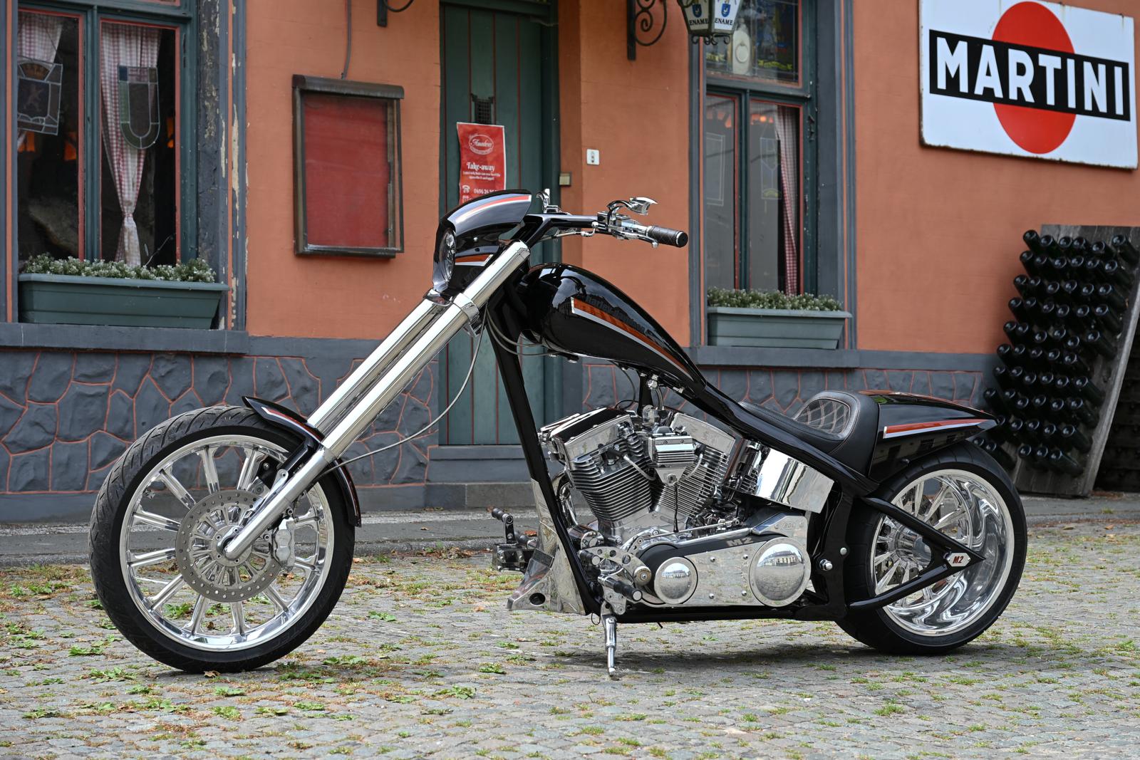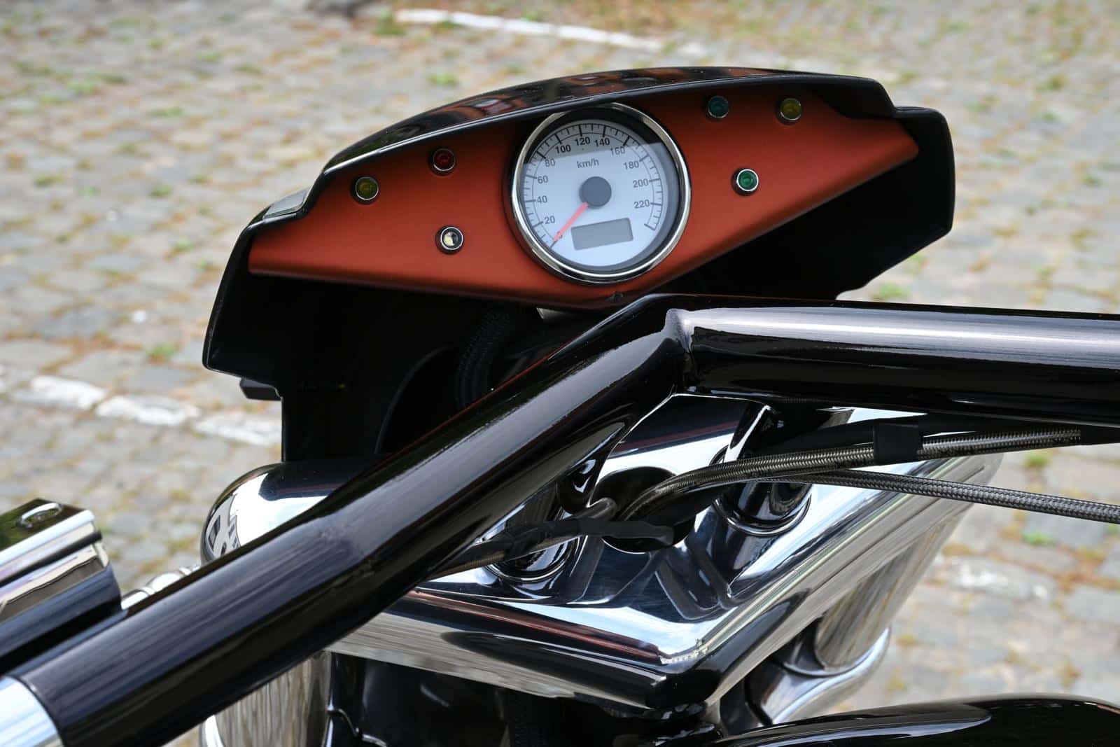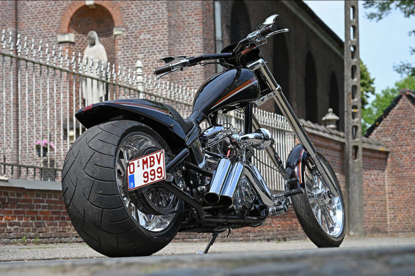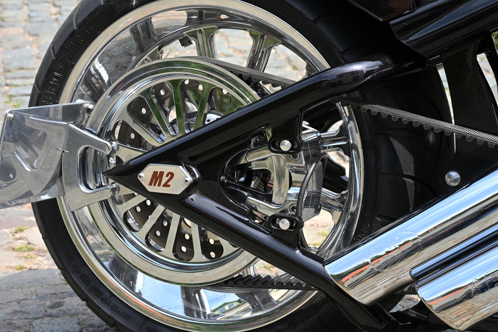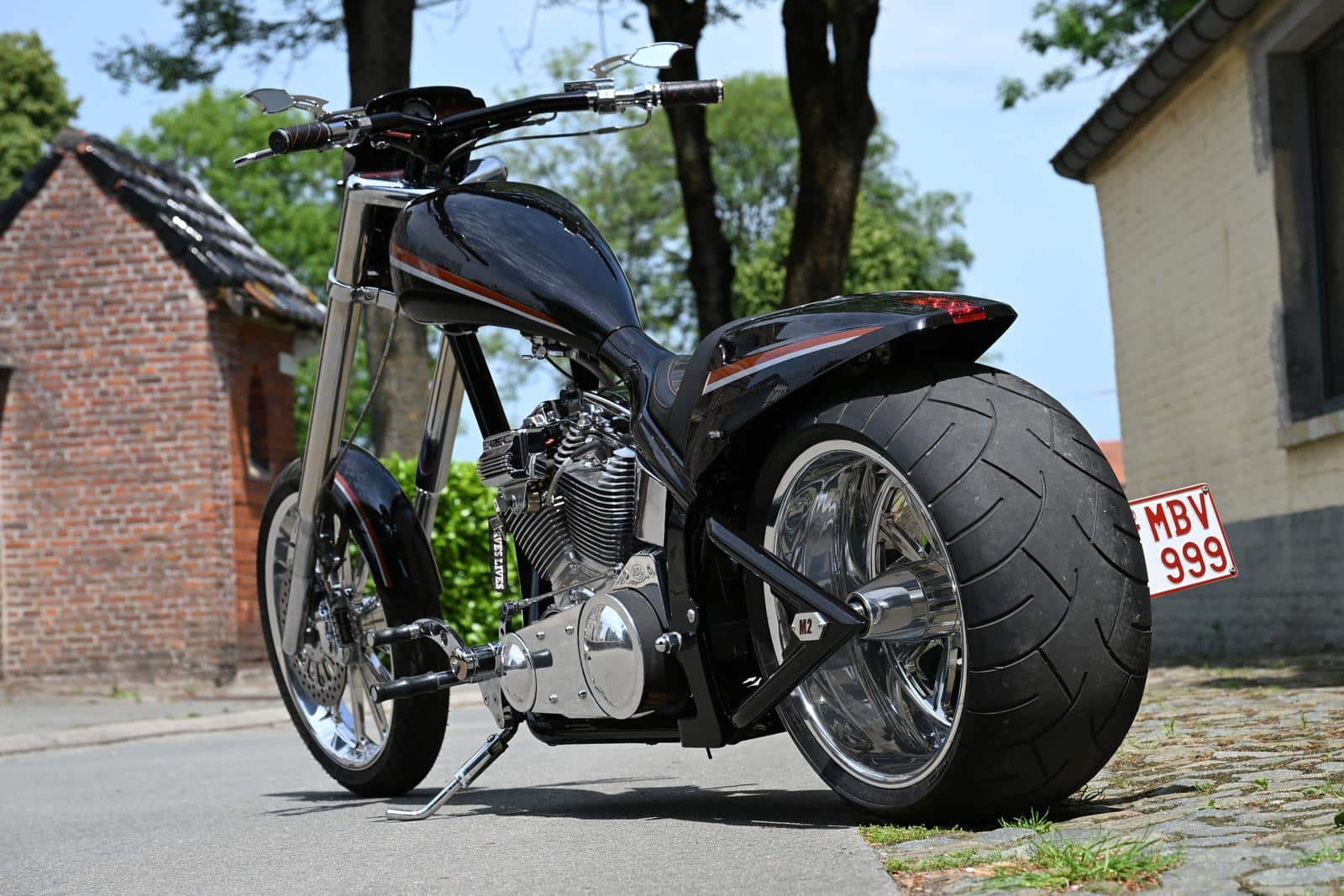 Afsluitend: “Bij de aankoop had ik eigenlijk al een zeer goede basis. Ik heb de chopper verder verbouwd zoals het reeds in mijn hoofd zat. Ik ben van origine een Pietje Precies en heb alles minutieus opgemeten. Zodoende kreeg de motor ongeveer de perfecte dimensies. Special paint was geen optie omdat dat volgens mij na een tijdje gaat vervelen. Een zwarte kleurstelling sluit beter aan op het royaal aanwezige chroom. Een hardtail tot softail verbouwen leverde geen problemen op. Integendeel. Ik heb me er een jaar lang mee geamuseerd. Mijn vrouw was in die periode minder content, vooral omdat ik ‘s avonds altijd in de garage zat. Dat is ondertussen al goedgemaakt en gelukkig is ze ontzettend motorminded. Vijfentwintig jaar geleden had ik al eens een Suzuki GSX1100 tot Streetfighter verbouwd, de M1. Bijgevolg was het niet lang zoeken naar een naam voor de highneck. Het werd dus de M2. Het bleef tussendoor zolang stil omdat ik naast de dagelijkse job ook nog drummer ben in de Rock en Blues coverband ‘Nightlife’. Dan moet je soms harde keuzes maken. De chopper is heilig voor mij, want zowat alles is zelf vervaardigd. Mijn eigen zweet en gedachtegoed zitten erin. In 2023 stond hij op de Bigtwin Bikeshow, waar ik massa’s positieve reacties kreeg. Dat deed enorm deugd. Toch is er altijd nog wel iets dat je wil veranderen. Je blijft maar bezig, de werkzaamheden stoppen nooit. Moto’s verbouwen, dat is verdorie een wreed geestige hobby.”