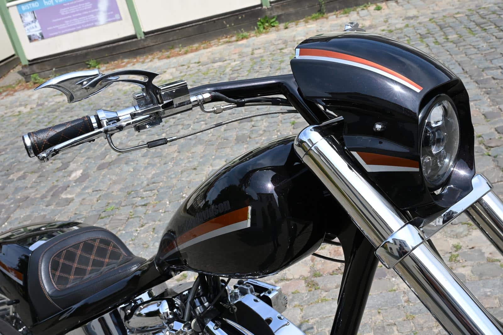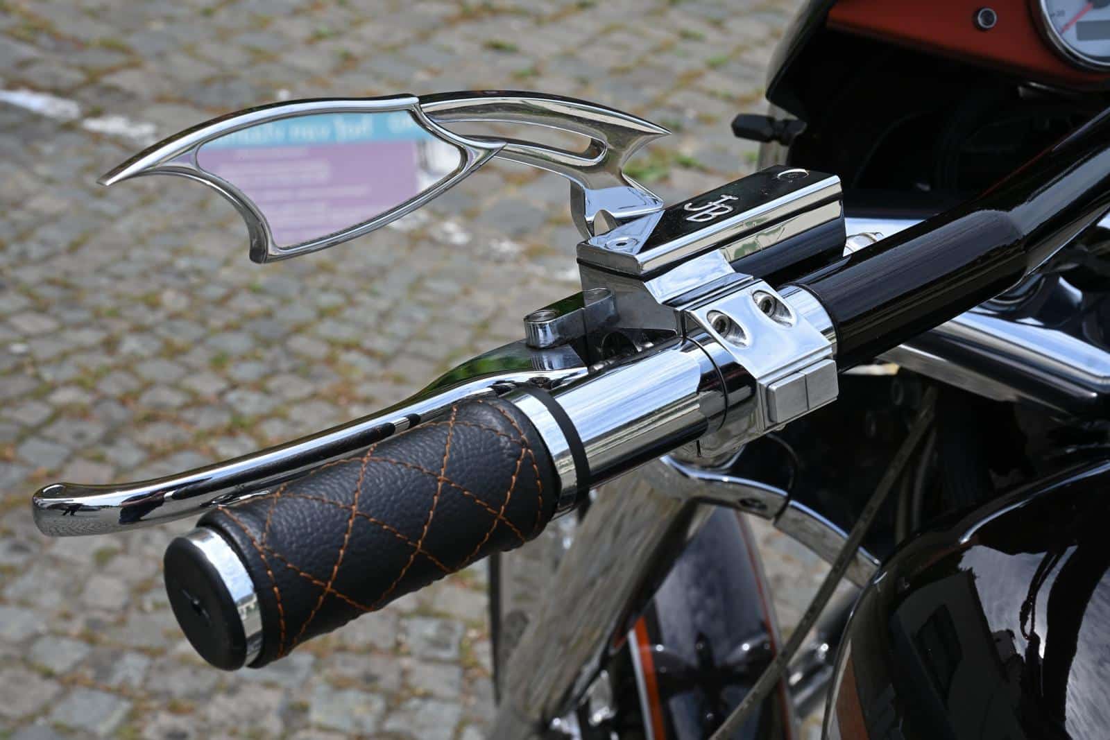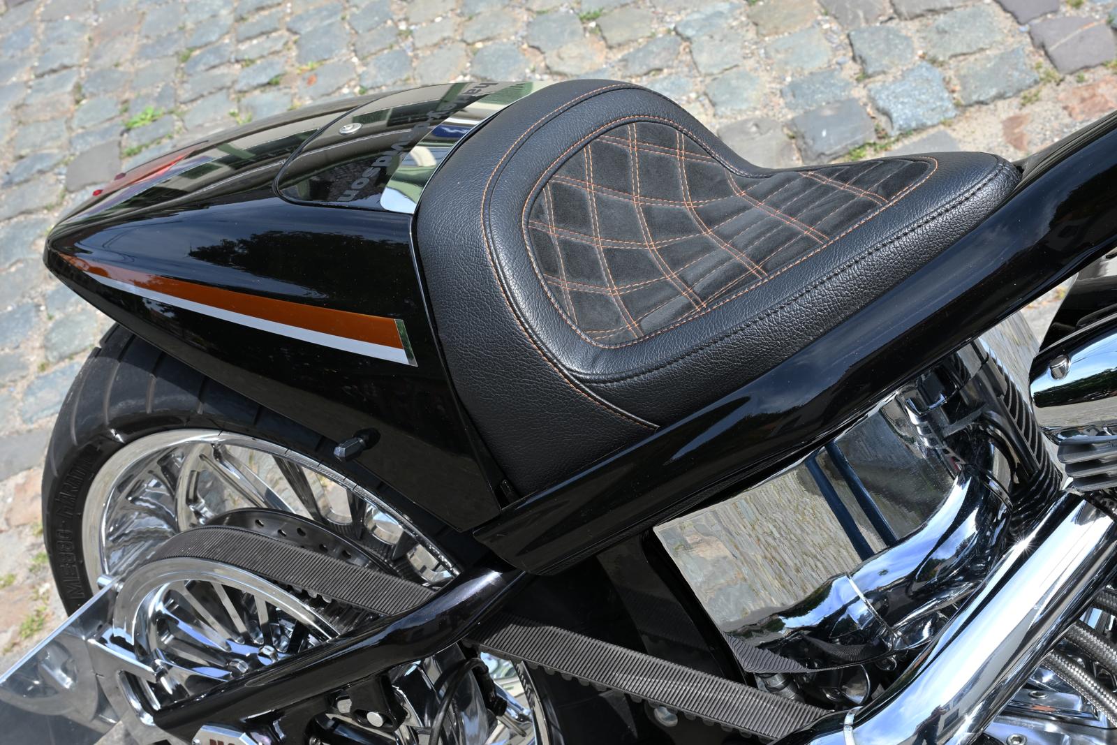 Kris: “De verchroomde, kogelvormige schijnwerper, die naar mijn goesting iets te ver vooruitsprong, werd vervangen door een Zodiac koplamp met Motea kuipje. Het selfmade stuur is voor een comfortabele zithouding wat naar achter geplooid en gespoten met dezelfde flakes als het koetswerk. De verchroomde handvatten met pinnen vond ik nogal kitscherig. Ze zijn vervangen door lederen covertjes die bij Topstich Garage gemaakt werden in hetzelfde leder als dat van het zadel. Ik vond niks naar mijn gading en heb de bodemplaat en vulling zelf gemaakt. In het vakje achter het zadel zit een Motogadget Mo unit met het formaat van een pakje sigaretten. Deze maakt armdikke kabelbomen en mechanische relais overbodig en er zit een track en trace op. Het voorspatbord heb ik volgens eigen inzicht versmald en ingekort. Achteraan zit er een V-Rod fender op, dat ideetje heb ik van internet geplukt. Een kameraad van mij had er zelfs eentje op overschot liggen. Het monteren van de aangekochte uitlaten was een ander verhaal, want ze kwamen in conflict met de ronde olietank. Alles was al gepolierd, dus dat was eventjes vloeken natuurlijk. Een originele, afgeronde Softail tank met stopsel onder het zadel bracht gelukkig licht in de duisternis. Zodoende had ik redelijk wat stukken over, maar dat is niet erg. ‘Een beetje verlies heb je altijd’, is mijn lijfspreuk. Bij verbouwingen smijt ik trouwens nooit iets weg, dat komt later ooit wel eens van pas.”