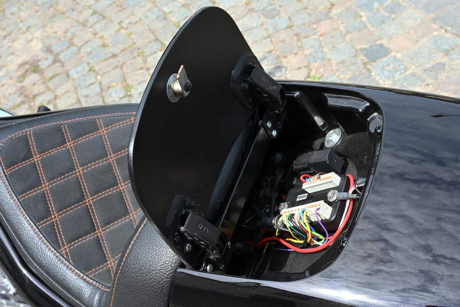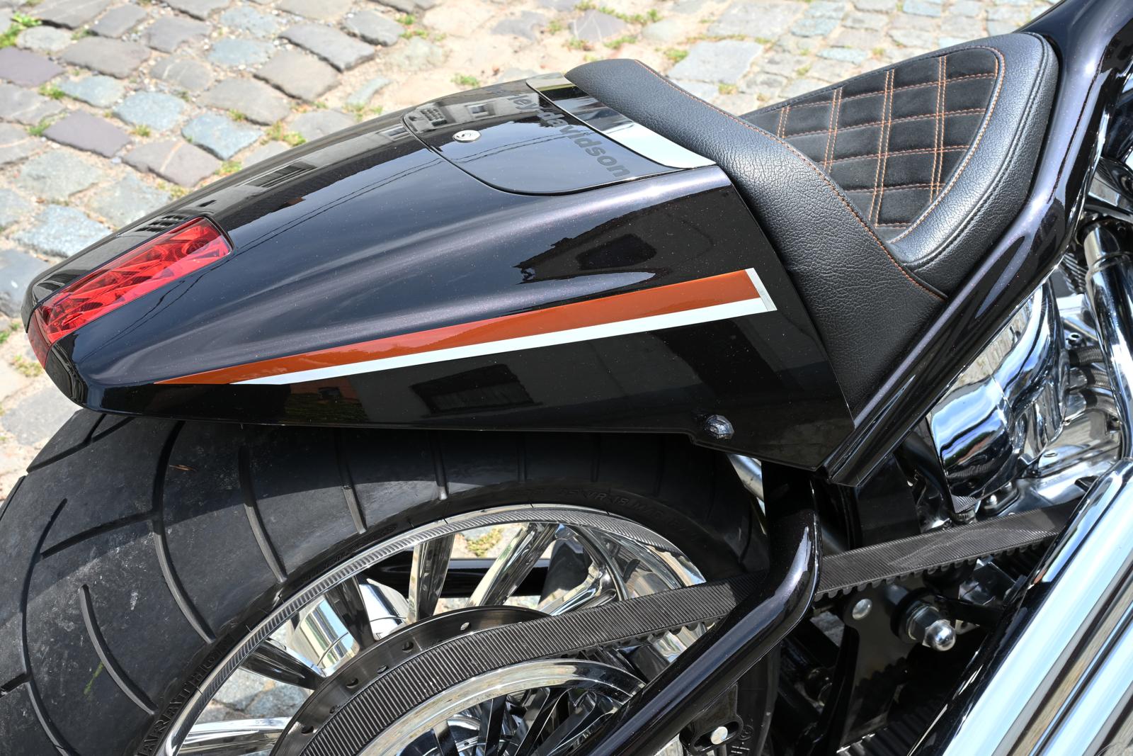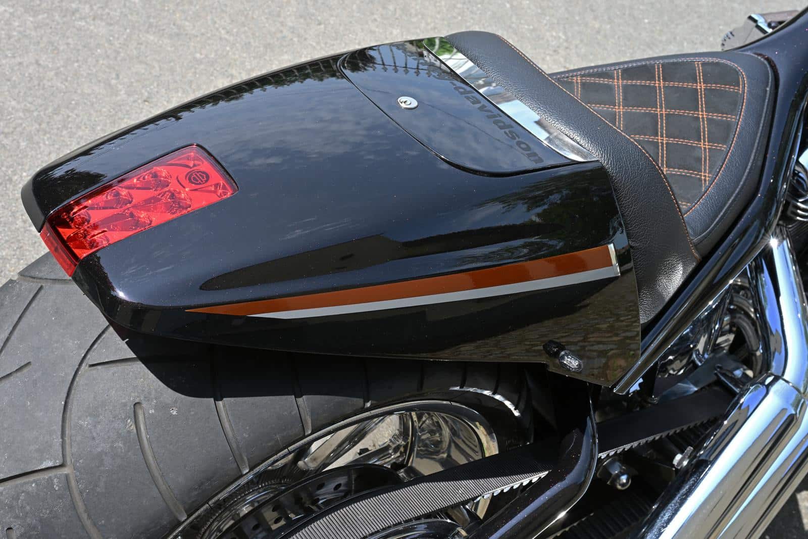 Kris: “De verchroomde, kogelvormige schijnwerper, die naar mijn goesting iets te ver vooruitsprong, werd vervangen door een Zodiac koplamp met Motea kuipje. Het selfmade stuur is voor een comfortabele zithouding wat naar achter geplooid en gespoten met dezelfde flakes als het koetswerk. De verchroomde handvatten met pinnen vond ik nogal kitscherig. Ze zijn vervangen door lederen covertjes die bij Topstich Garage gemaakt werden in hetzelfde leder als dat van het zadel. Ik vond niks naar mijn gading en heb de bodemplaat en vulling zelf gemaakt. In het vakje achter het zadel zit een Motogadget Mo unit met het formaat van een pakje sigaretten. Deze maakt armdikke kabelbomen en mechanische relais overbodig en er zit een track en trace op. Het voorspatbord heb ik volgens eigen inzicht versmald en ingekort. Achteraan zit er een V-Rod fender op, dat ideetje heb ik van internet geplukt. Een kameraad van mij had er zelfs eentje op overschot liggen. Het monteren van de aangekochte uitlaten was een ander verhaal, want ze kwamen in conflict met de ronde olietank. Alles was al gepolierd, dus dat was eventjes vloeken natuurlijk. Een originele, afgeronde Softail tank met stopsel onder het zadel bracht gelukkig licht in de duisternis. Zodoende had ik redelijk wat stukken over, maar dat is niet erg. ‘Een beetje verlies heb je altijd’, is mijn lijfspreuk. Bij verbouwingen smijt ik trouwens nooit iets weg, dat komt later ooit wel eens van pas.”