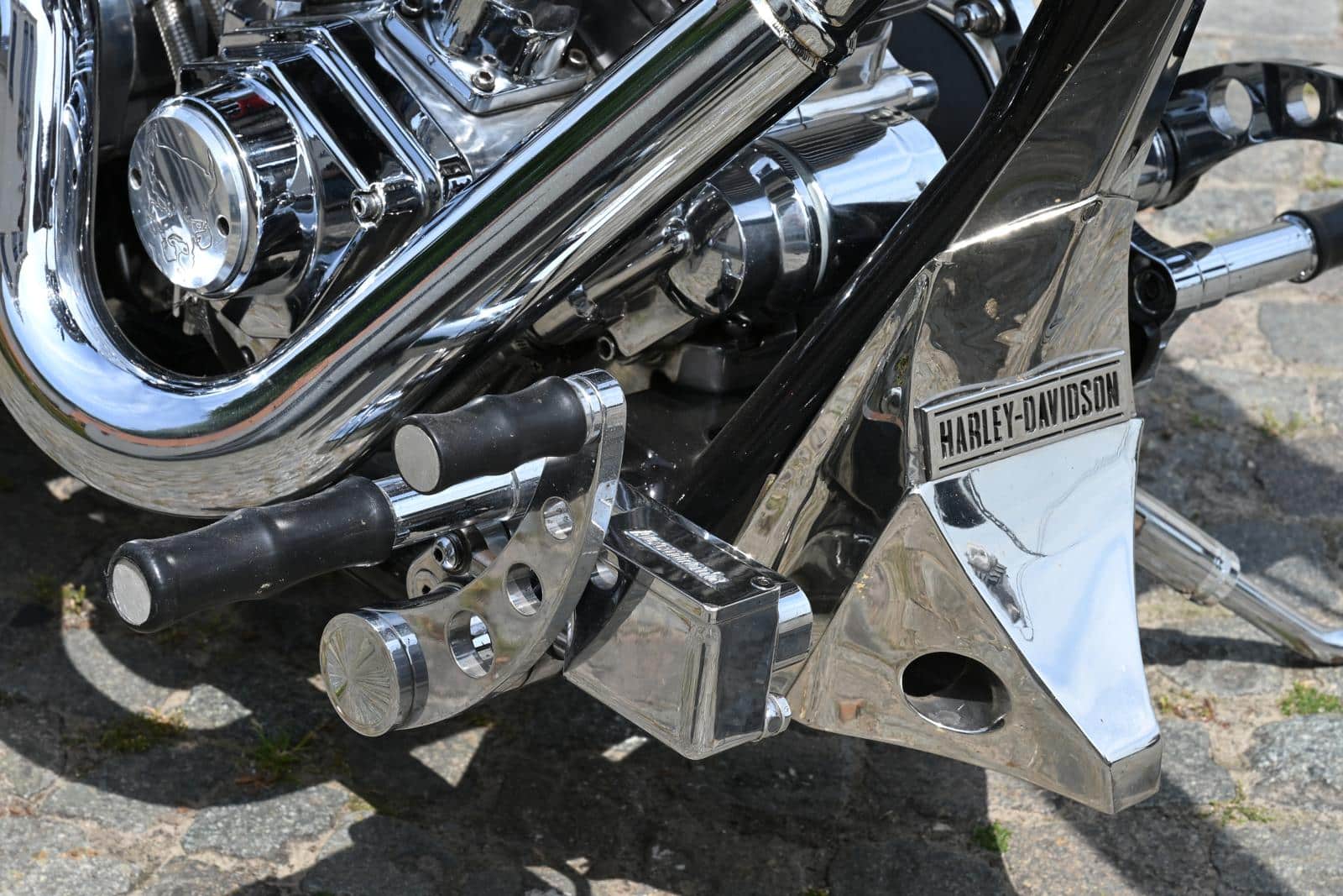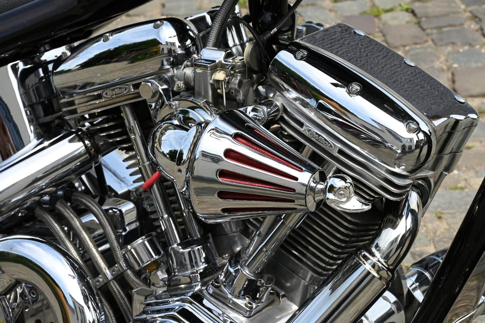 Met een blik op de motor vervolgd Kris: “De voorvork stond oorspronkelijk veel verder onderuit. Om er een echte highneck van te maken heb ik het frame 10 cm verhoogd. Voor de achterbrug heb ik een extra frame bijgekocht om te verslijpen. Ik heb heel wat ervaring met metaalconstructies en ben bijgevolg vertrouwd met lassen en machines bouwen. Tussendoor kon ik ook op de hulp van Barry van Motortechnica rekenen. Op zijn advies heb ik de meeste onderdelen, waaronder de reeds gemonteerde Mikuni, grondig gerestaureerd. Dat kan nooit kwaad. De luchtfilter is een bont allegaartje van acht samenraapsels, opgescharreld op een beursje hier en daar. De fraai naar beneden lopende uitlaten had Barry nog liggen van een gecrashte motor. Het merklogo was weggeschaafd en er was redelijk oplapwerk aan. Ze klonken behoorlijk stevig, maar met twee dempertjes erin luiden ze thans een stuk beschaafder. Ik kan ze nog beter dempen, maar het moet toch iets zijn, hé. Uiteindelijk is het een Harley. De oorspronkelijke Amerikaanse Ultima RSD rechtsgestuurde 6-versnellingsbak heeft Barry vervangen door een Zodiac revisiekit met vijf versnellingen. De machine sprong soms uit zijn derde versnelling en de nieuwe bak is sterker en compatibel met het krachtige 1800 cc motorblok. Het lijkt soms een woeste stier. Een inwendige check toonde aan dat de motor weinig interne slijtage had. De SAS Air suspension heb ik zelf gemonteerd en na wat experimenteren met de afstelling levert de machine het gewenste comfort aan de gehavende rug. Voor toeristische tripjes heb ik overigens nog een Road Glide in de garage.”